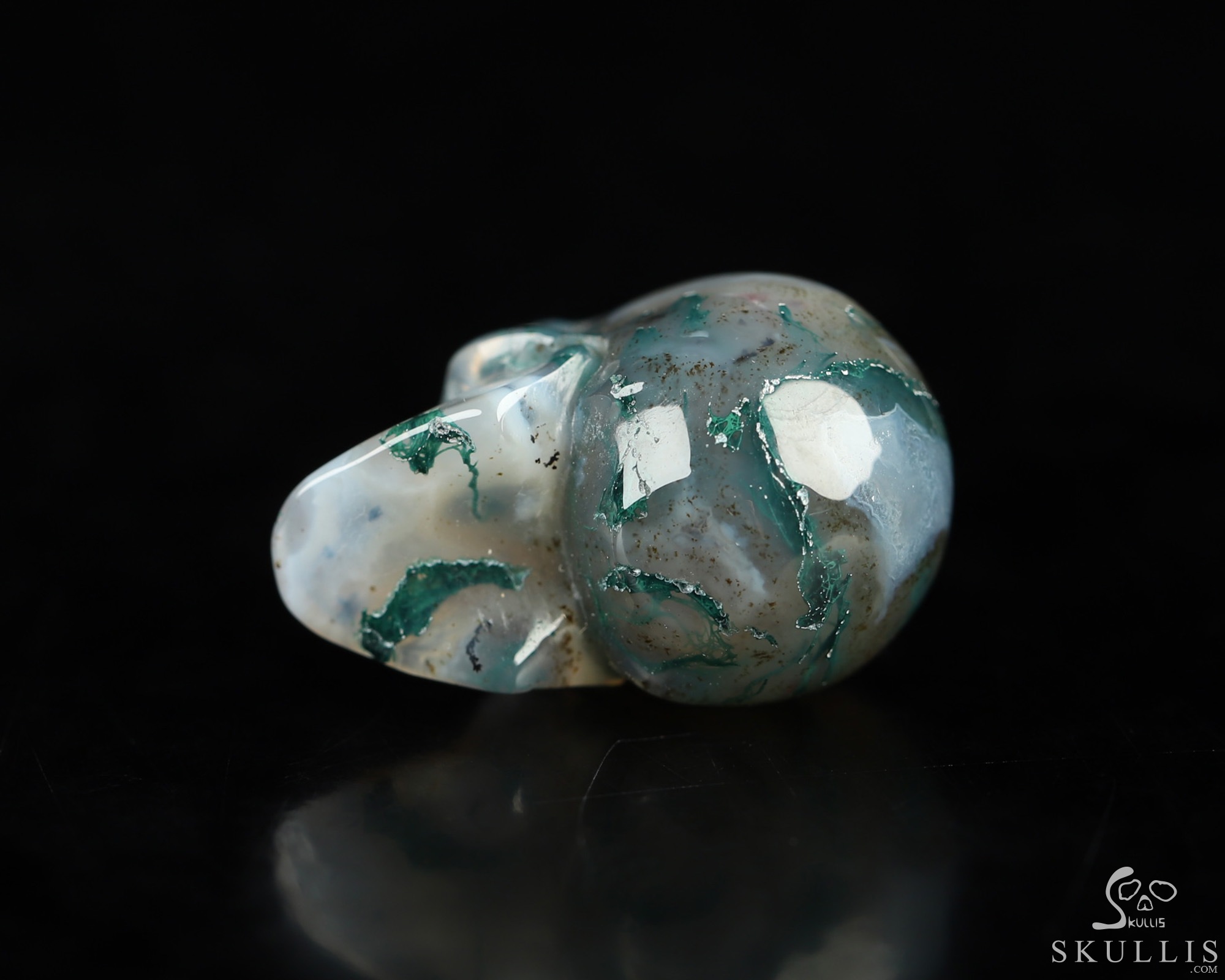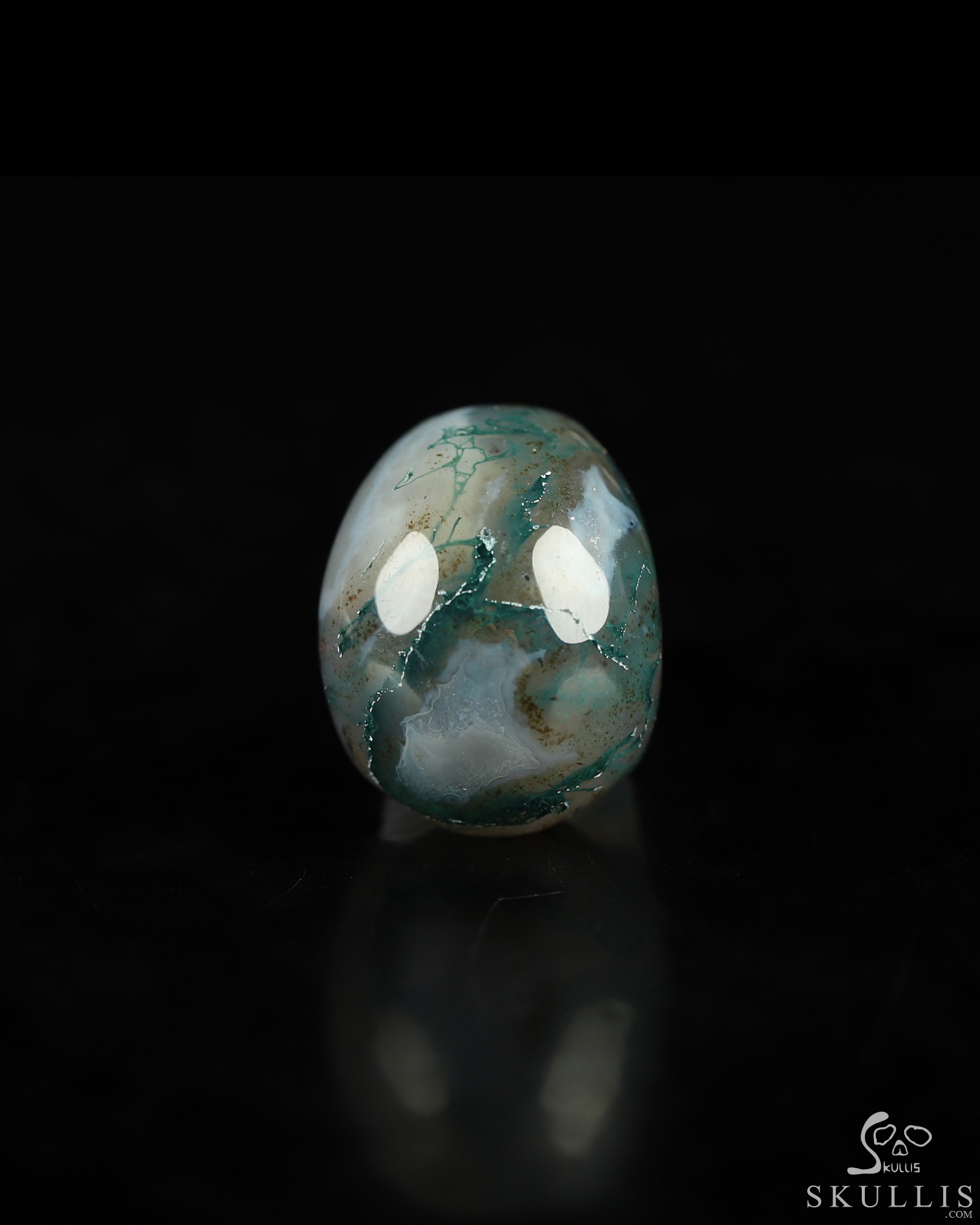 You are looking at a Green Moss Agate skull. The skull is 0.9 inches from front to back.