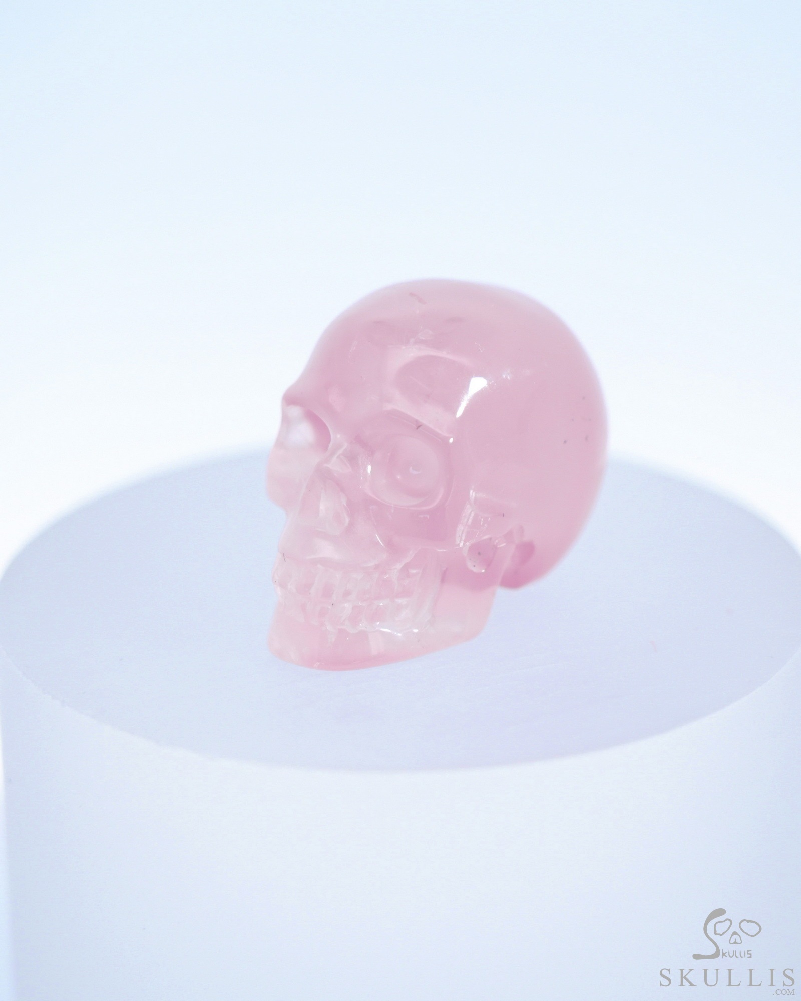 You are looking at a Rose Quartz skull. The skull is 1.1 inches from front to back.