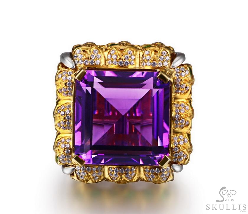 Amethyst with Diamond and Tsavorite Gold Plated Sterling Silver Skulls Ring - Skullis Exclusive Amethyst & 925 Sterling Silver Carved Crystal Skull