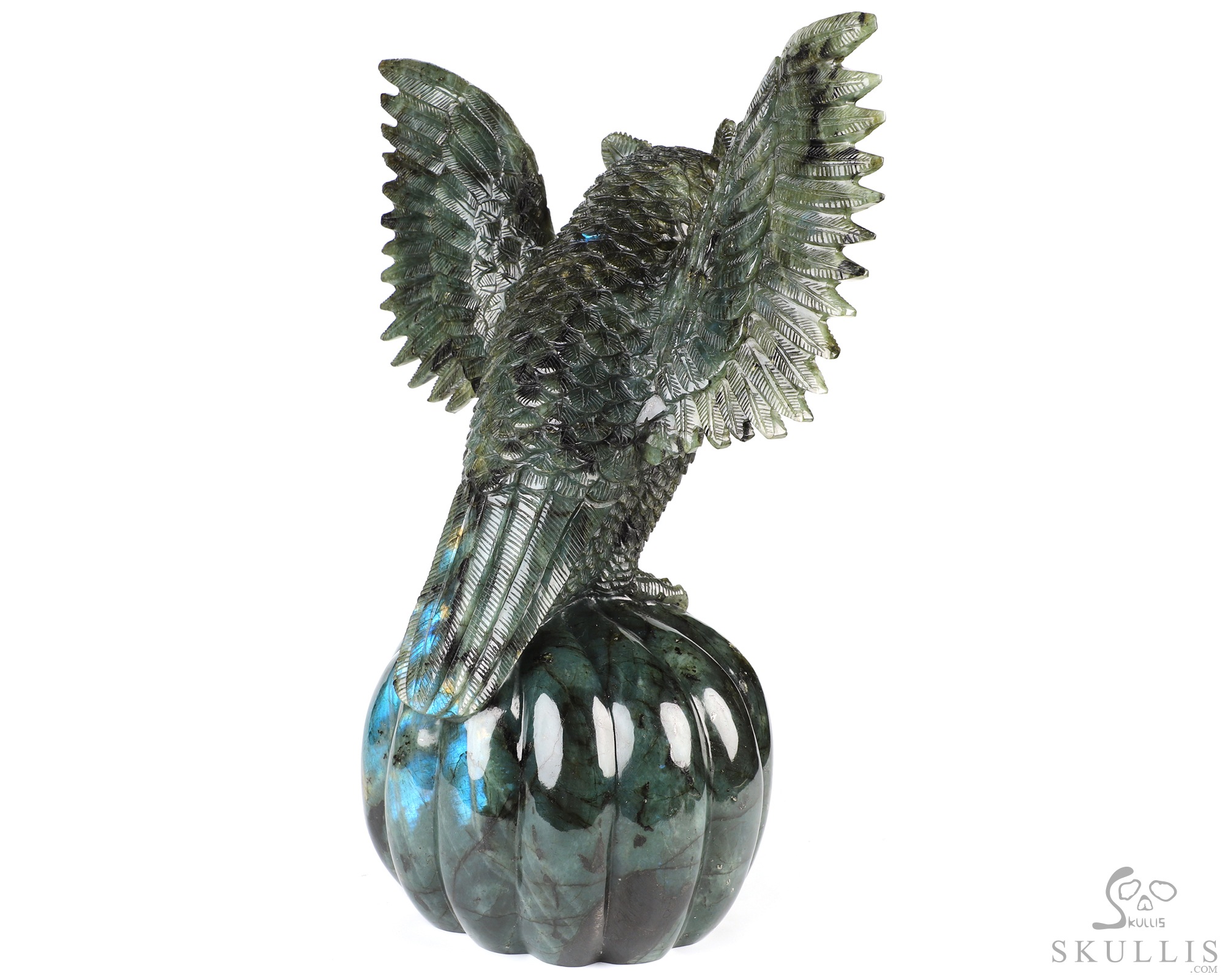 13.4" Labradorite Hand Carved Crystal Skull and Owl Fine Art Sculpture, Crystal Healing
