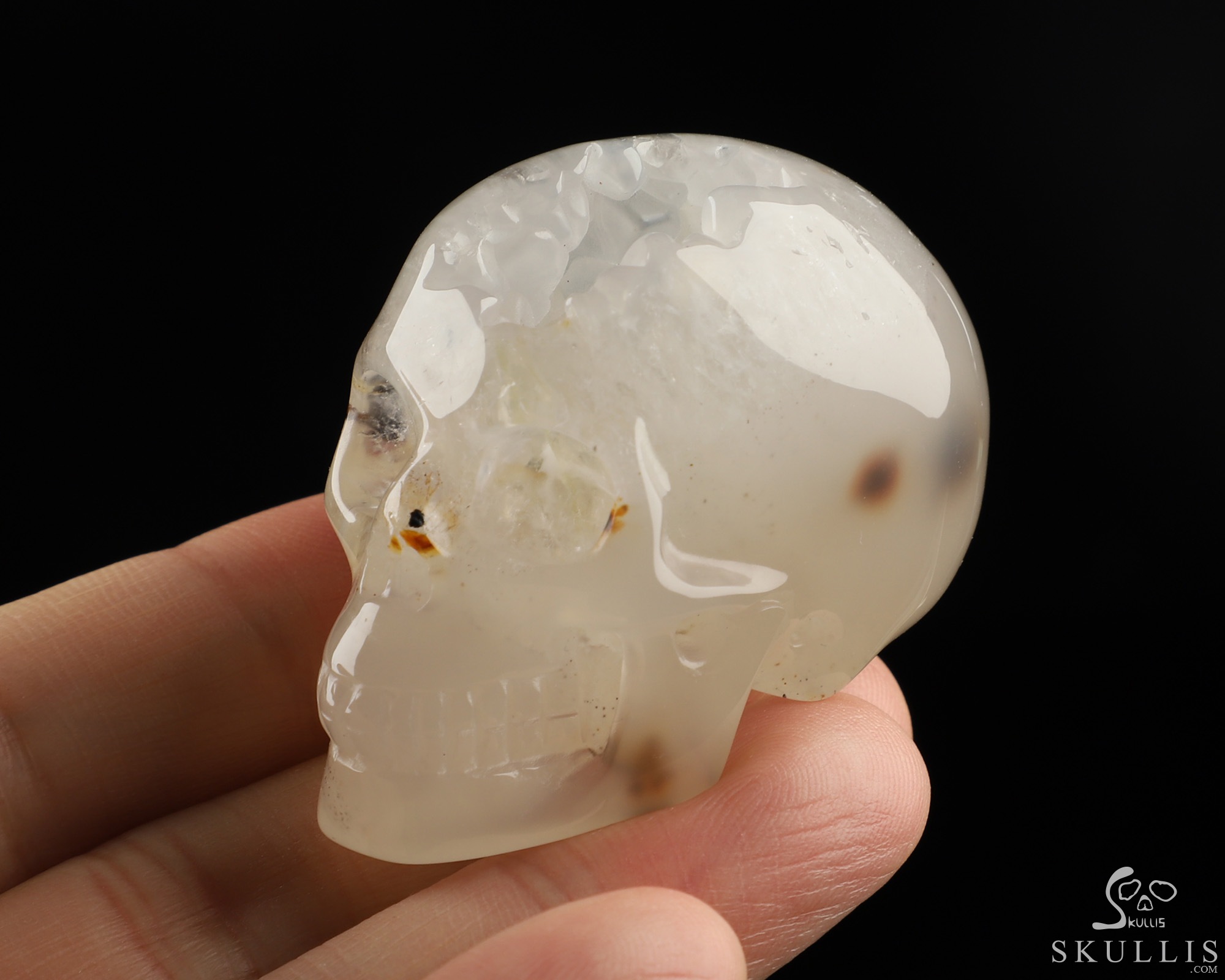 You are looking at a Agate Geode skull. The skull is 2 inches from front to back.