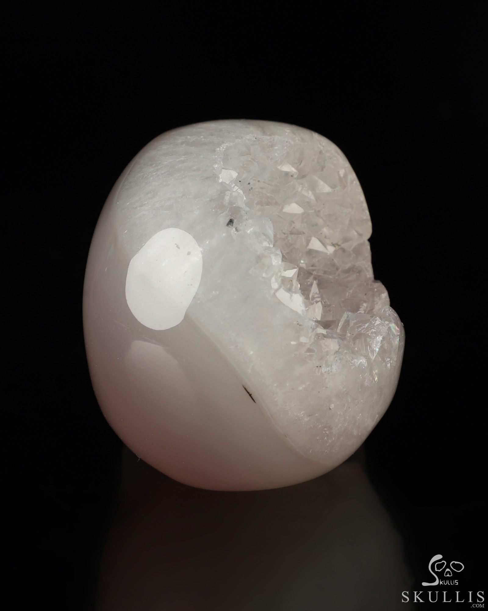 You are looking at an Agate Geode skull. The skull is 2 inches from front to back.