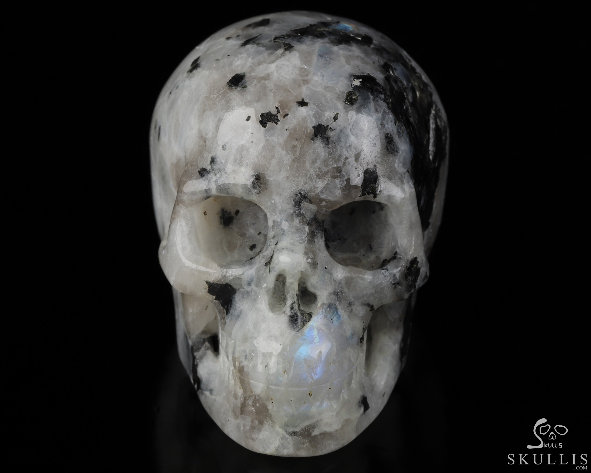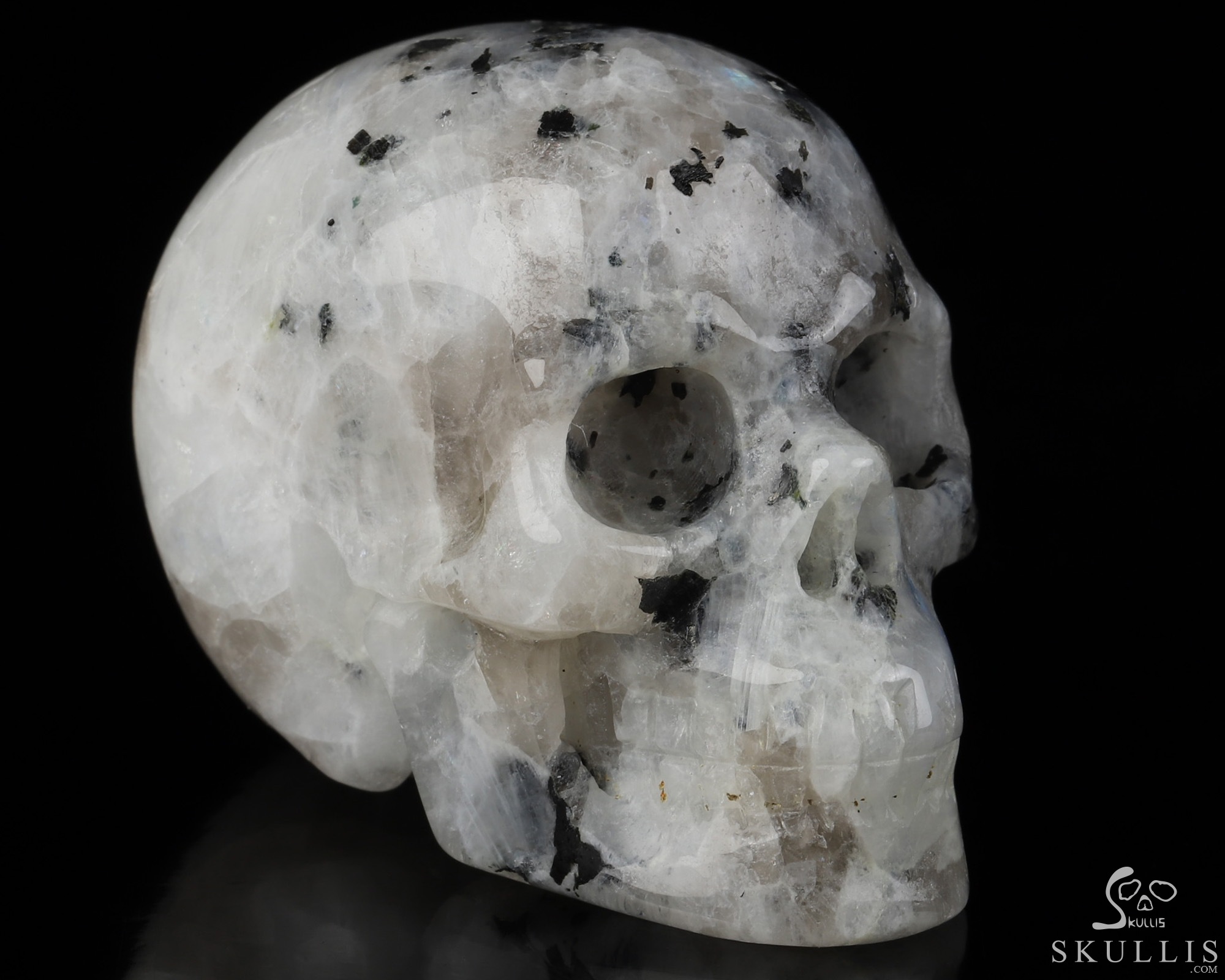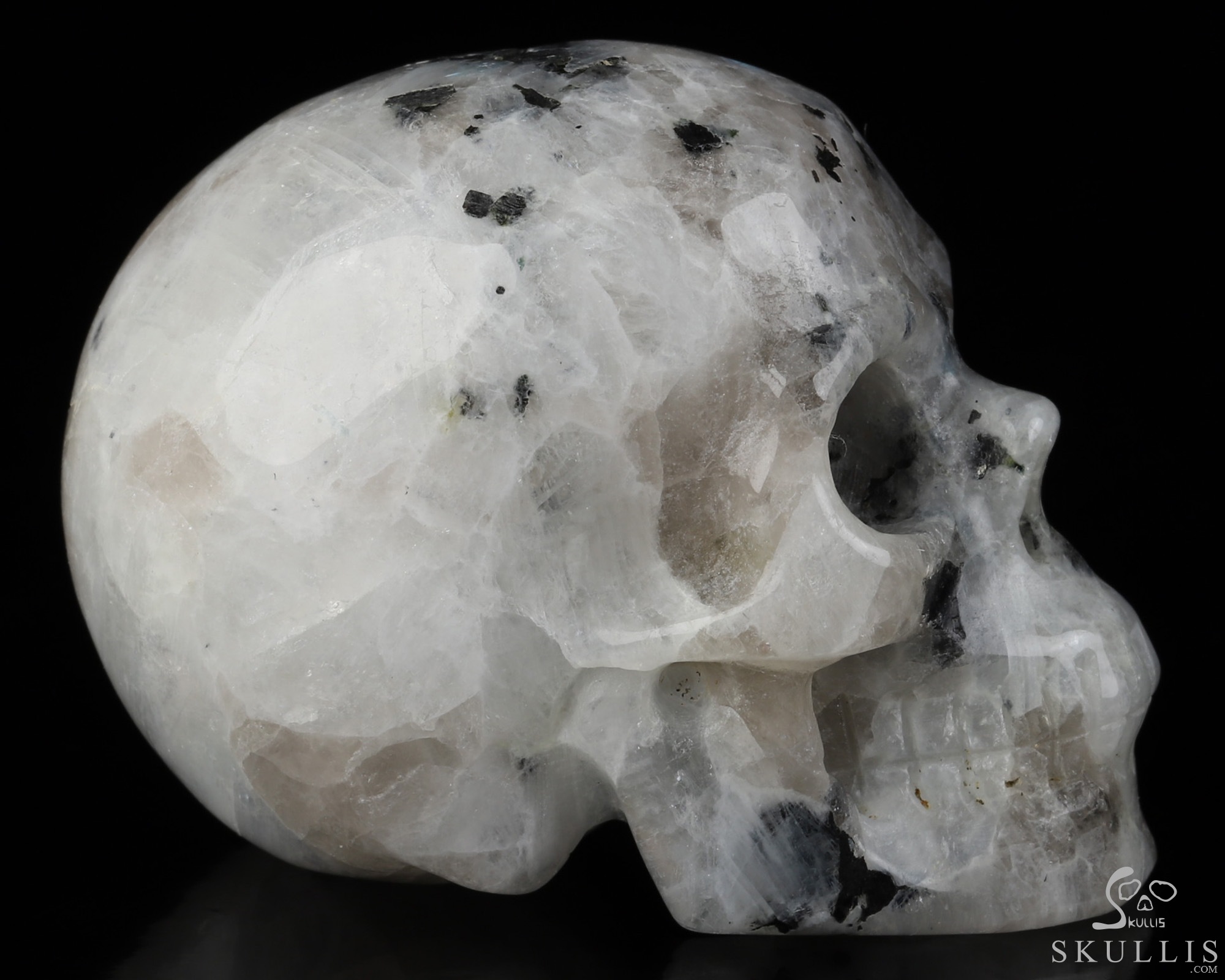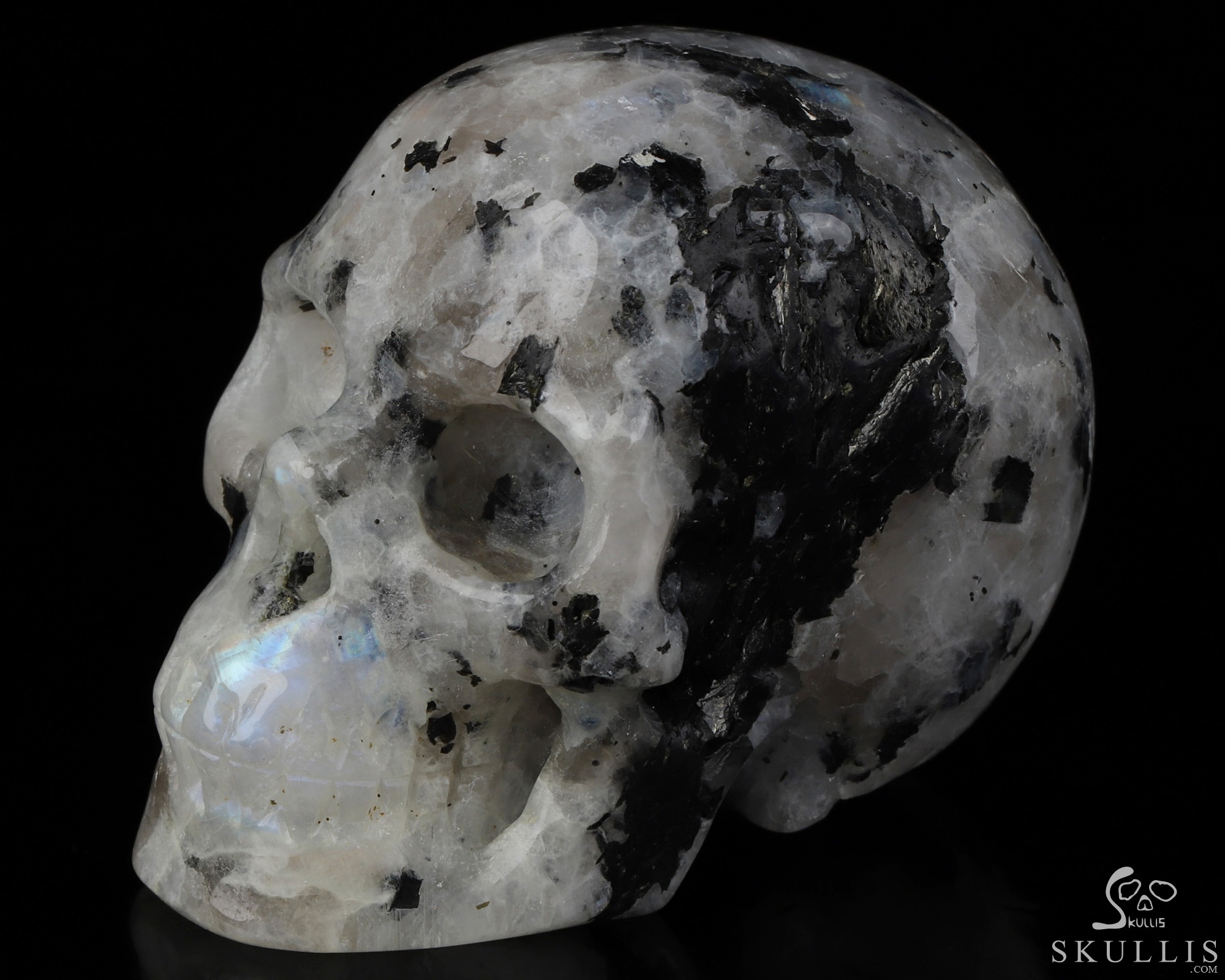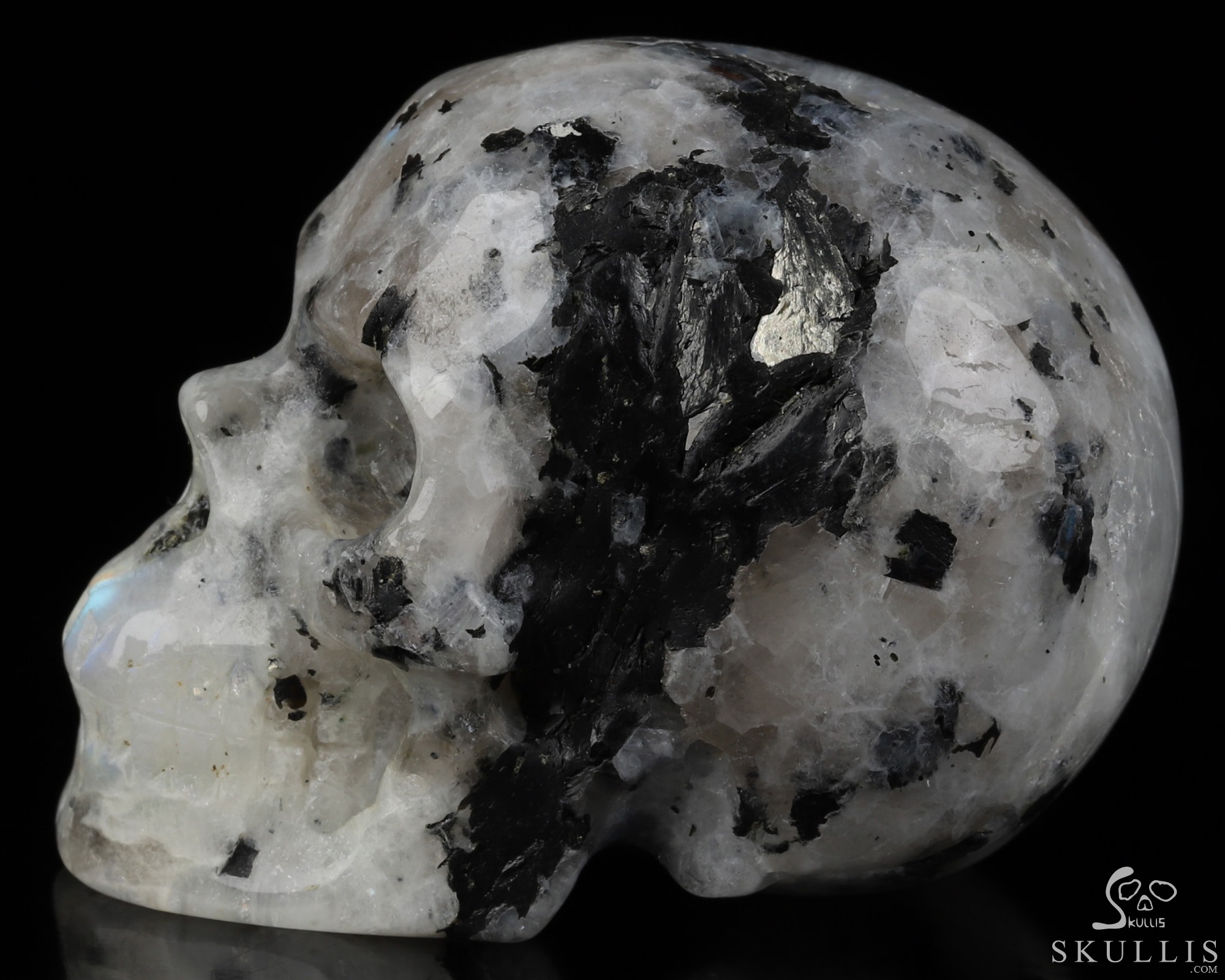 2.8" Black Tourmaline and Moonstone Hand Carved Crystal Skull Fine Art Sculpture, Crystal Healing