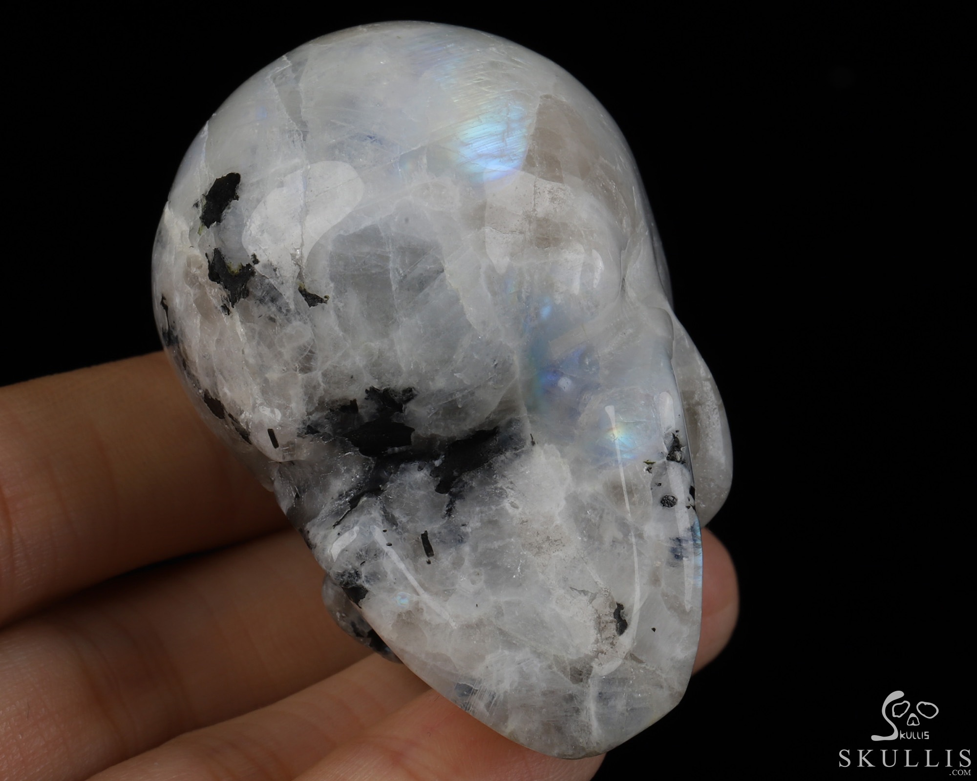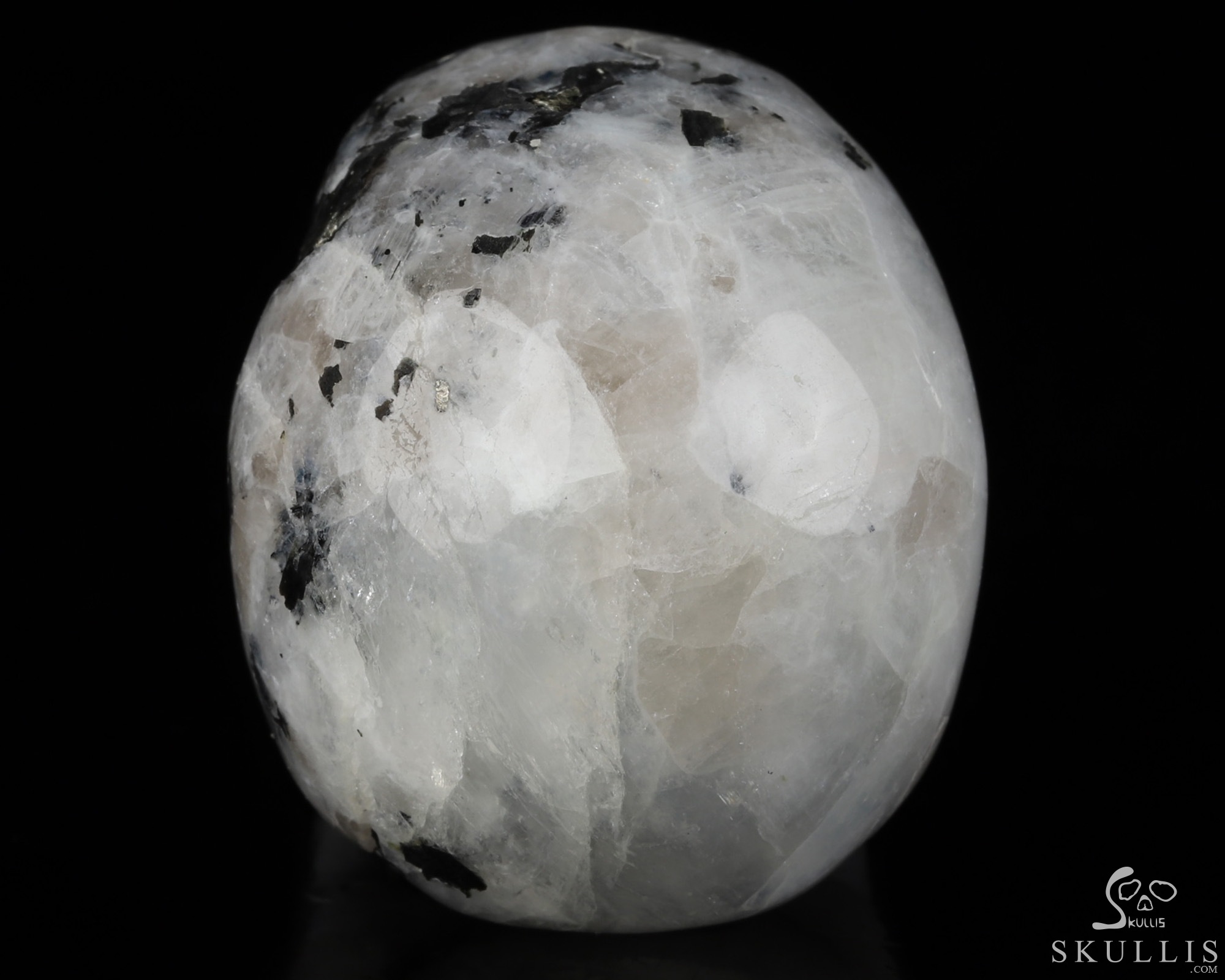 You are looking at a Black Tourmaline and Moonstone skull. The skull is 2 inches from front to back.