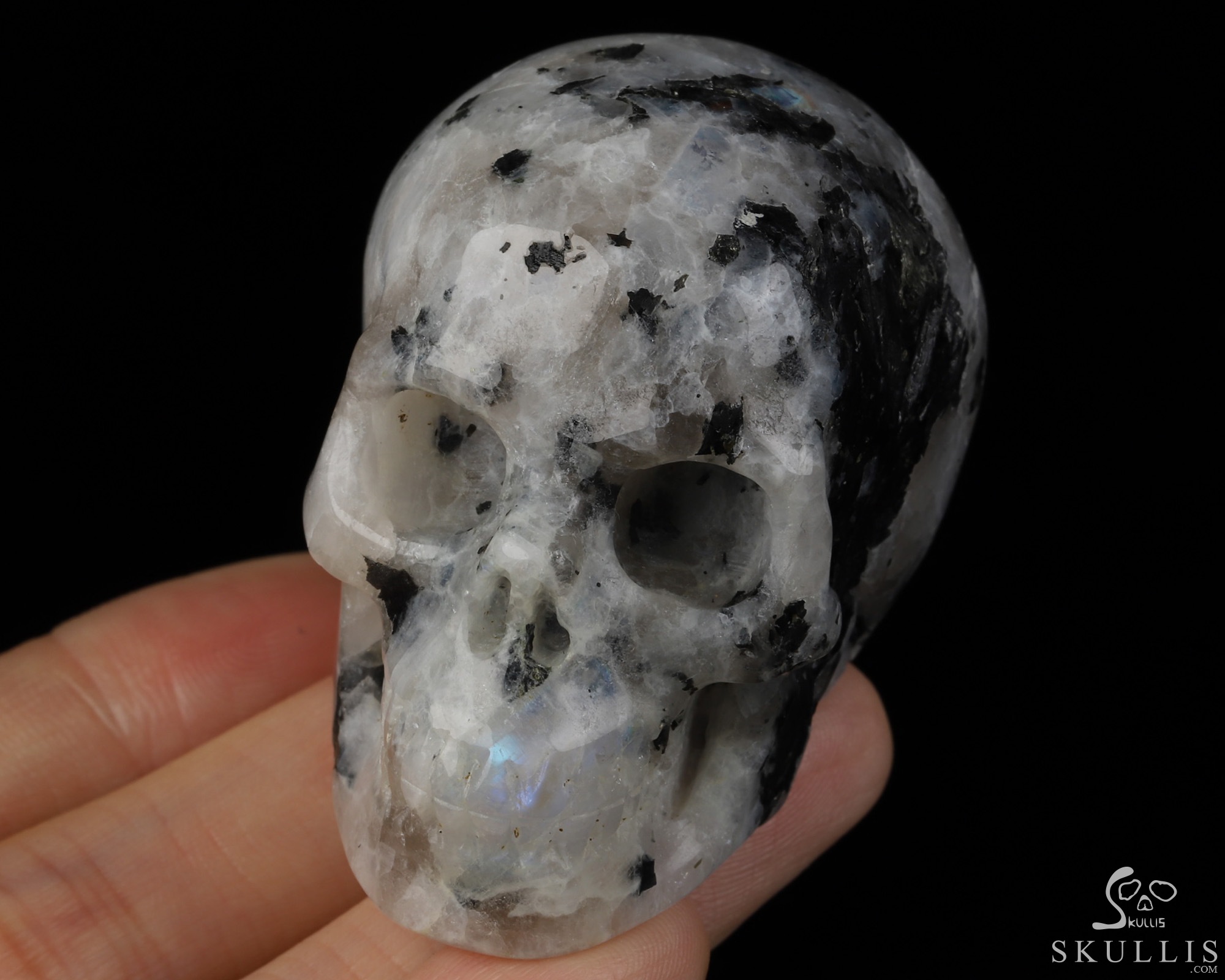 2.0" Black Tourmaline and Moonstone Hand Carved Crystal Skull, Realistic, Crystal Healing