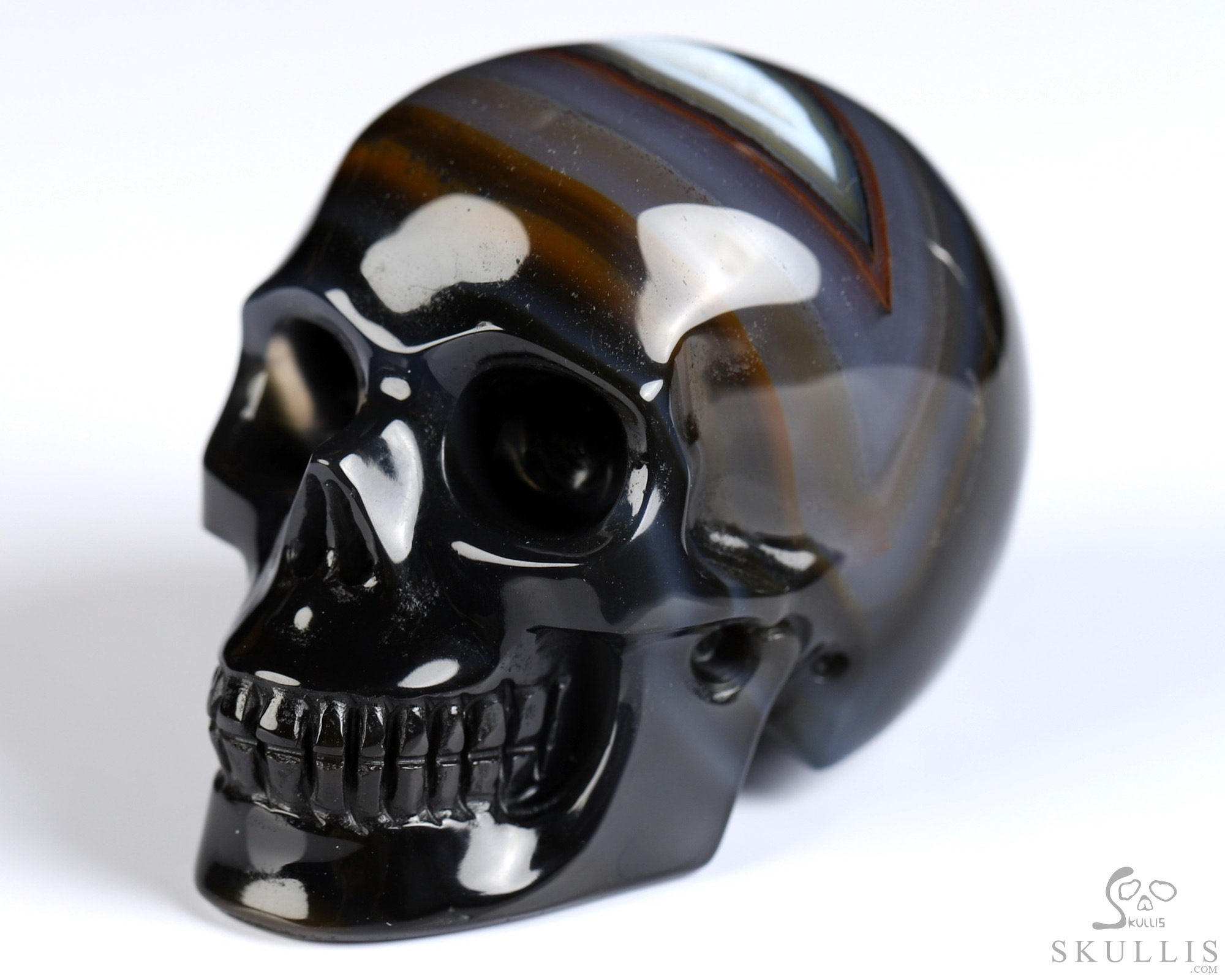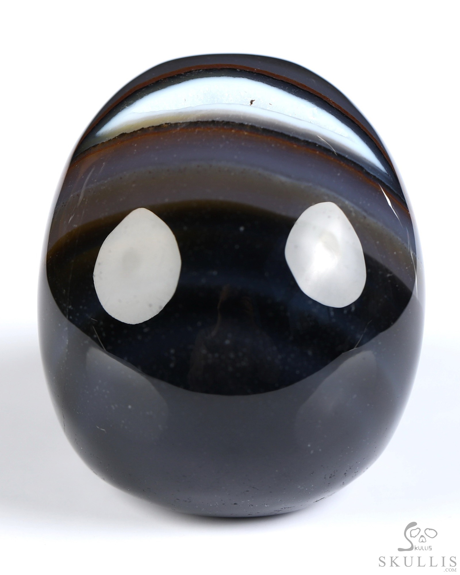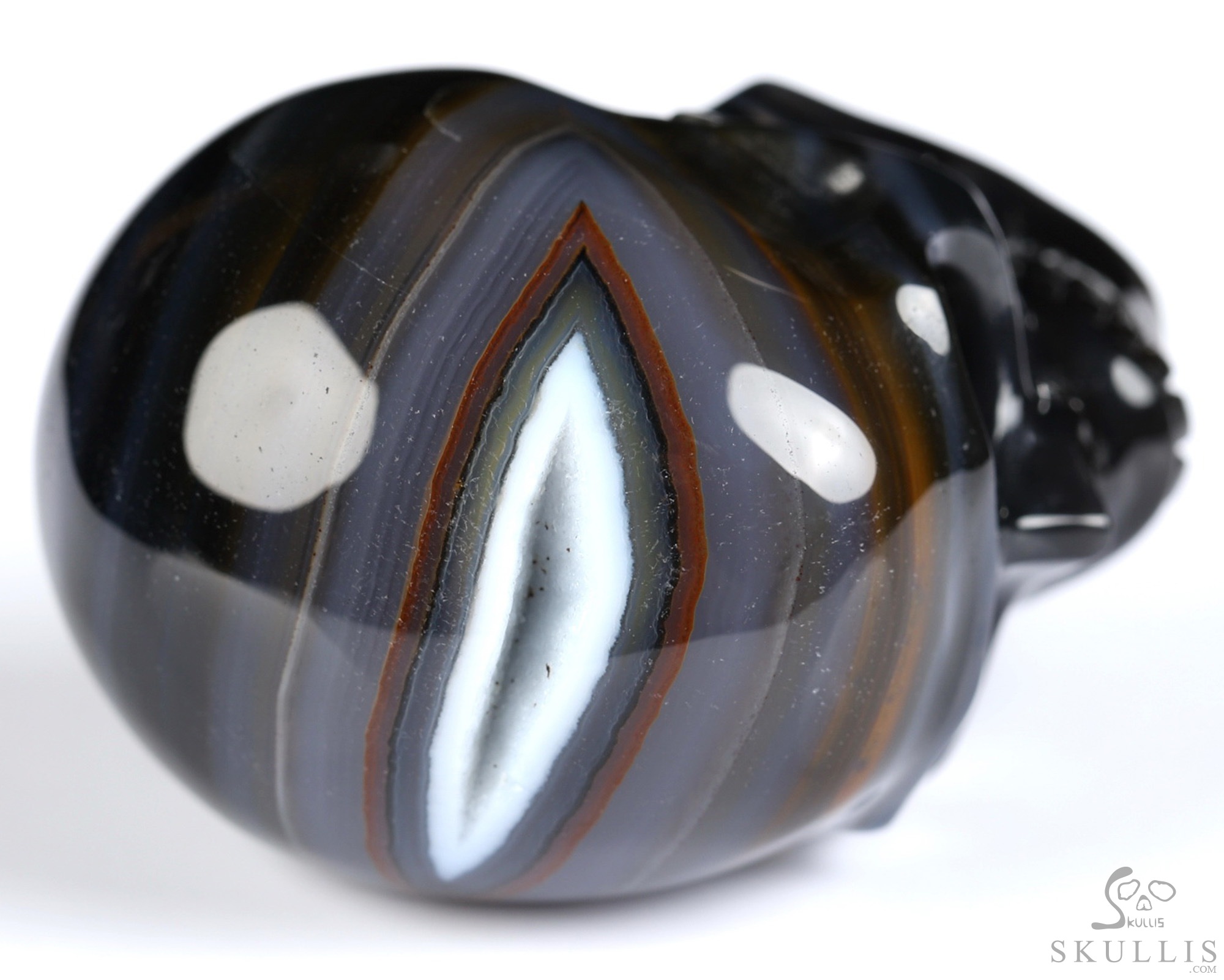 You are looking at a Black Zebra Agate skull. The skull is 2 inches from front to back.