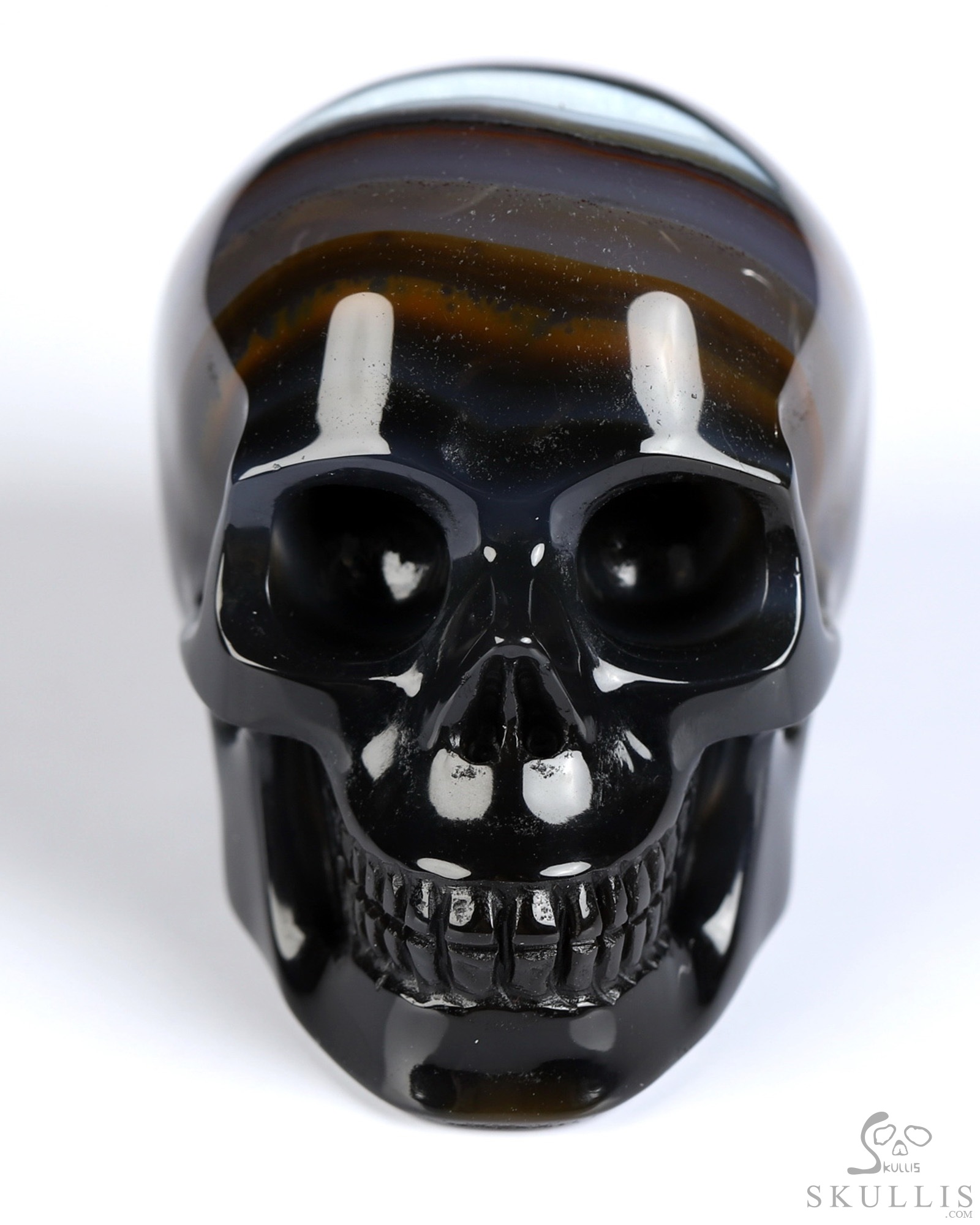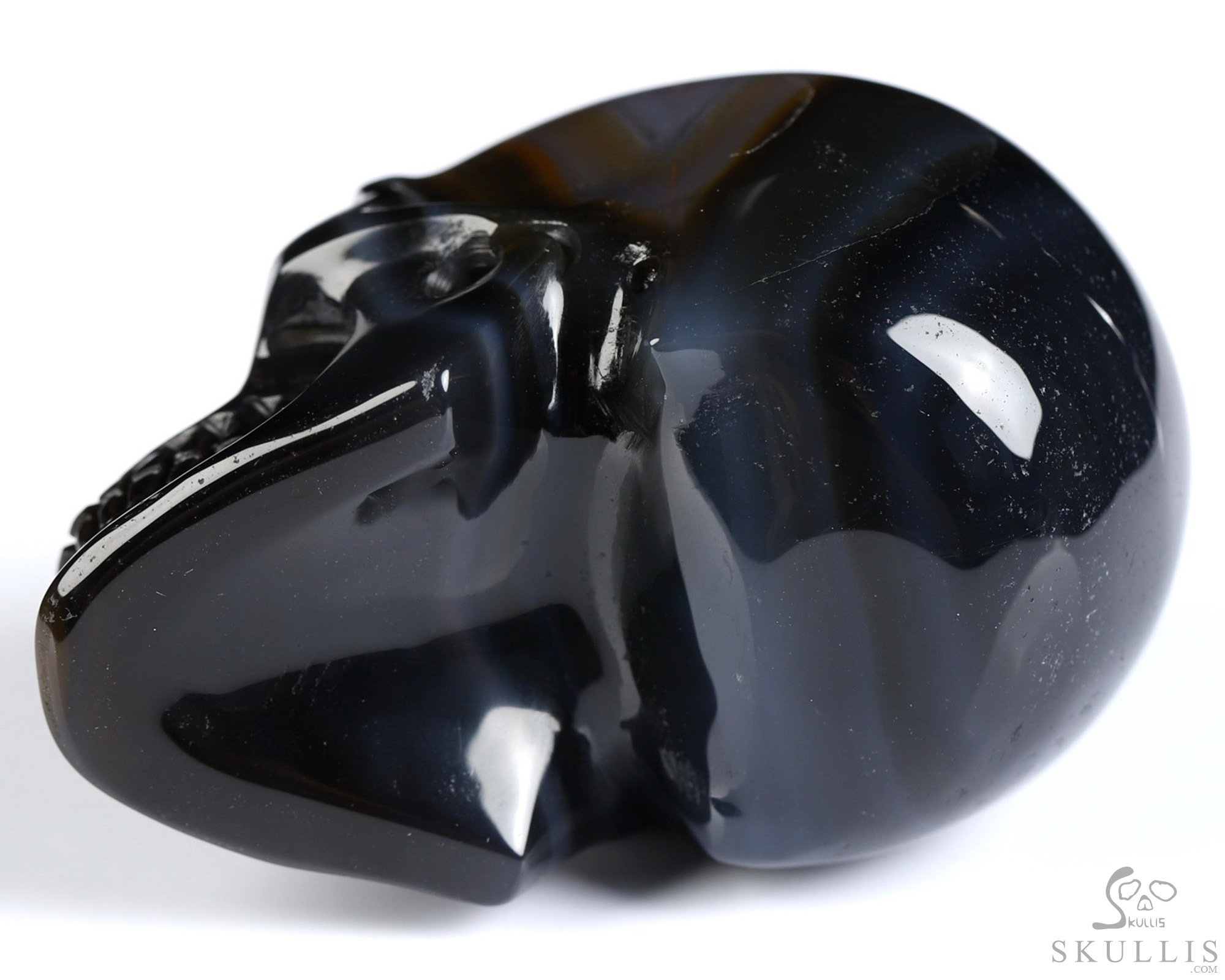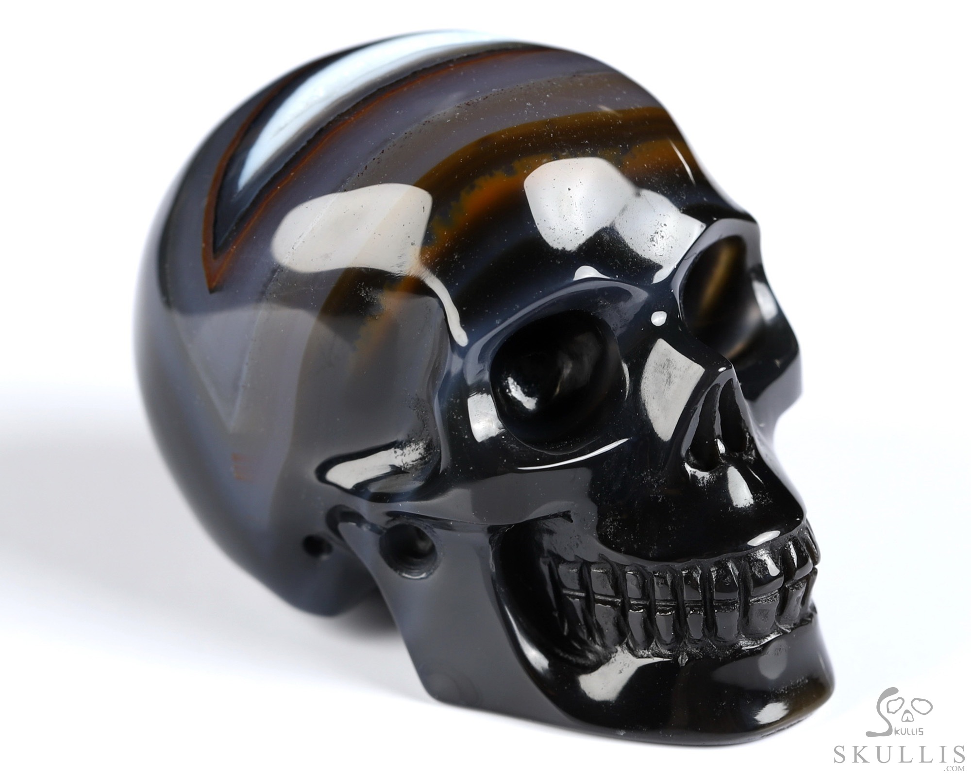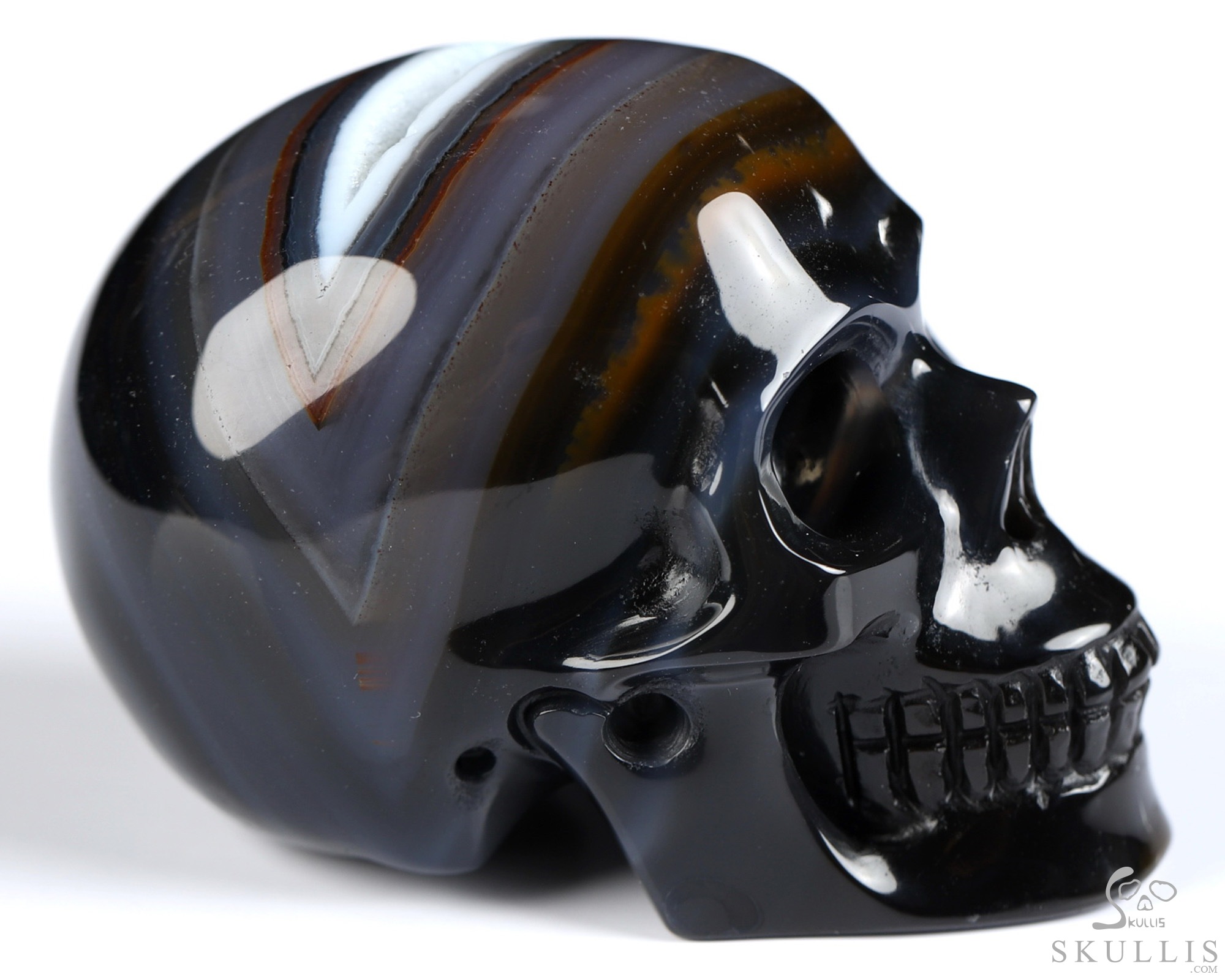 You are looking at a Black Zebra Agate skull. The skull is 2 inches from front to back.