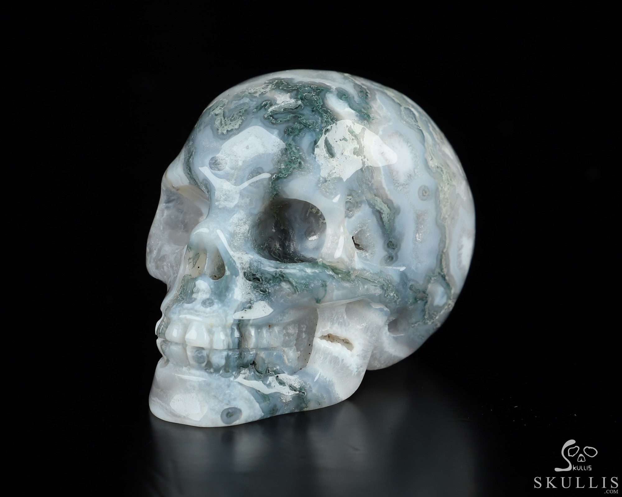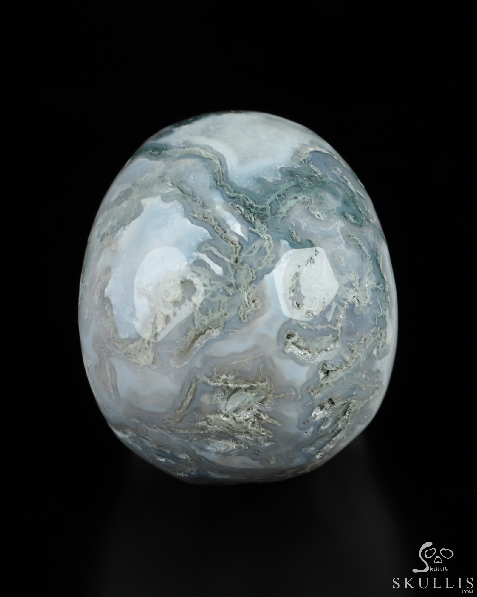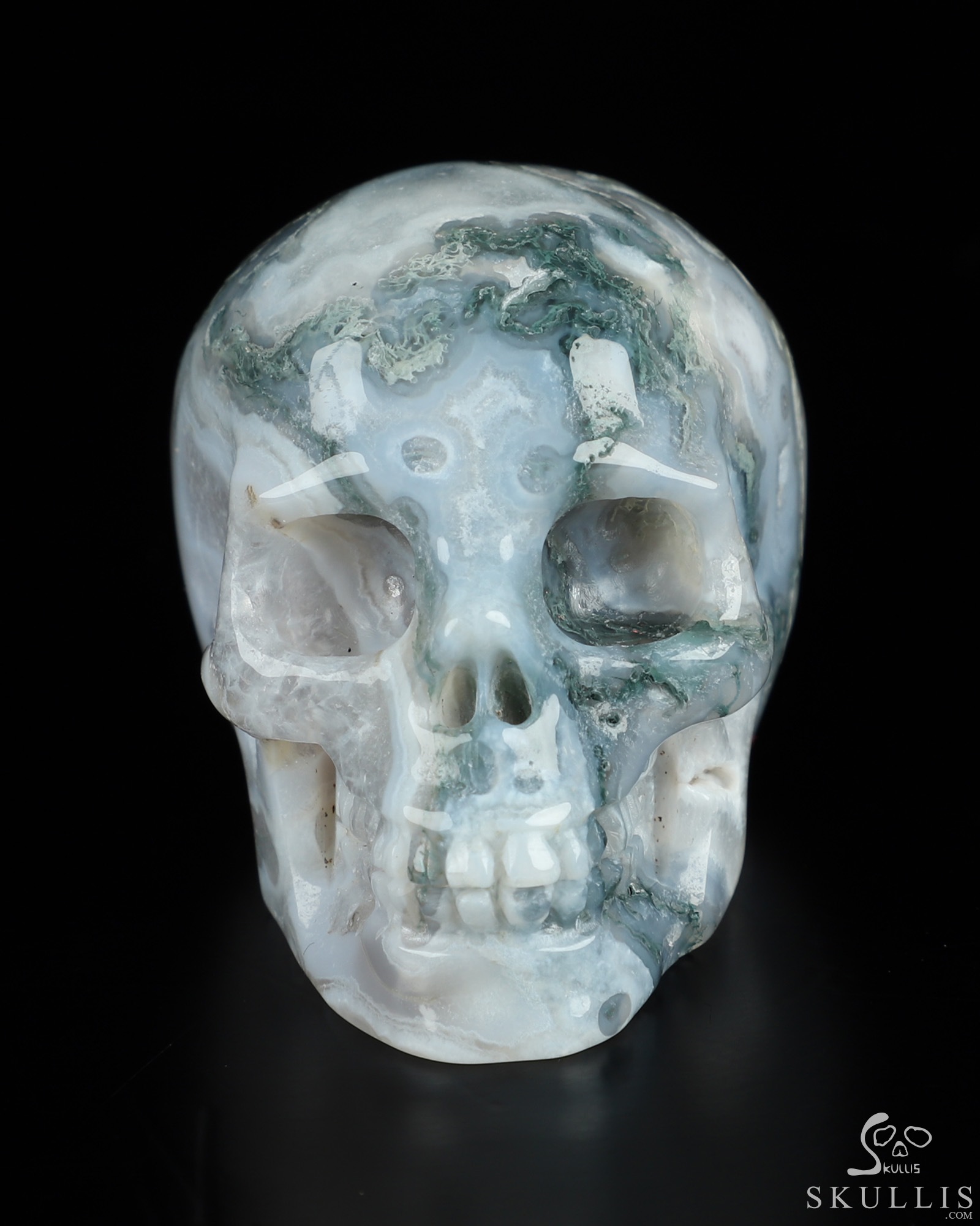 You are looking at a Green Moss Agate skull. The skull is 2 inches from front to back.