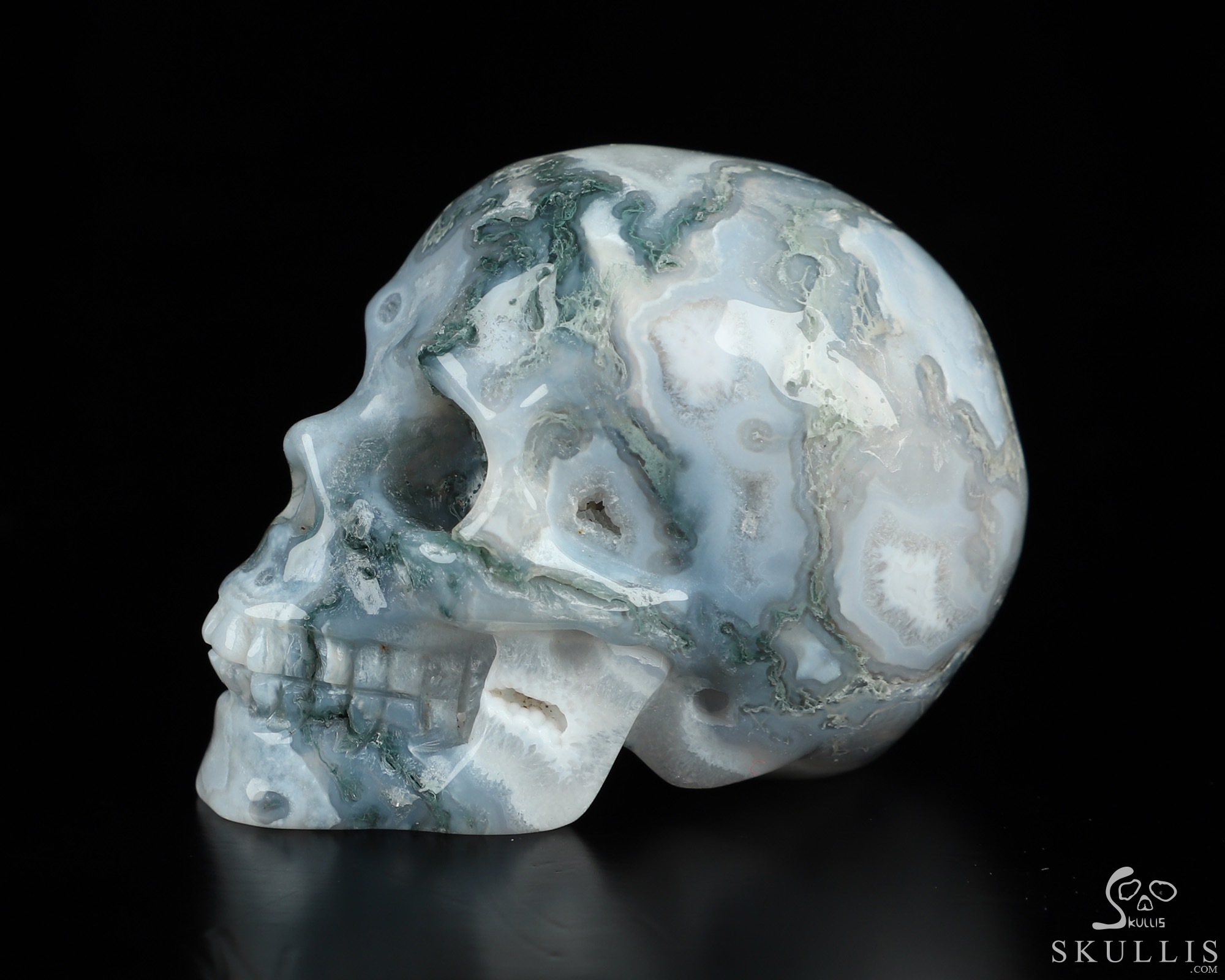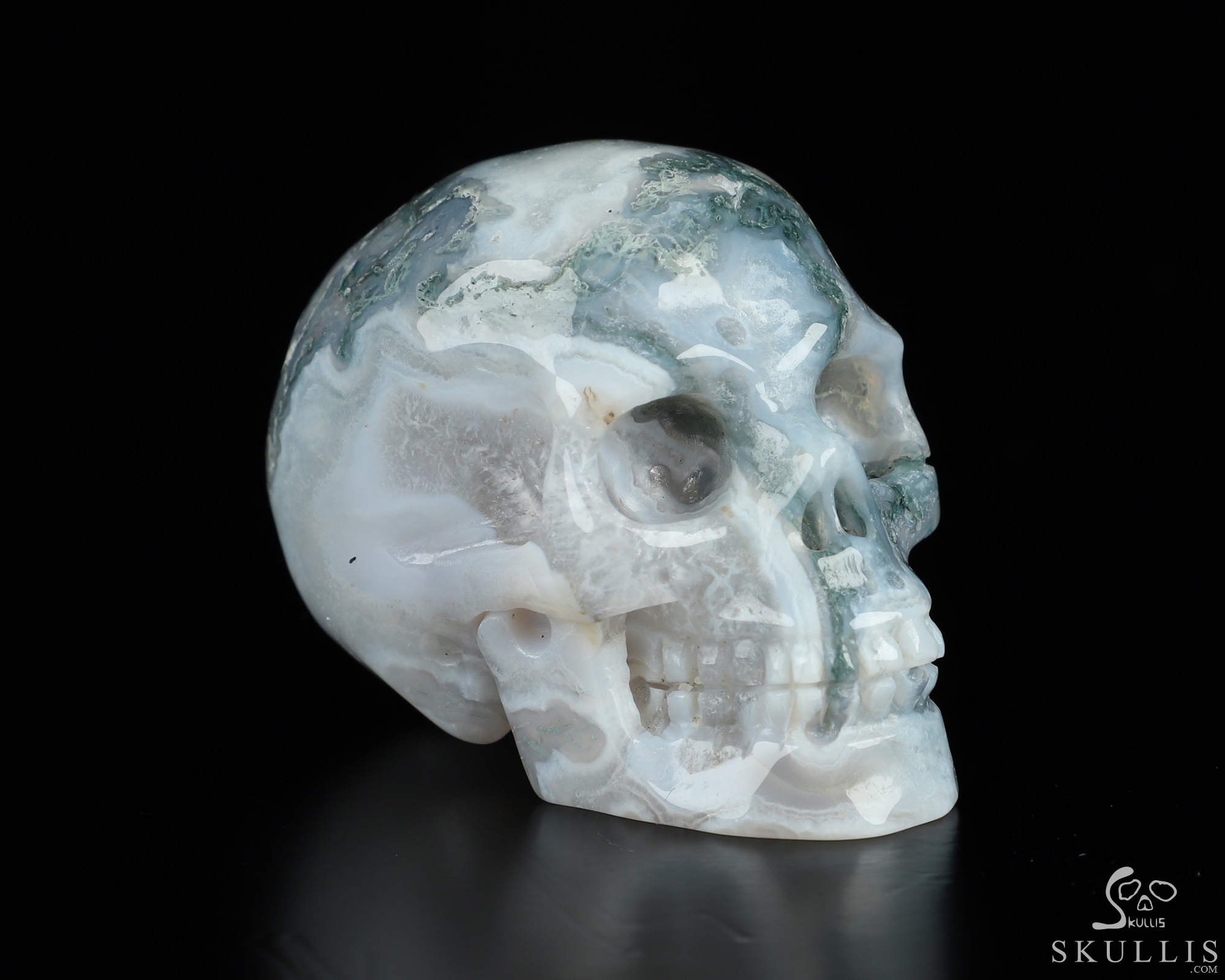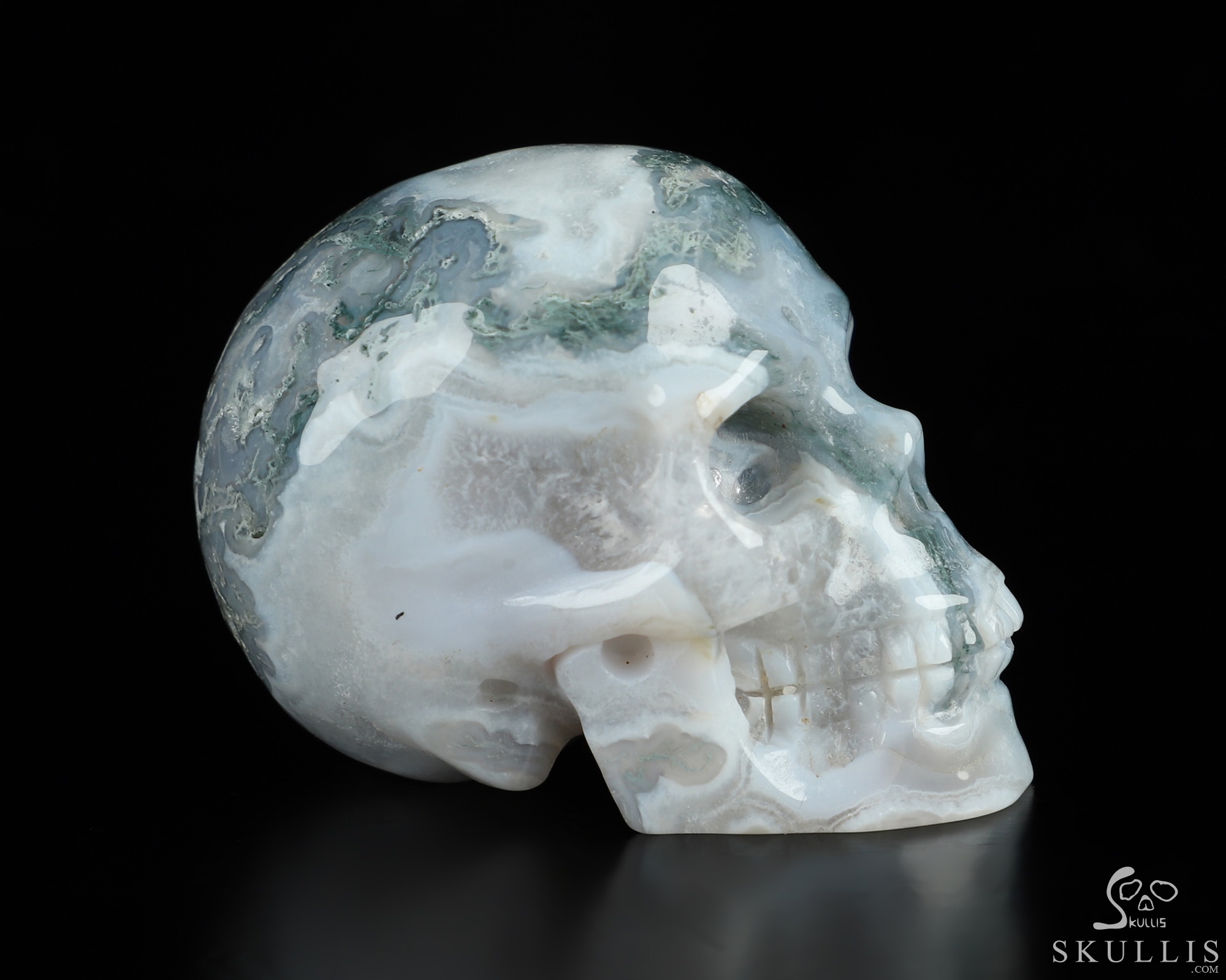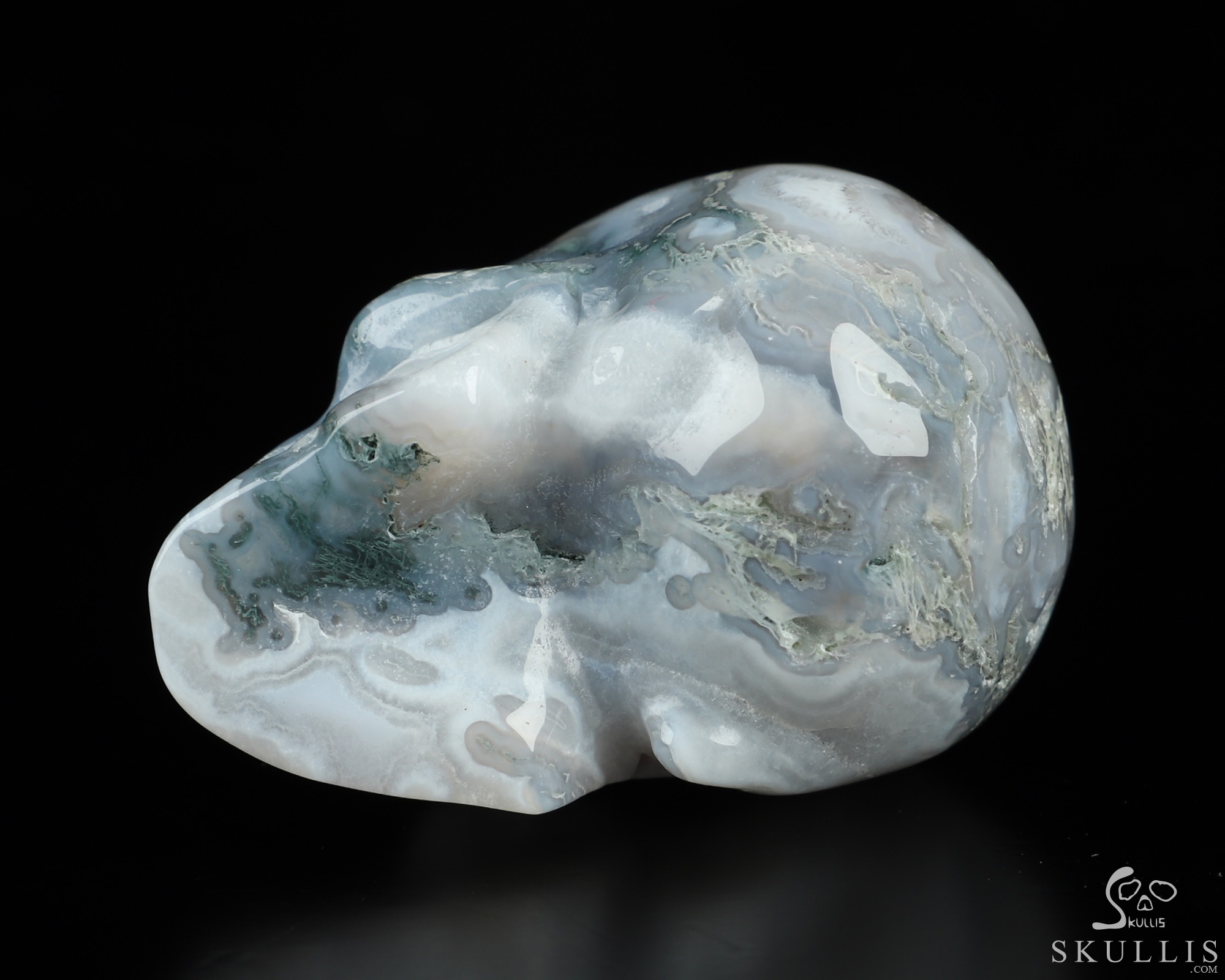 You are looking at a Green Moss Agate skull. The skull is 2 inches from front to back.