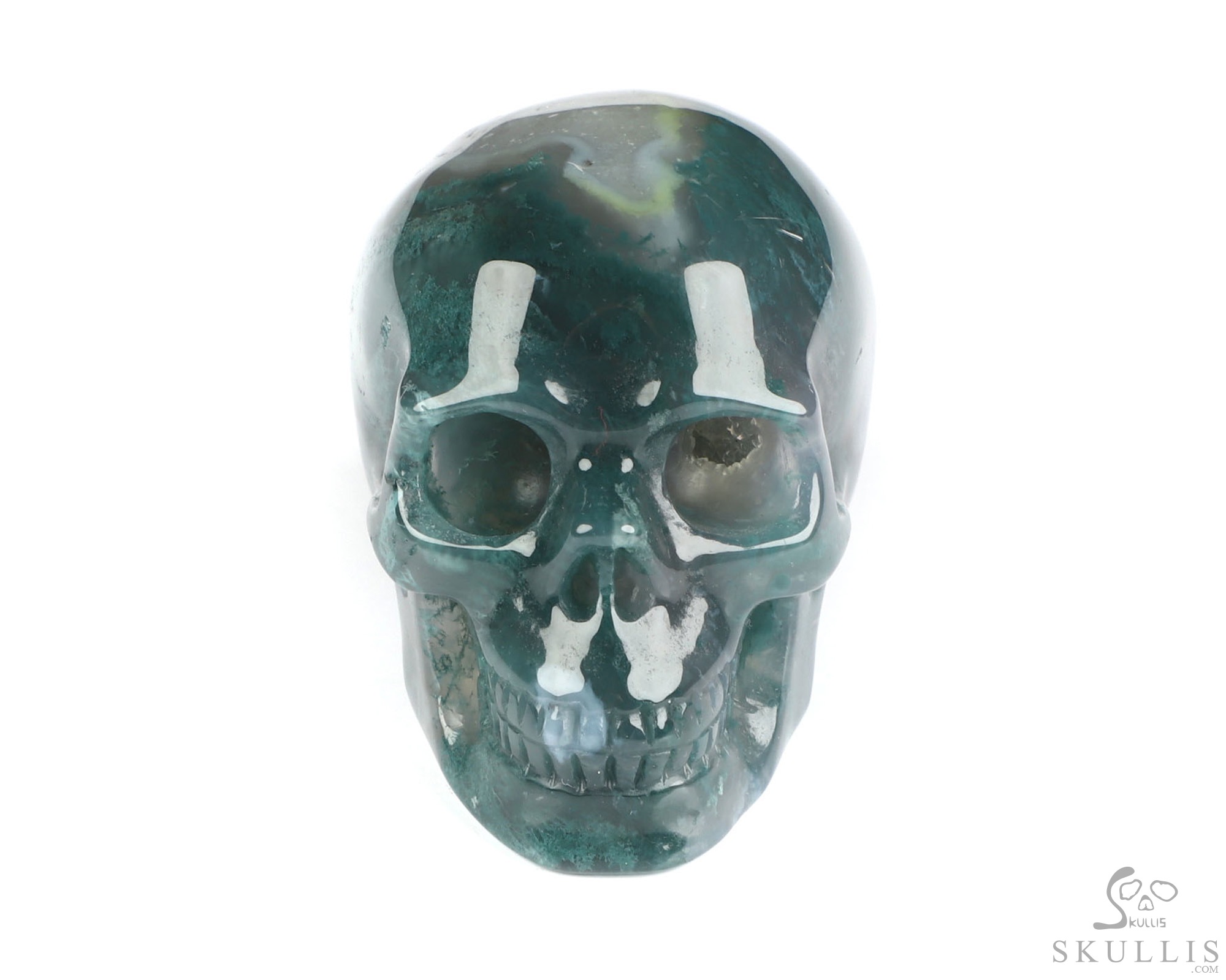 GEODE Huge 5.1" Green Moss Agate Carved Crystal Skull,Super Realistic, Crystal Healing