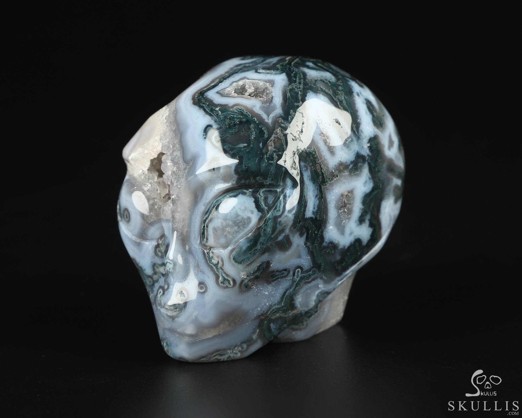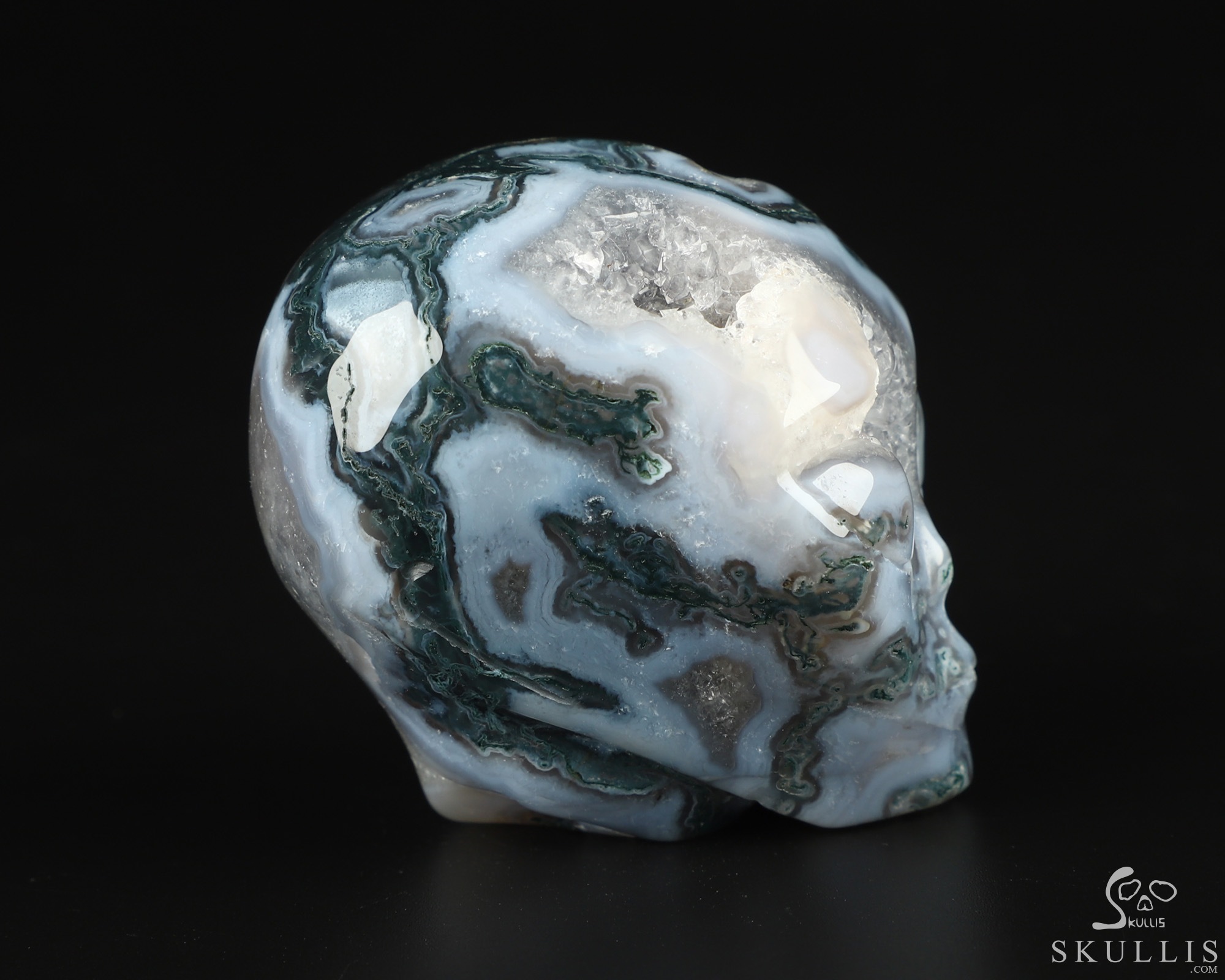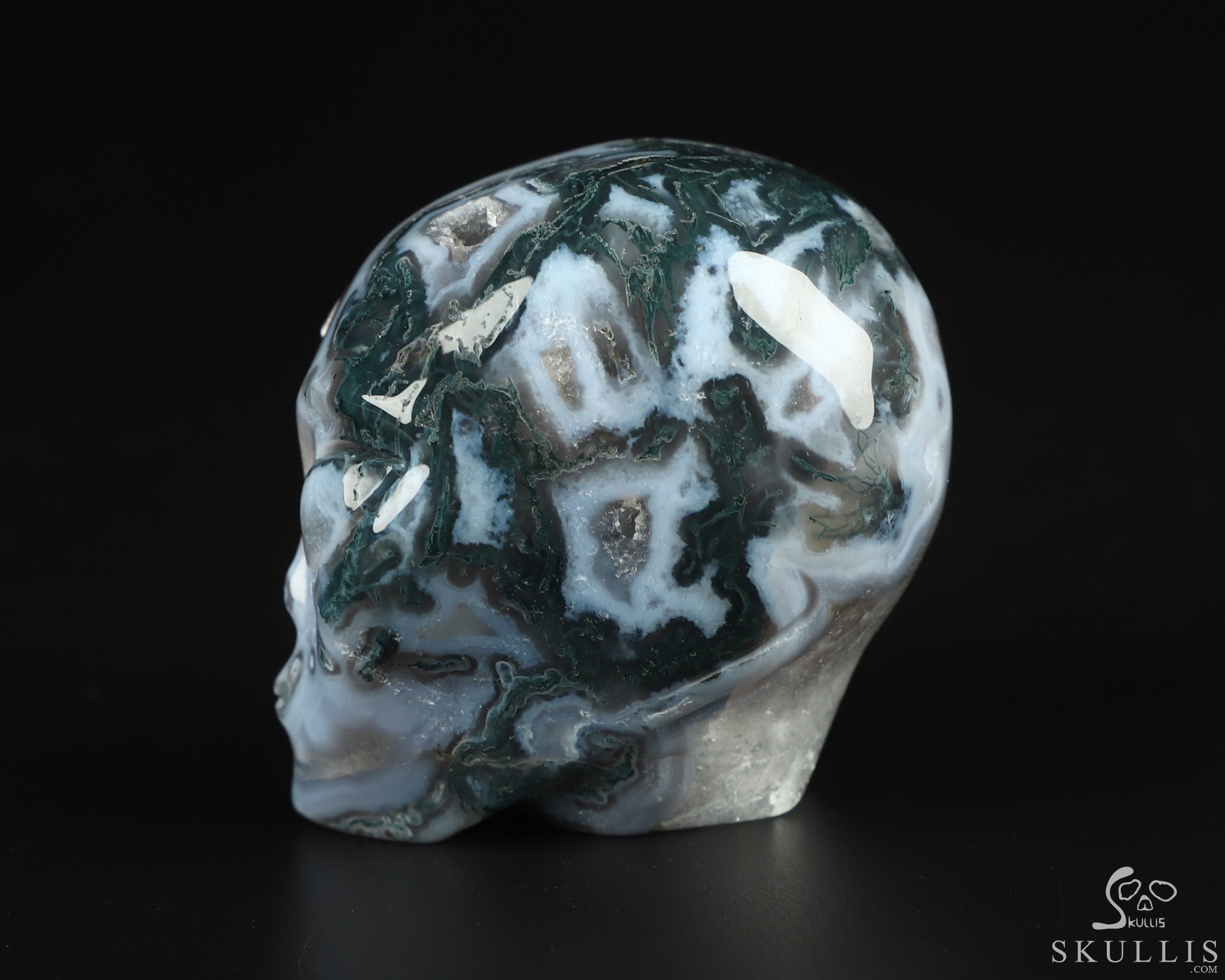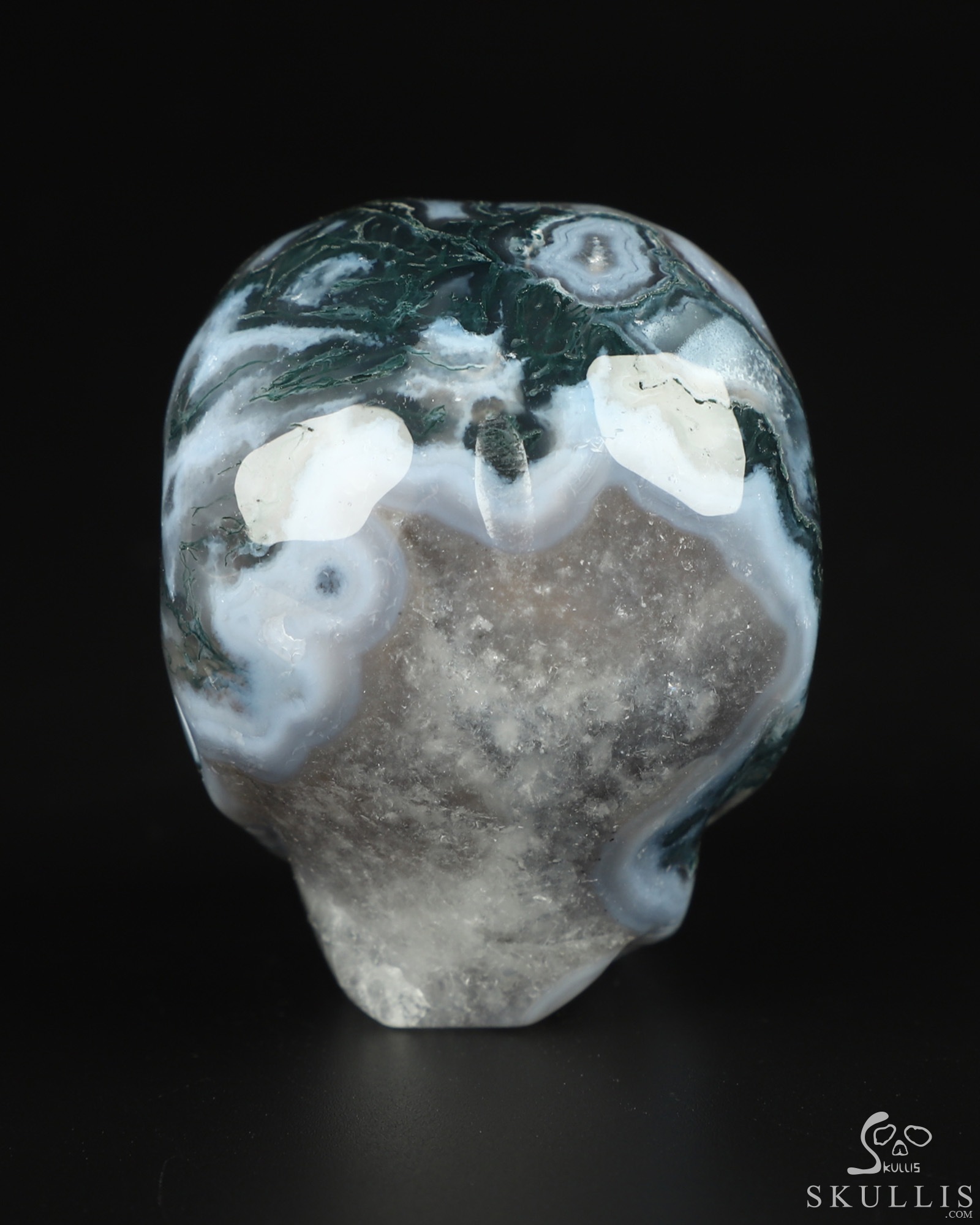 You are looking at a Green Moss Agate skull. The skull is 2 inches from front to back.