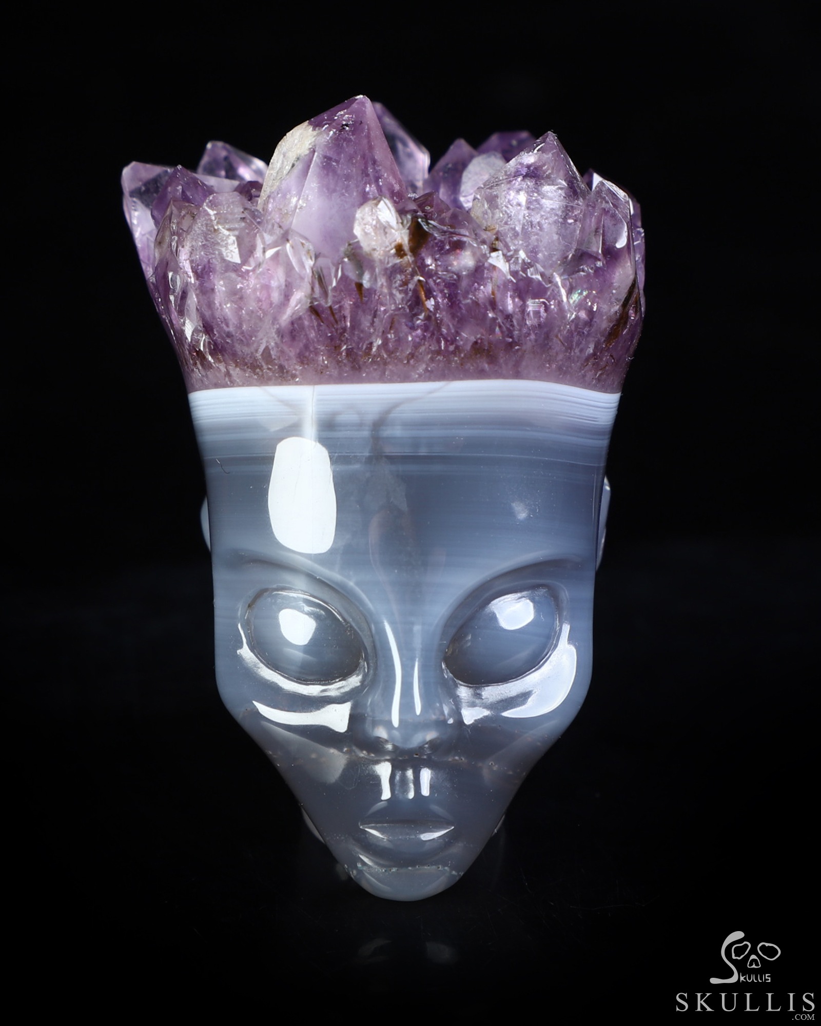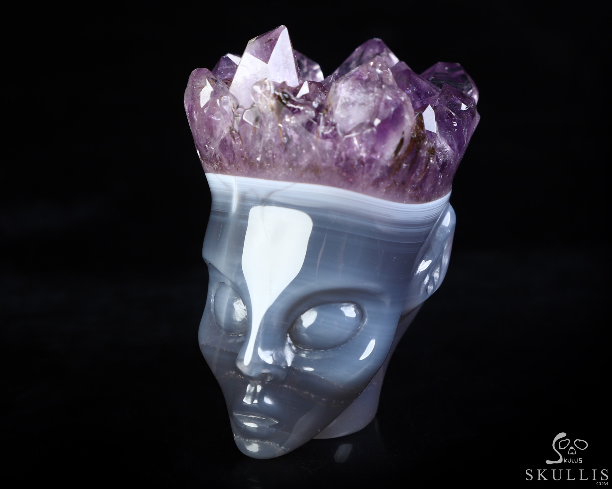 2.1" Agate Amethyst Druse Hand Carved Fairy Elf Alien Crystal Skull Fine Art Sculpture, Crystal Healing