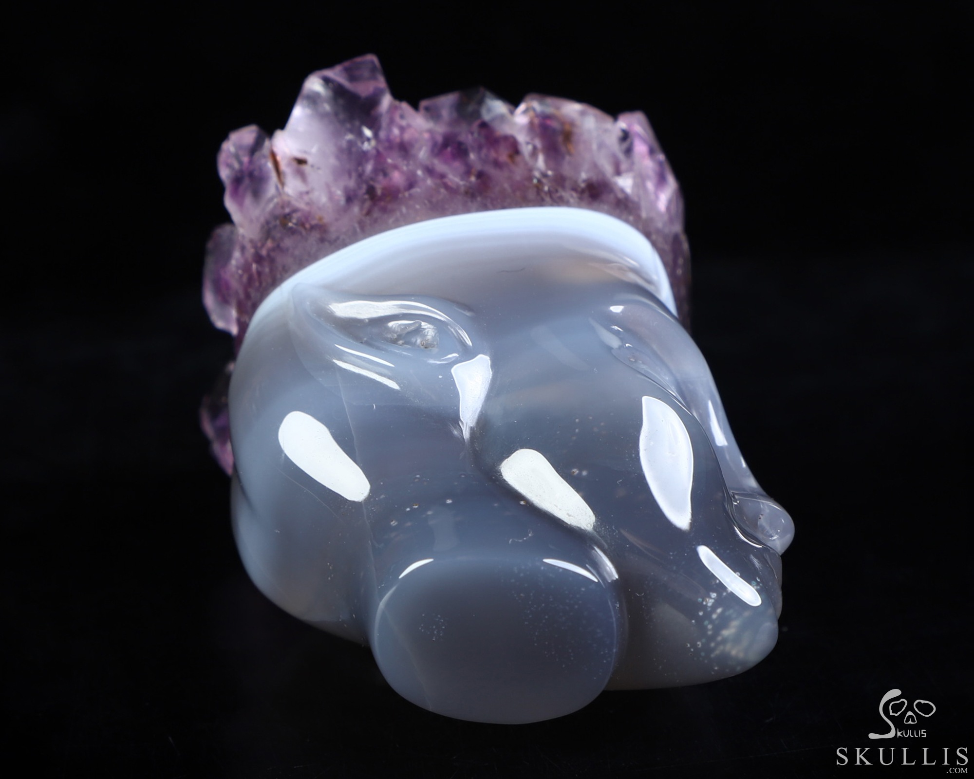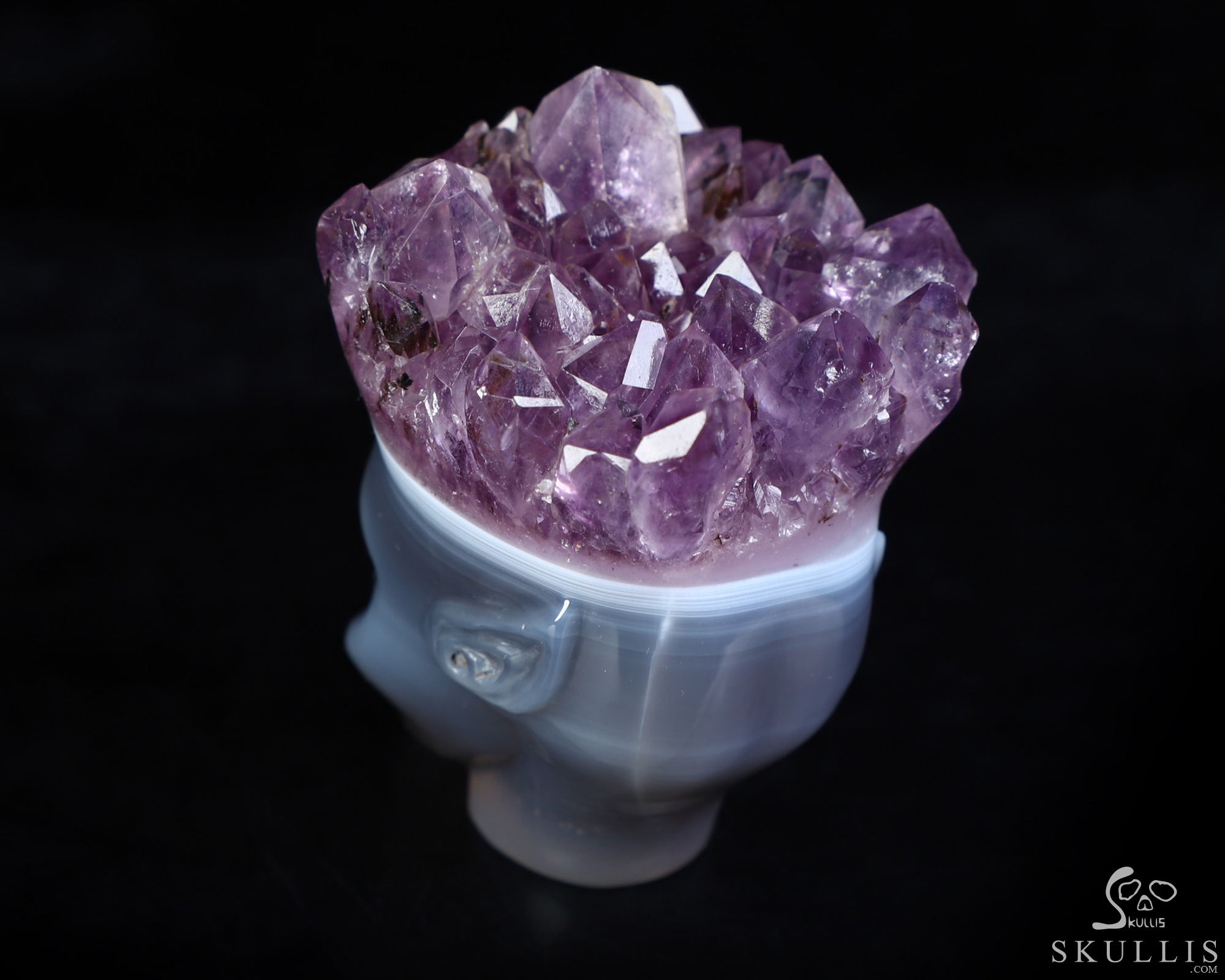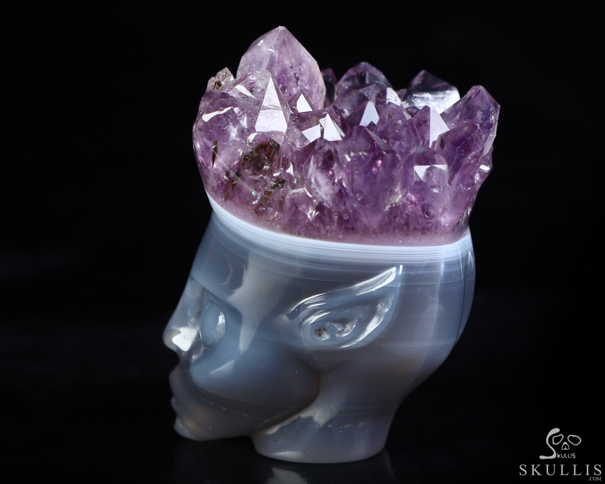 You are looking at an Agate Amethyst Druse skull. The skull is 2.1 inches from top to bottom.
