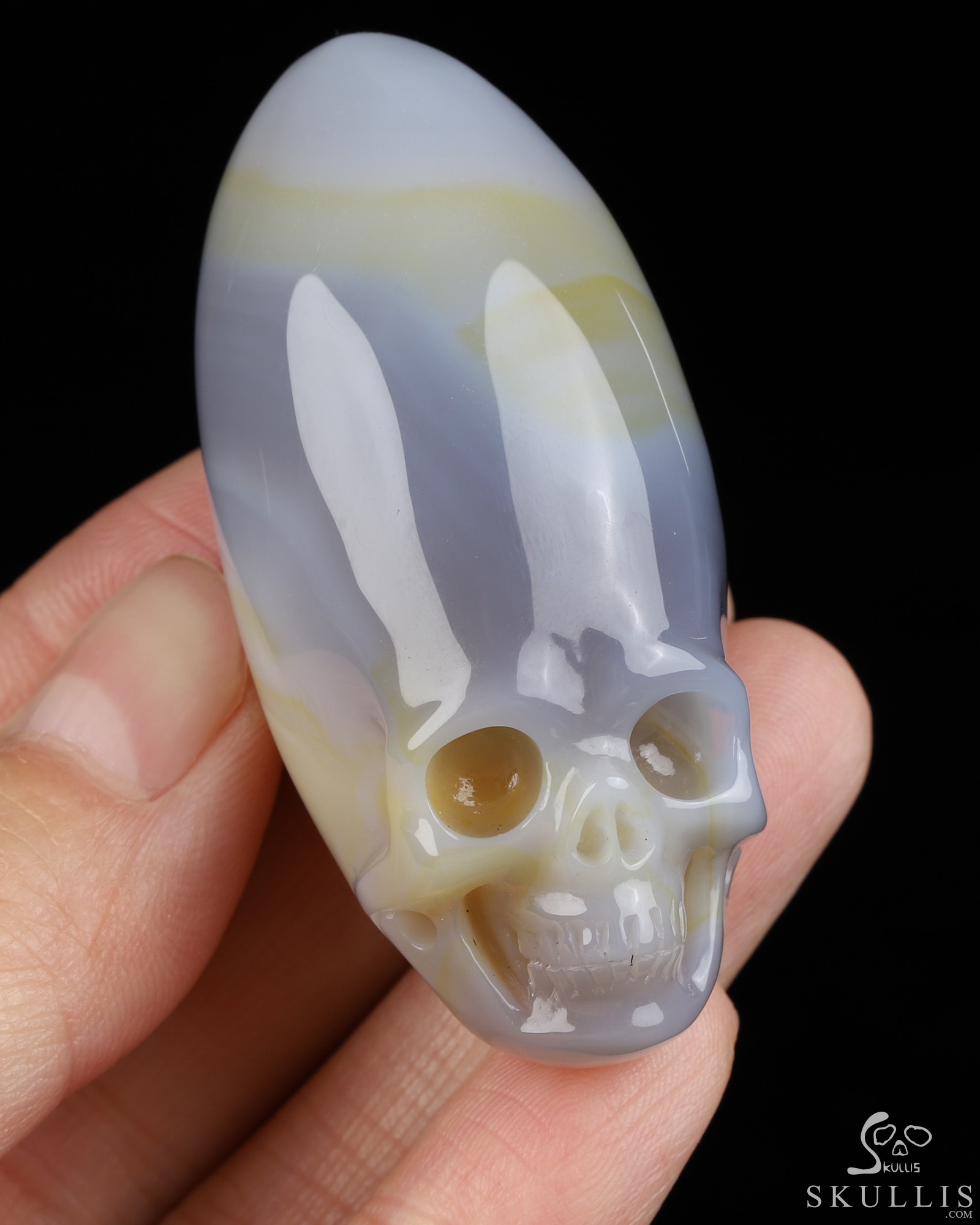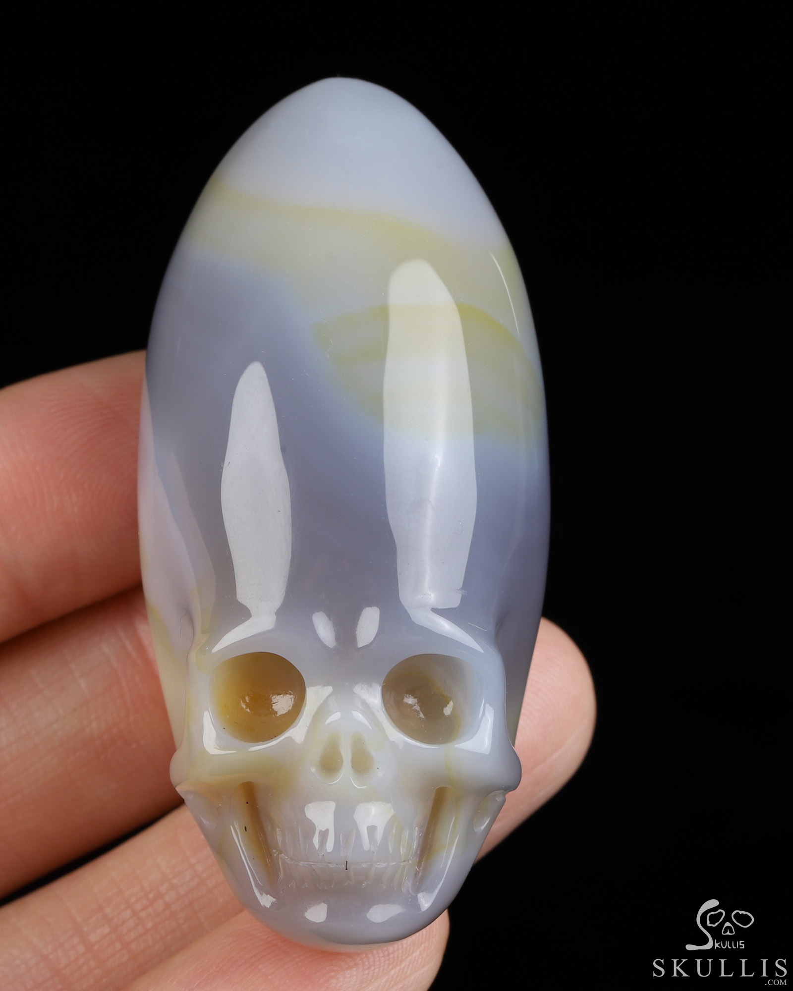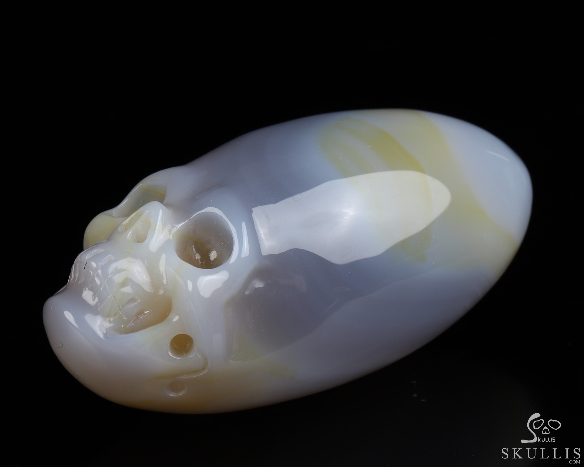 You are looking at a Banded Agate skull. The skull is 2.2 inches from front to back.