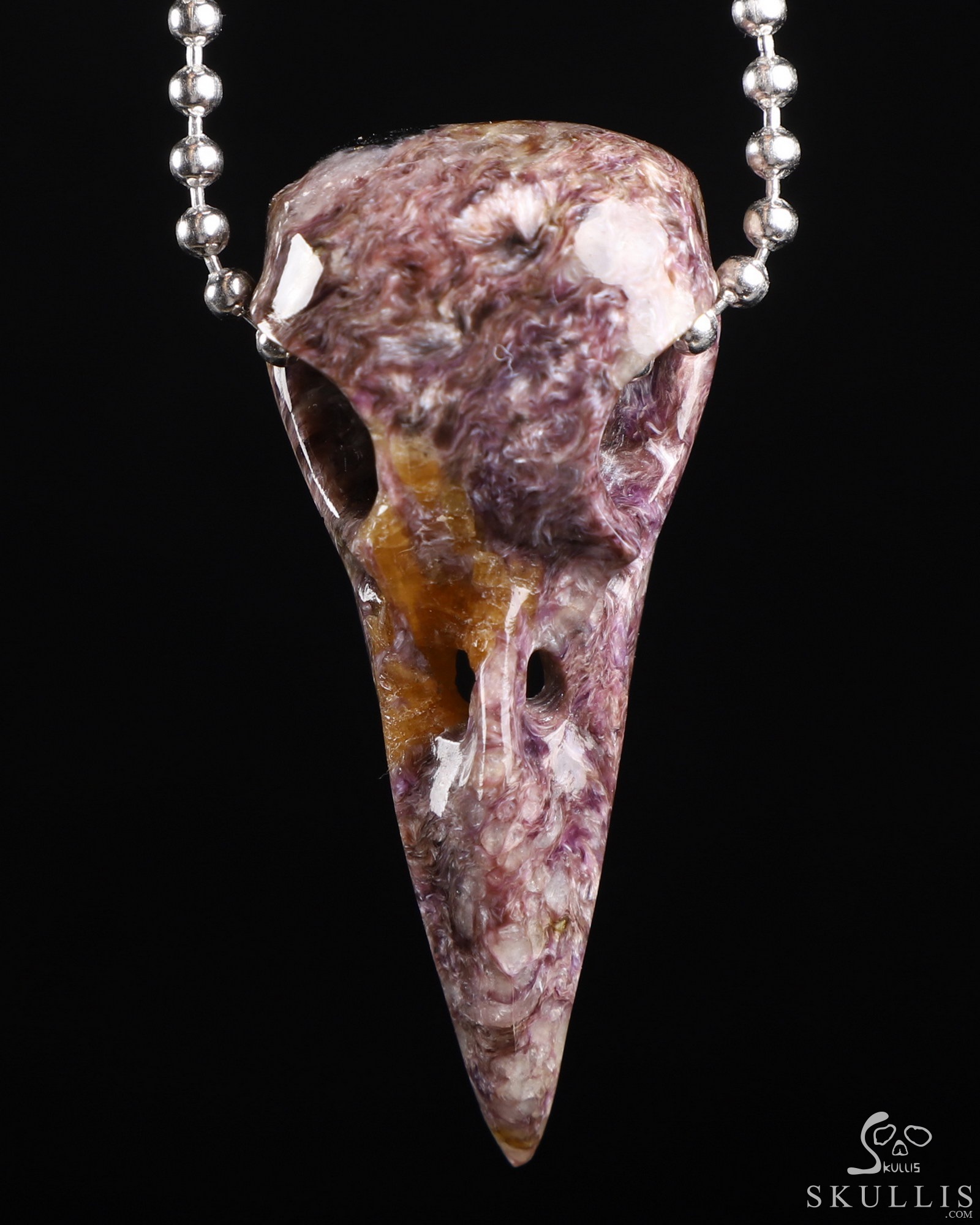 2.4" Russian Charoite Carved Crystal Raven Skull Pendant,Realistic, Crystal Healing