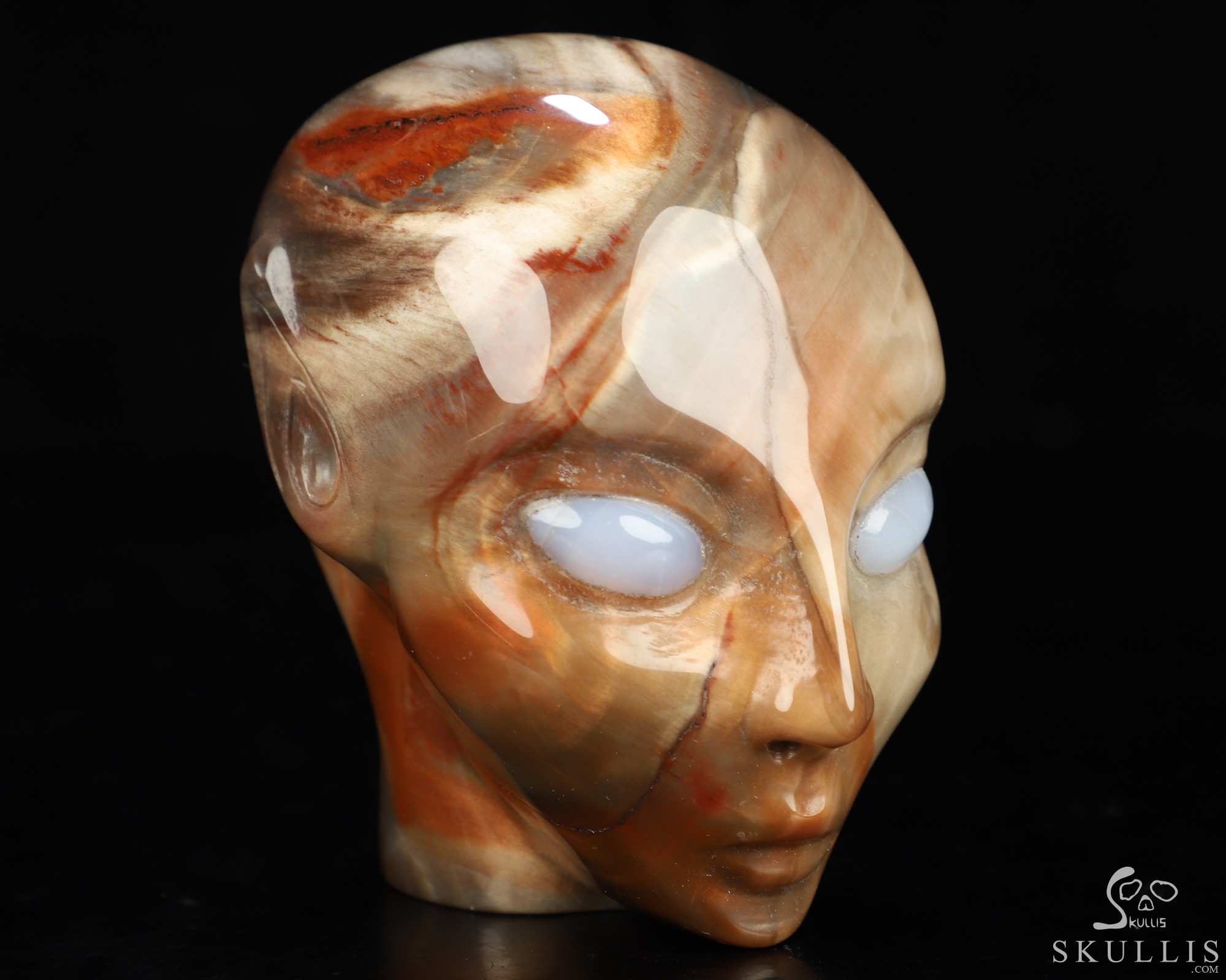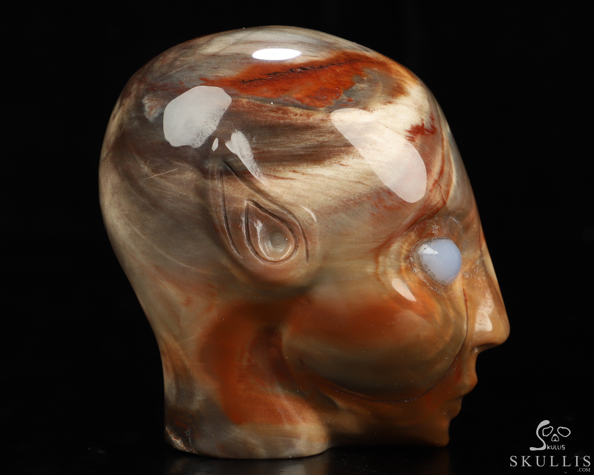 3.3" Petrified Wood Hand Carved Fairy Elf Alien Crystal Skull with Blue Chalcedony Eyes Companion Sculpture, Crystal Healing
