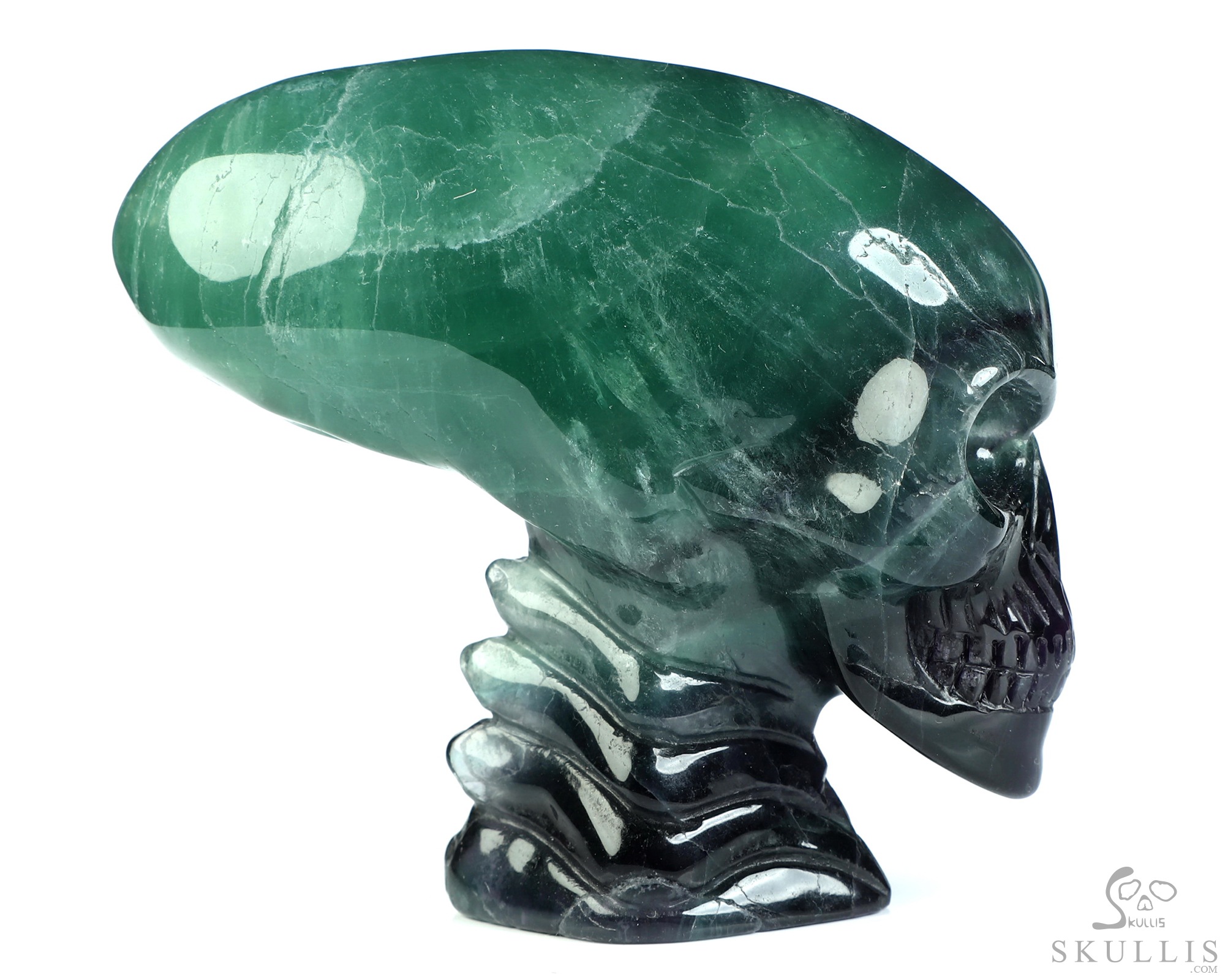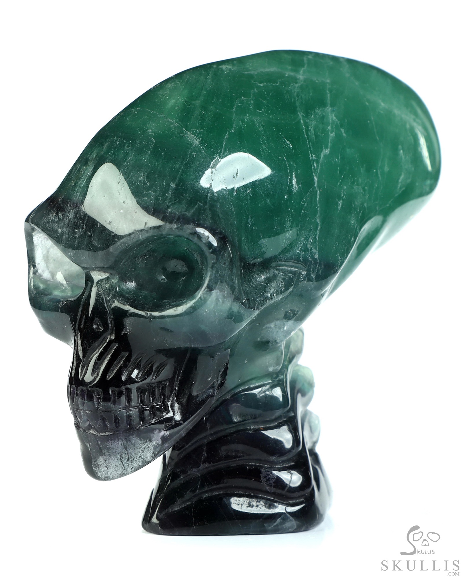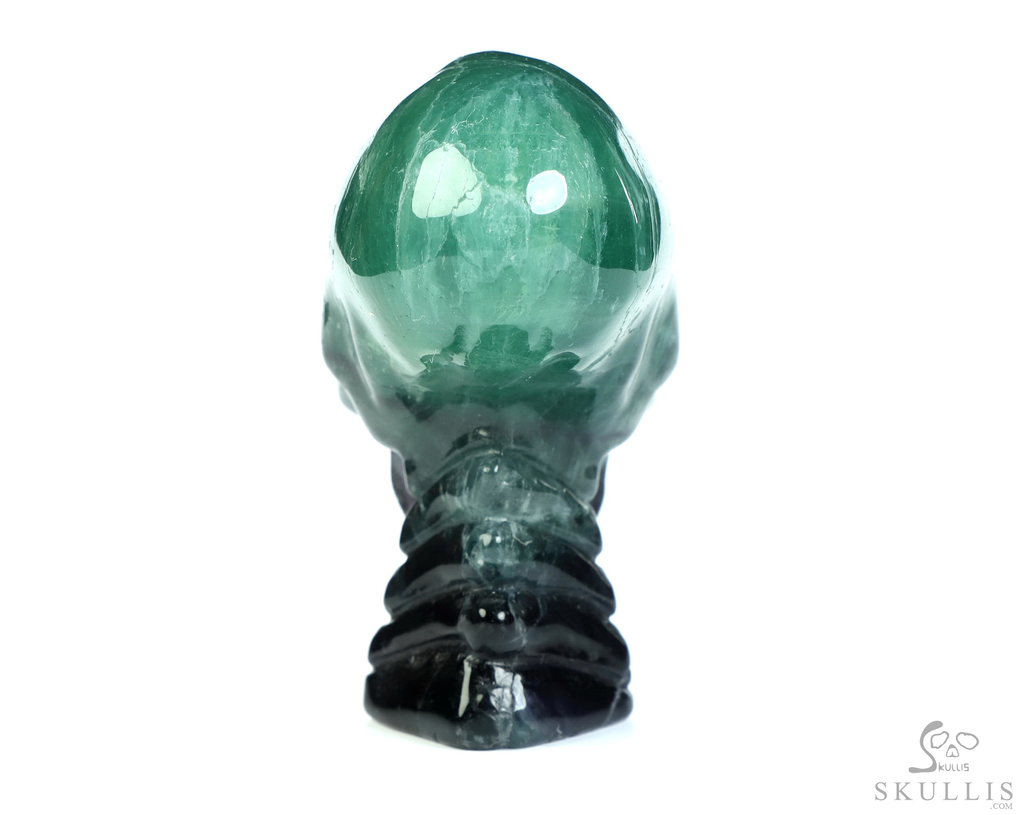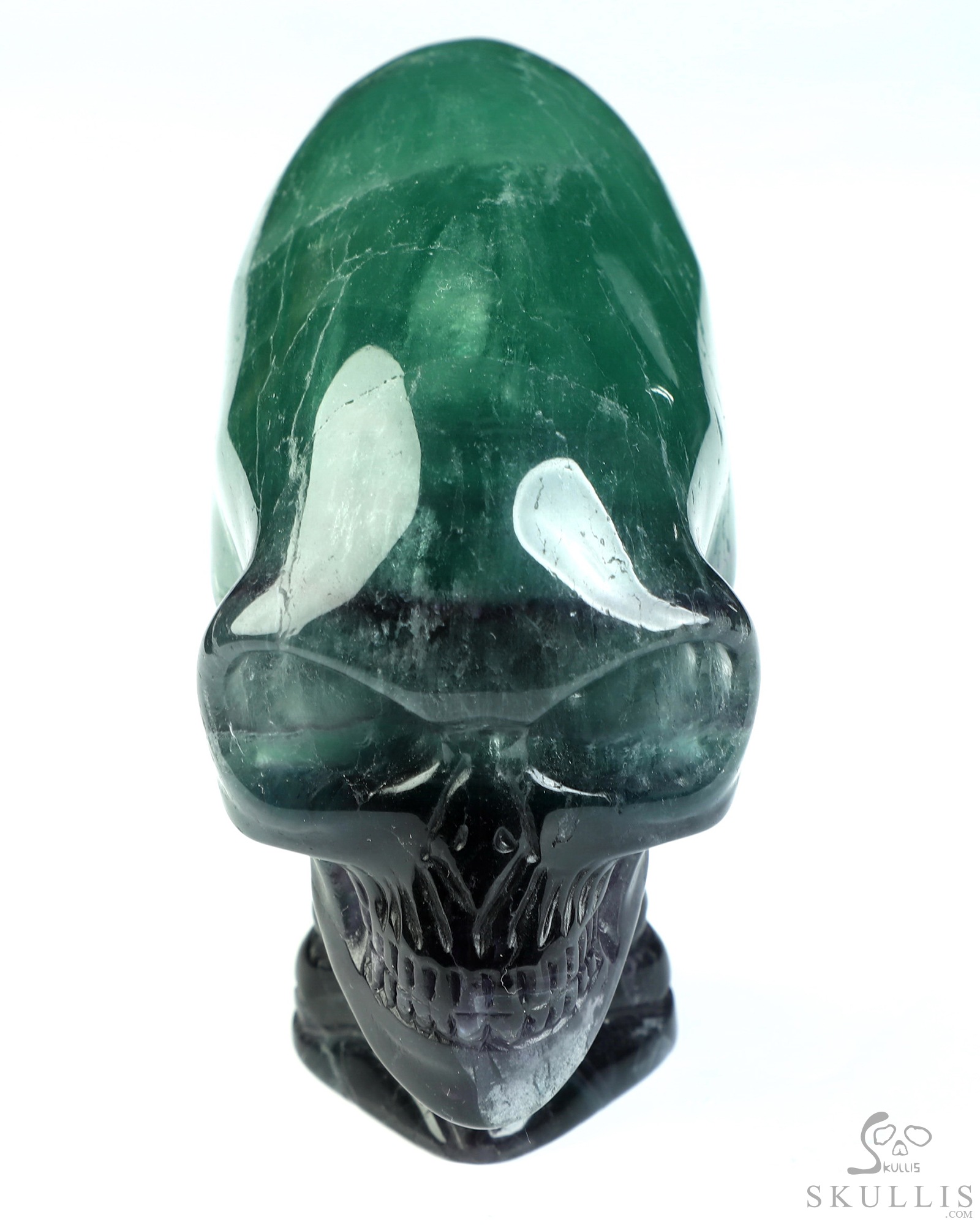 3.5" Fluorite Hand Carved Crystal Elongated Mayan Alien Skull with Spine Sculpture, Crystal Healing