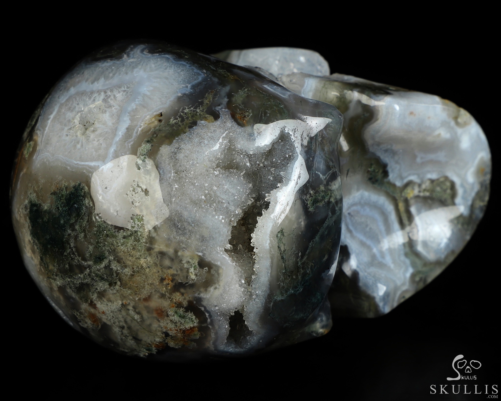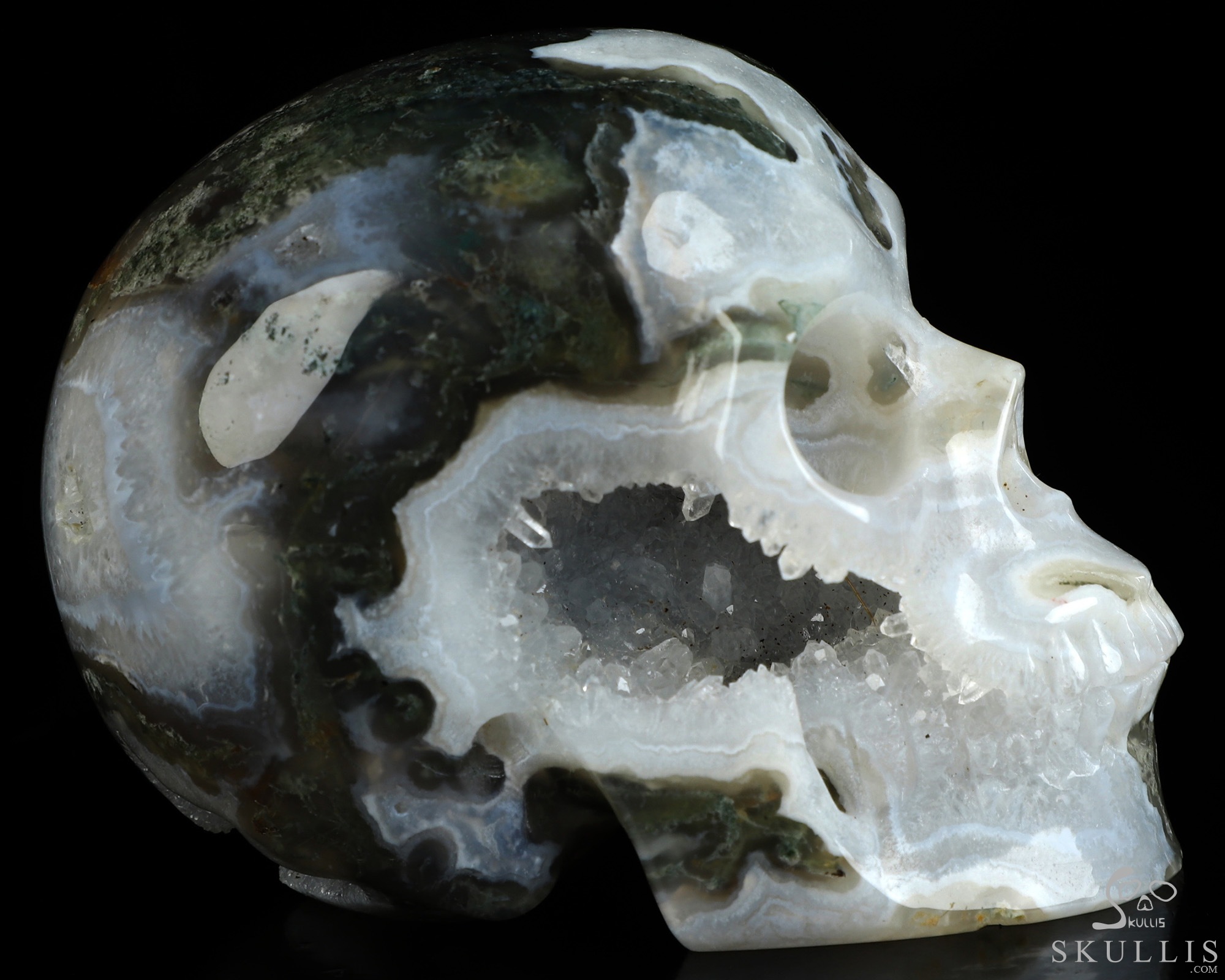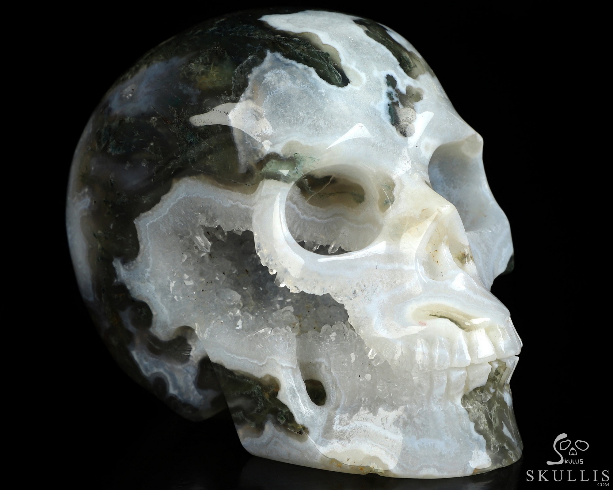 Geode Huge 5.1" Green Moss Agate Carved Crystal Skull,Super Realistic, Crystal Healing