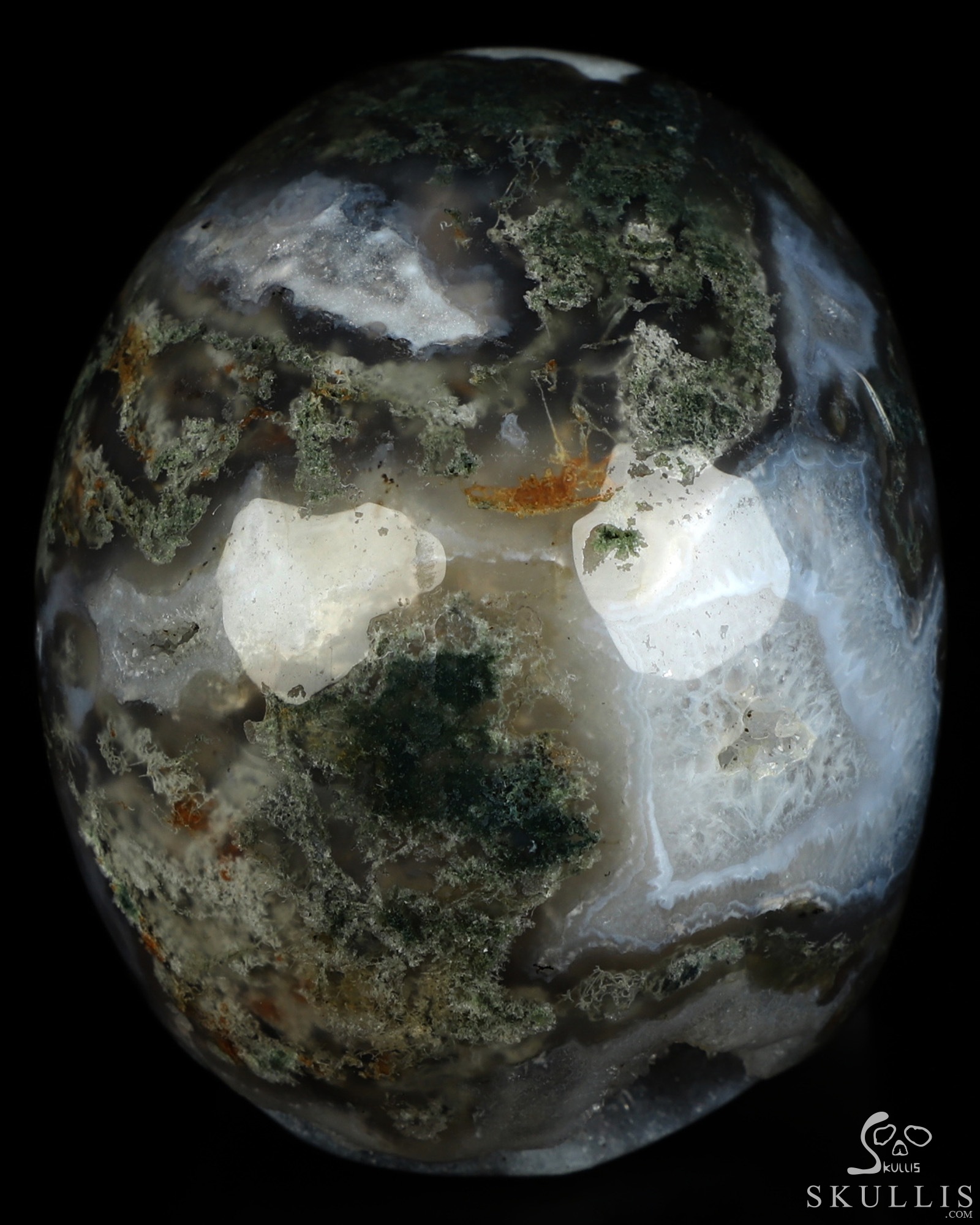 You are looking at a Green Moss Agate skull. The skull is 3.5 inches from front to back.