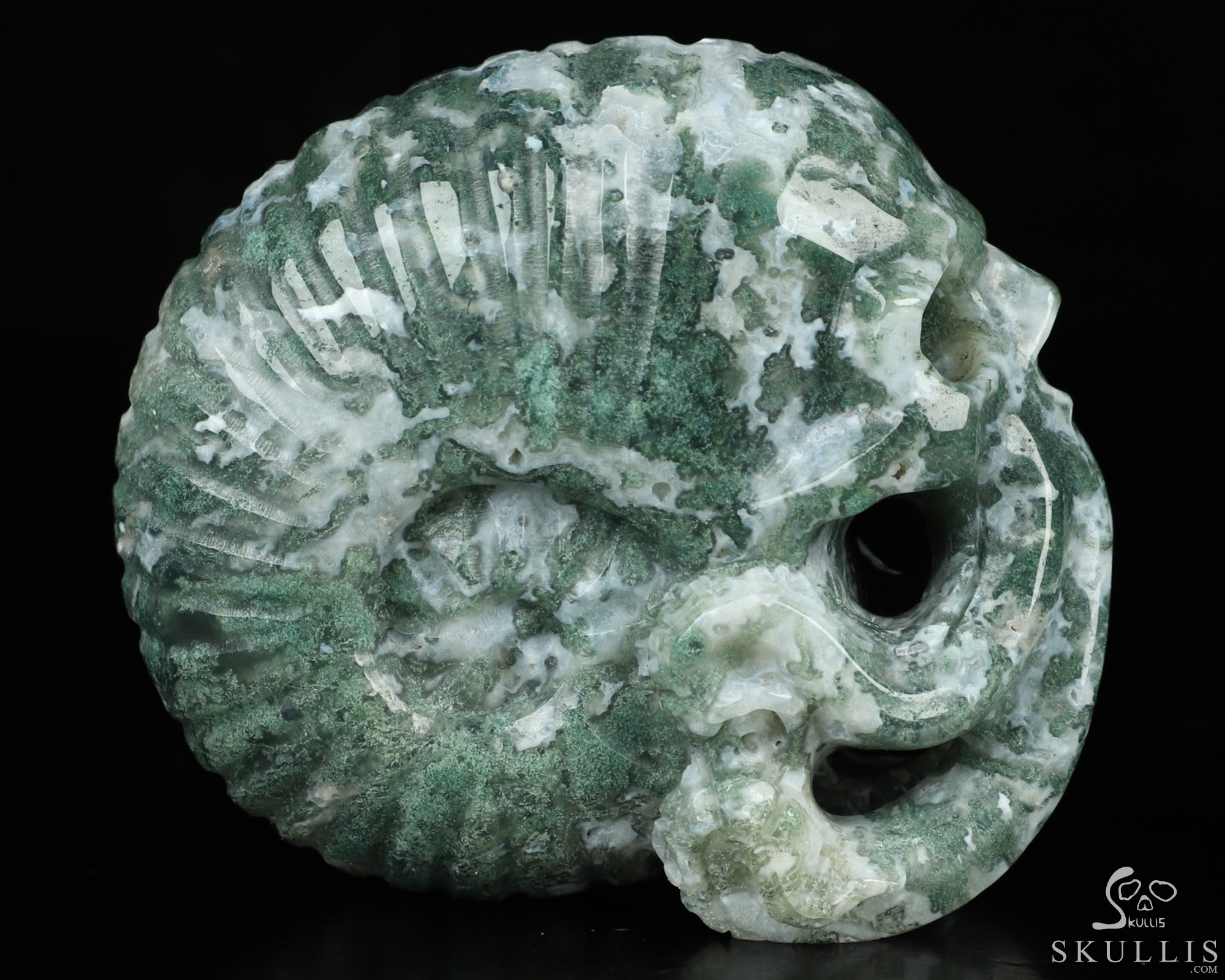 3.6" Green Moss Agate Hand Carved Nautiloid Cthulhu Crystal Skull Sculpture, Crystal Healing