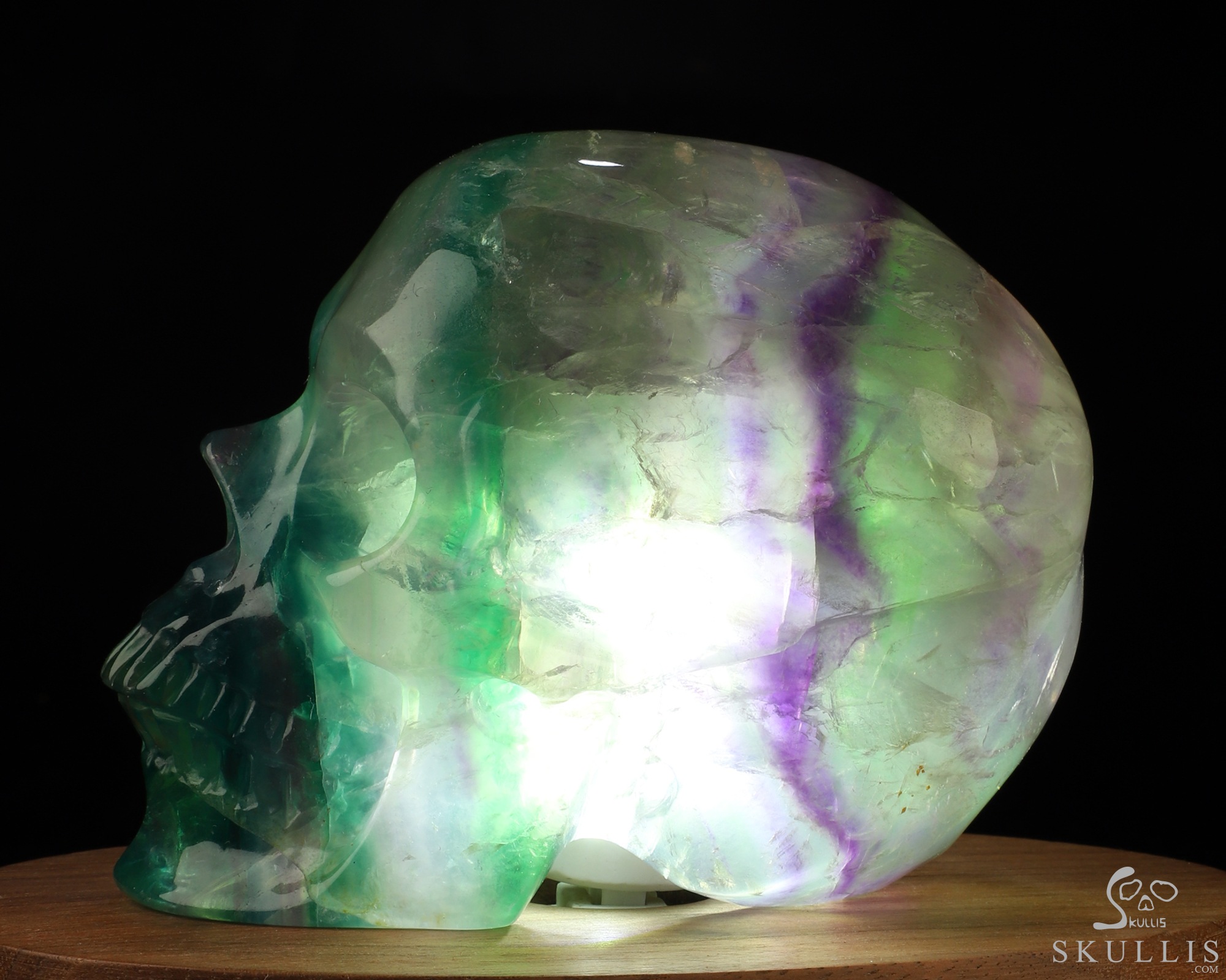 4.5" Fluorite Hand Carved Hollow Crystal Skull Lamp/Light with Led Stand, Super Realistic, Crystal Healing