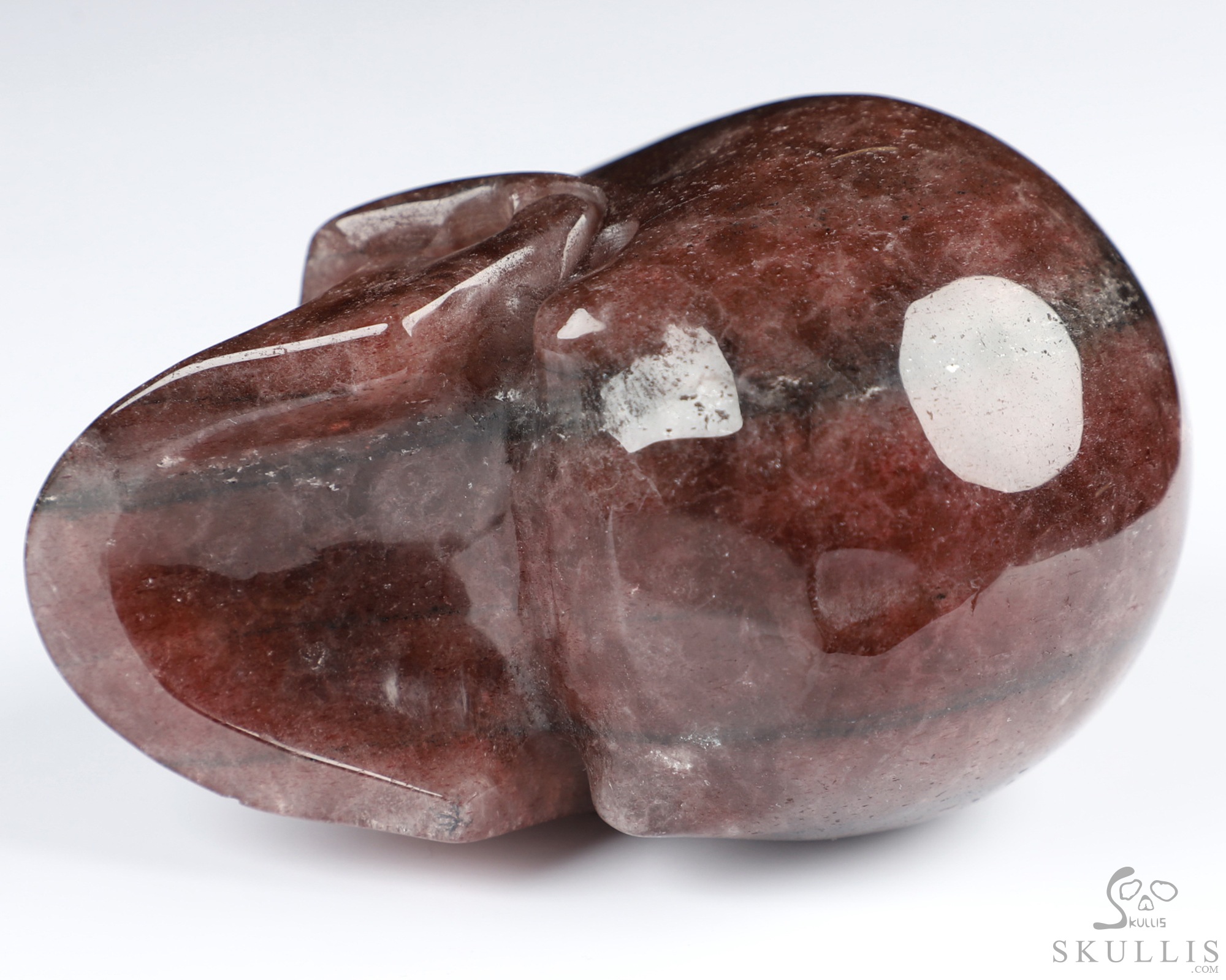 You are looking at a Strawberry Quartz skull. The skull is 3.9 inches from front to back.