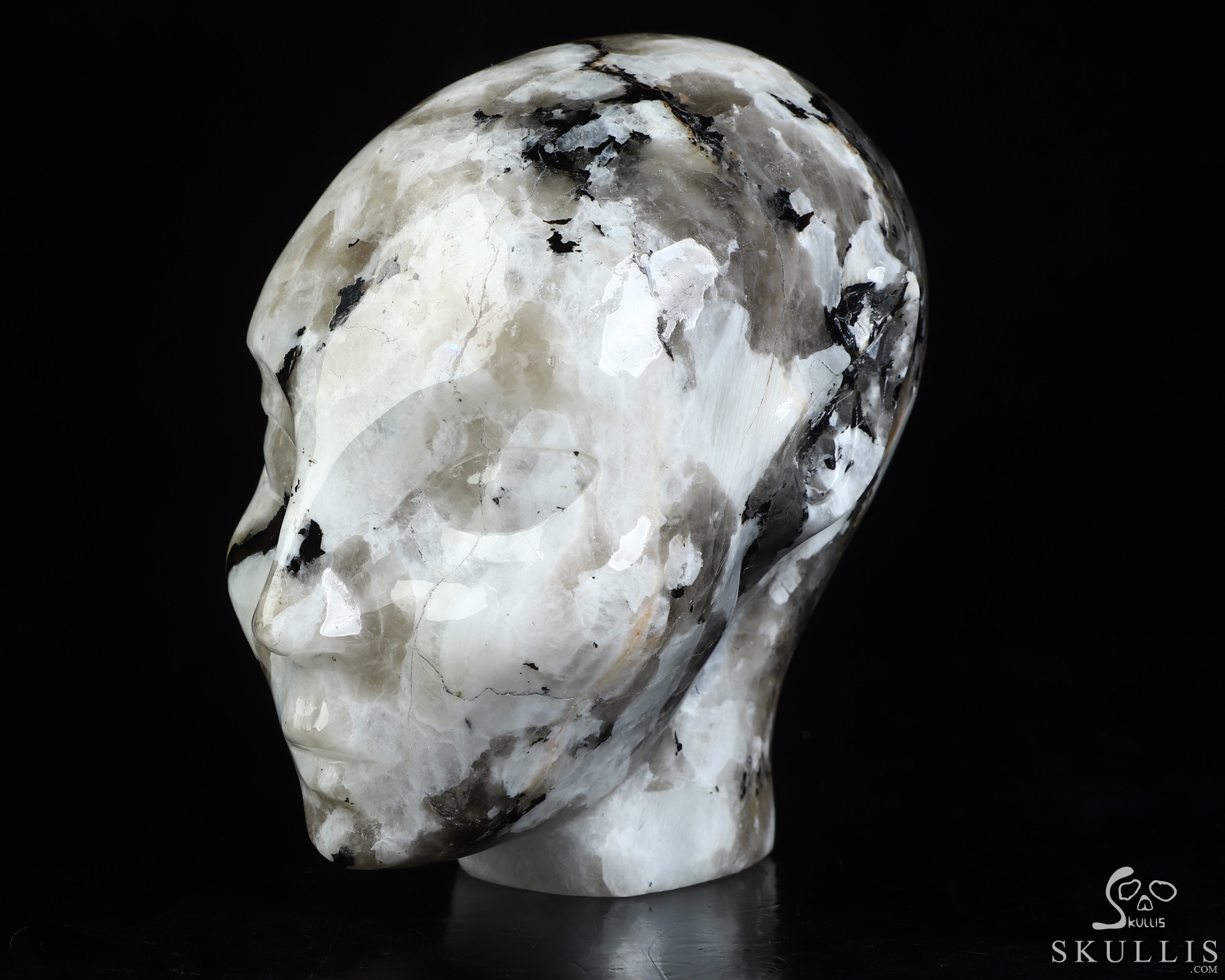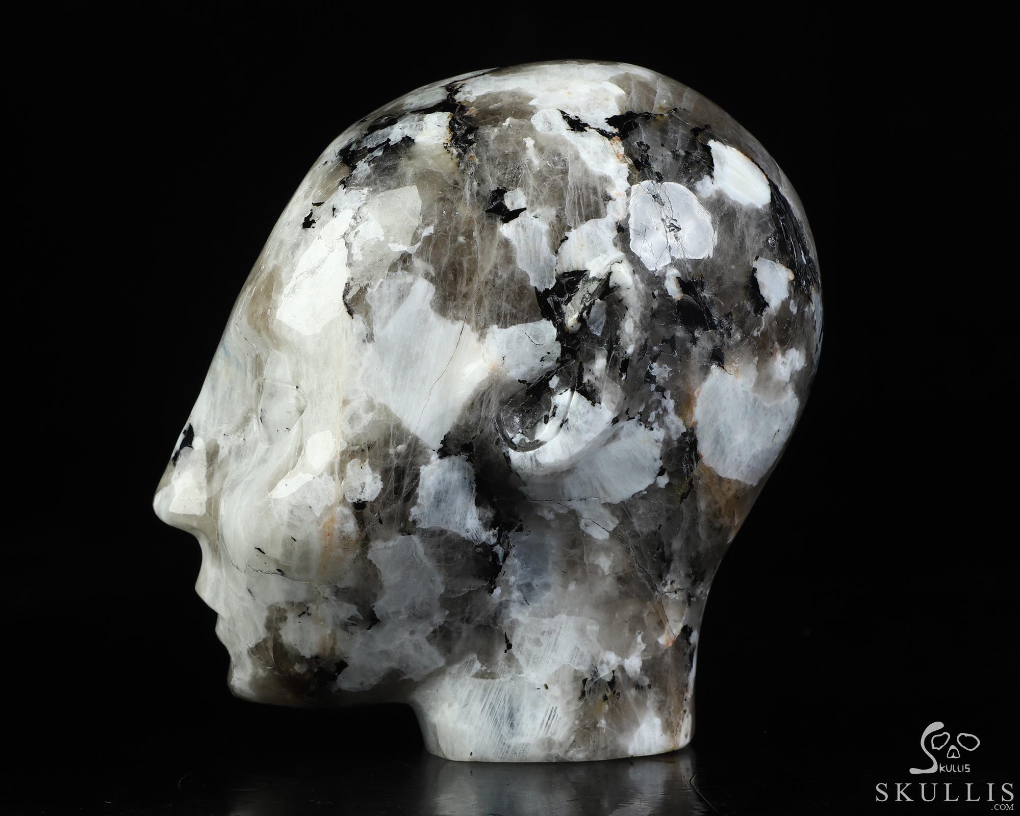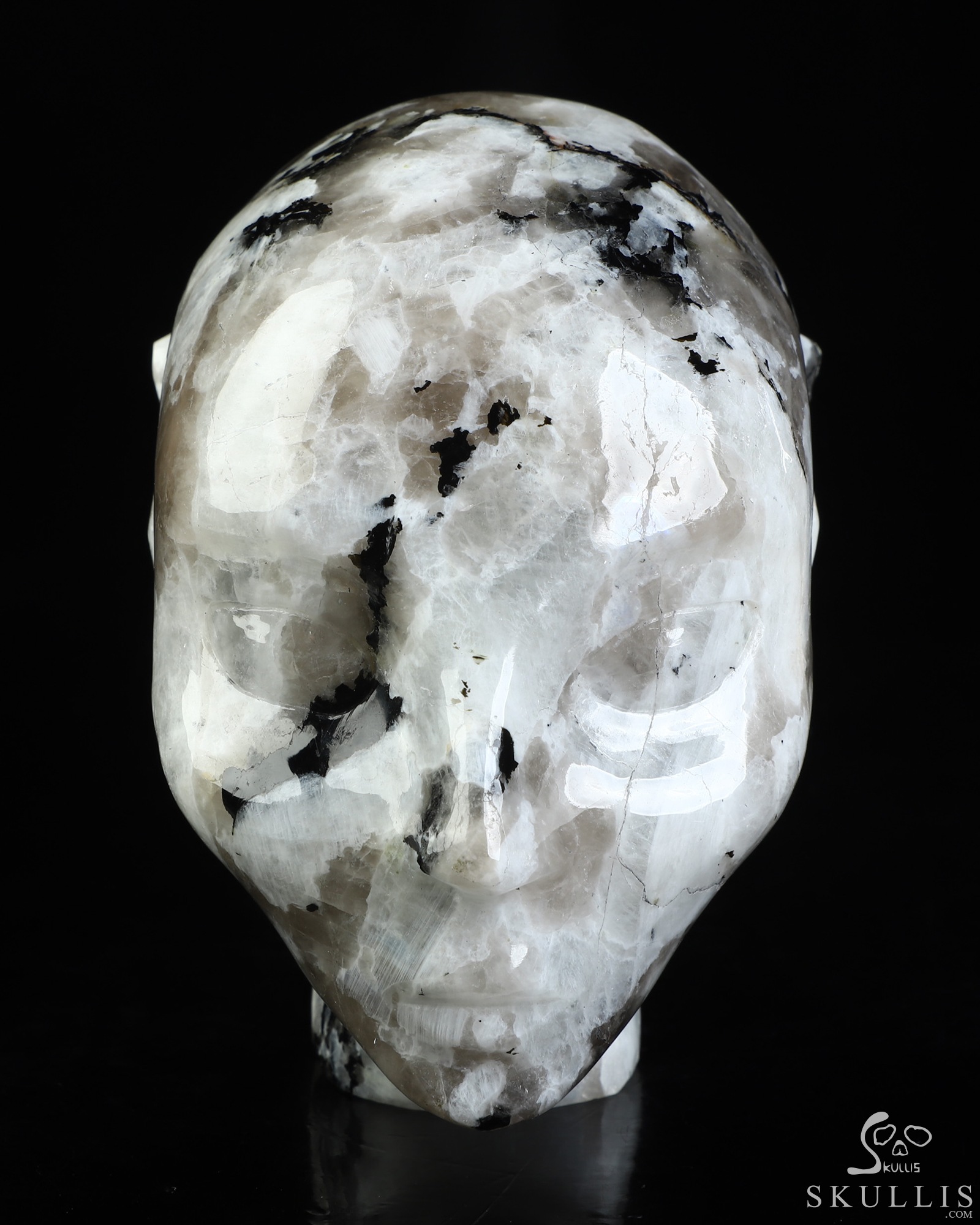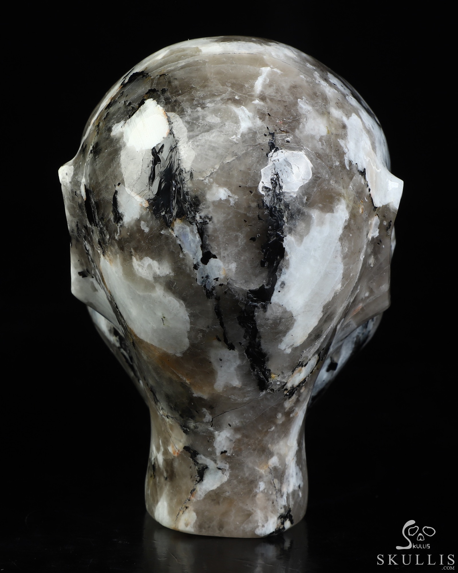 You are looking at a Black Tourmaline and Moonstone skull. The skull is 4.1 inches from top to bottom.