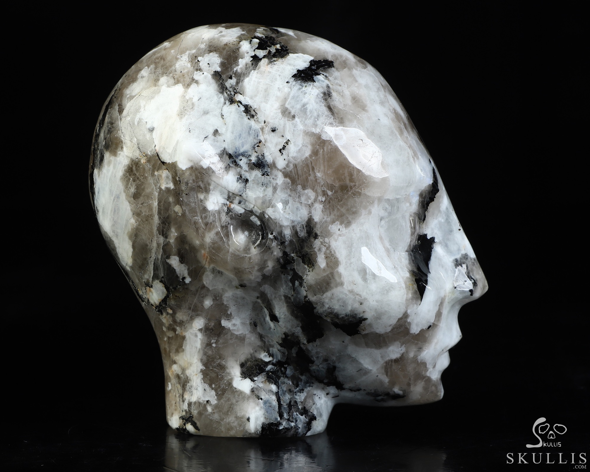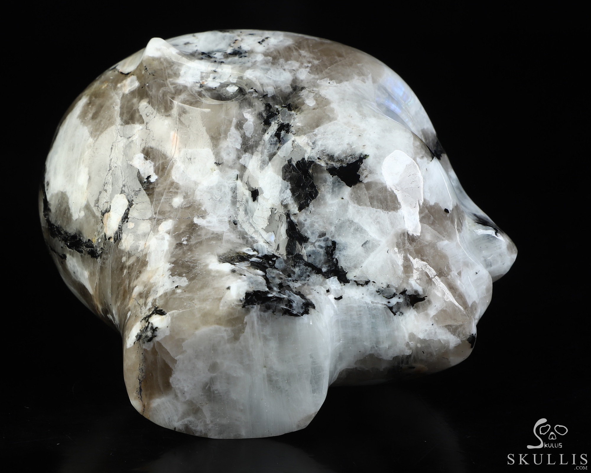 2.8" Black Tourmaline and Moonstone Hand Carved Crystal Skull Fine Art Sculpture, Crystal Healing
