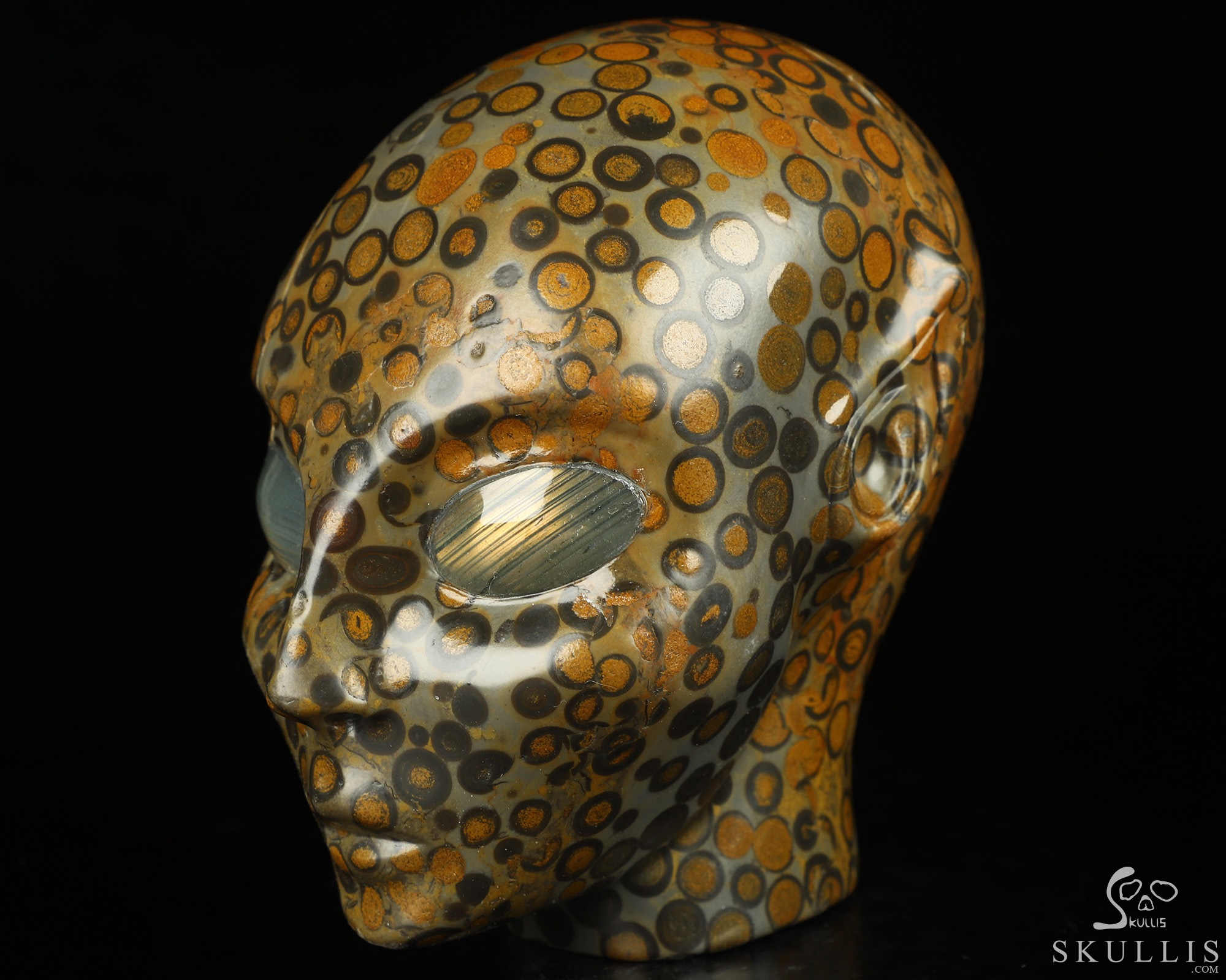 4.1" Chinese Leopard Skin Jasper Hand Carved Fairy Elf Alien Crystal Skull Companion With Labradorite Eyes, Hand Carved Gemstone Fine Art Sculpture, Reiki Healing Stone Statue