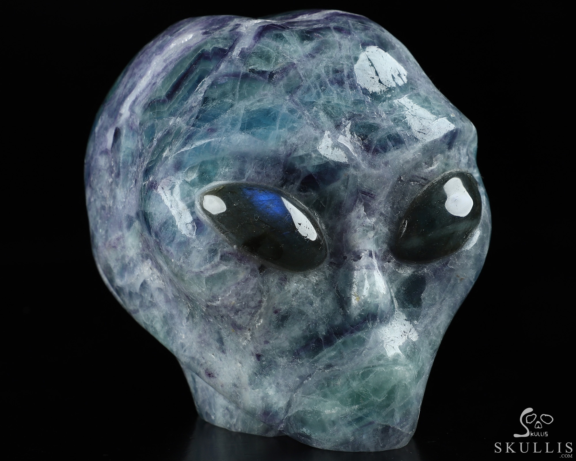4.1" Fluorite CarvedCrystal Skull Companion with Labradorite Eyes, Star Being Female Alien Reiki Healing Stone Statue