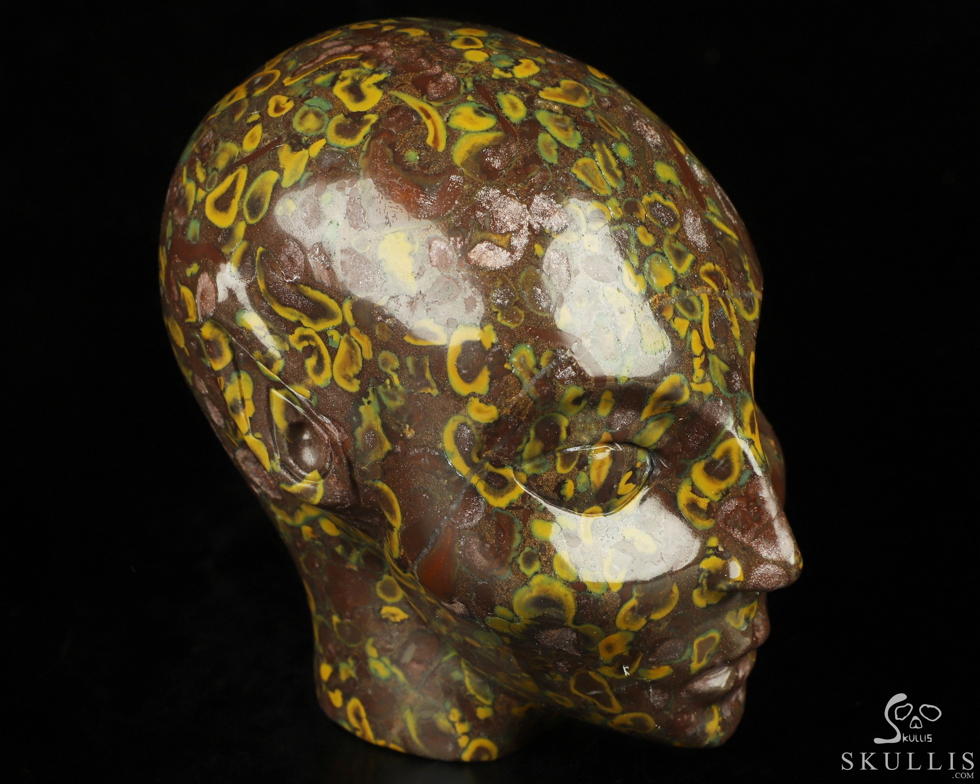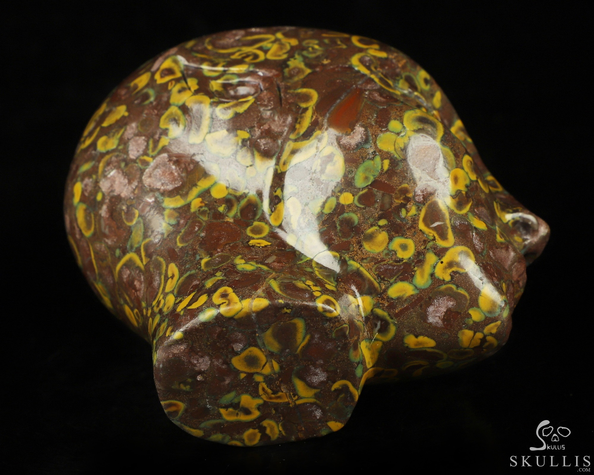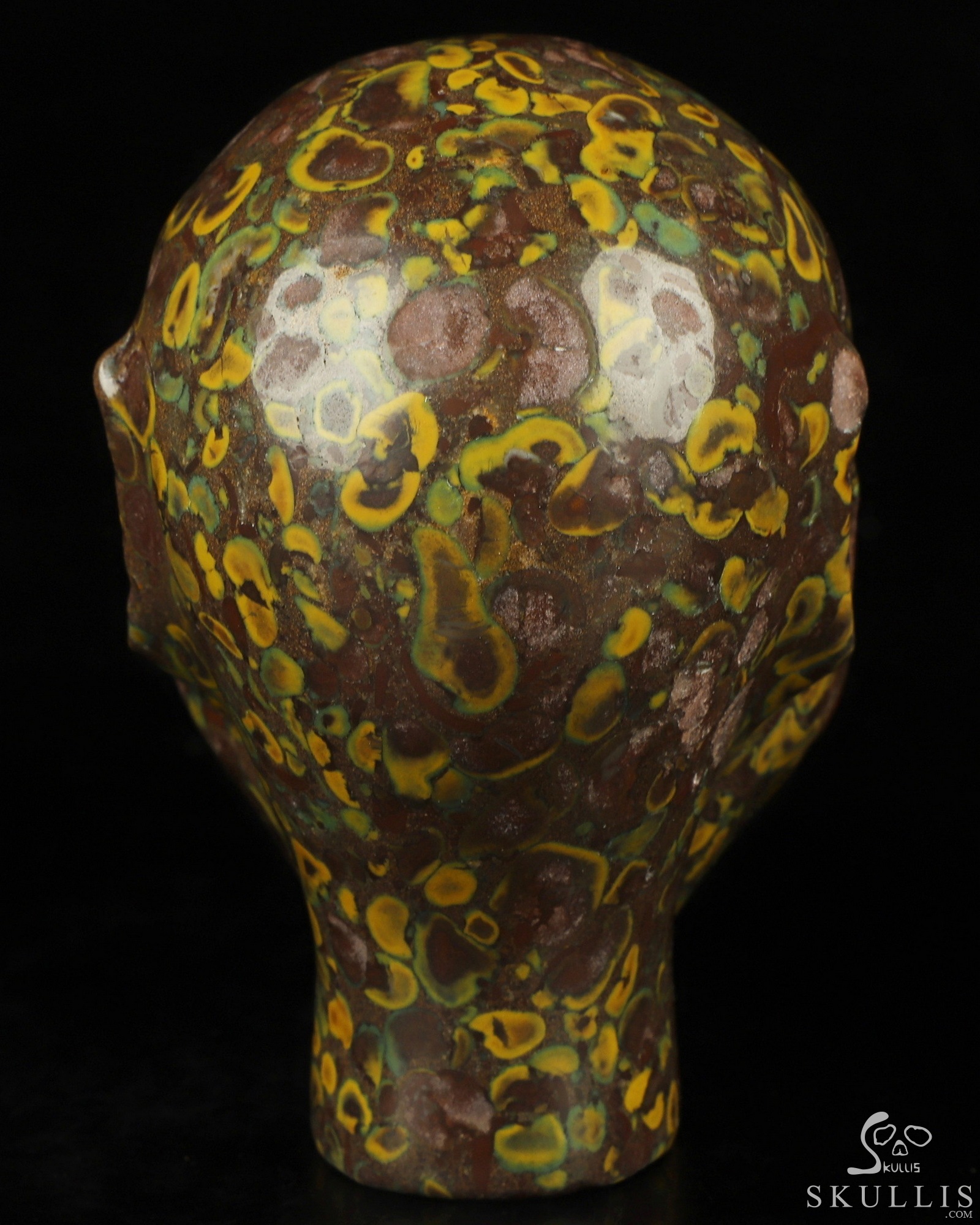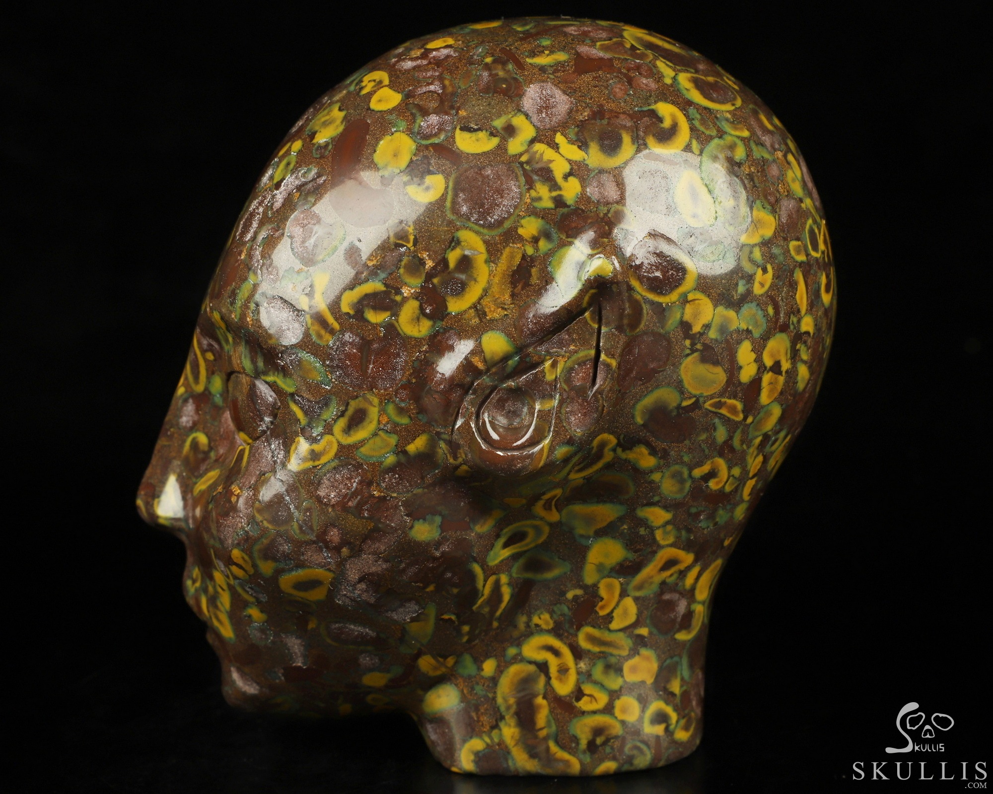 You are looking at a Fruit Jasper skull. The skull is 4.1 inches from top to bottom.