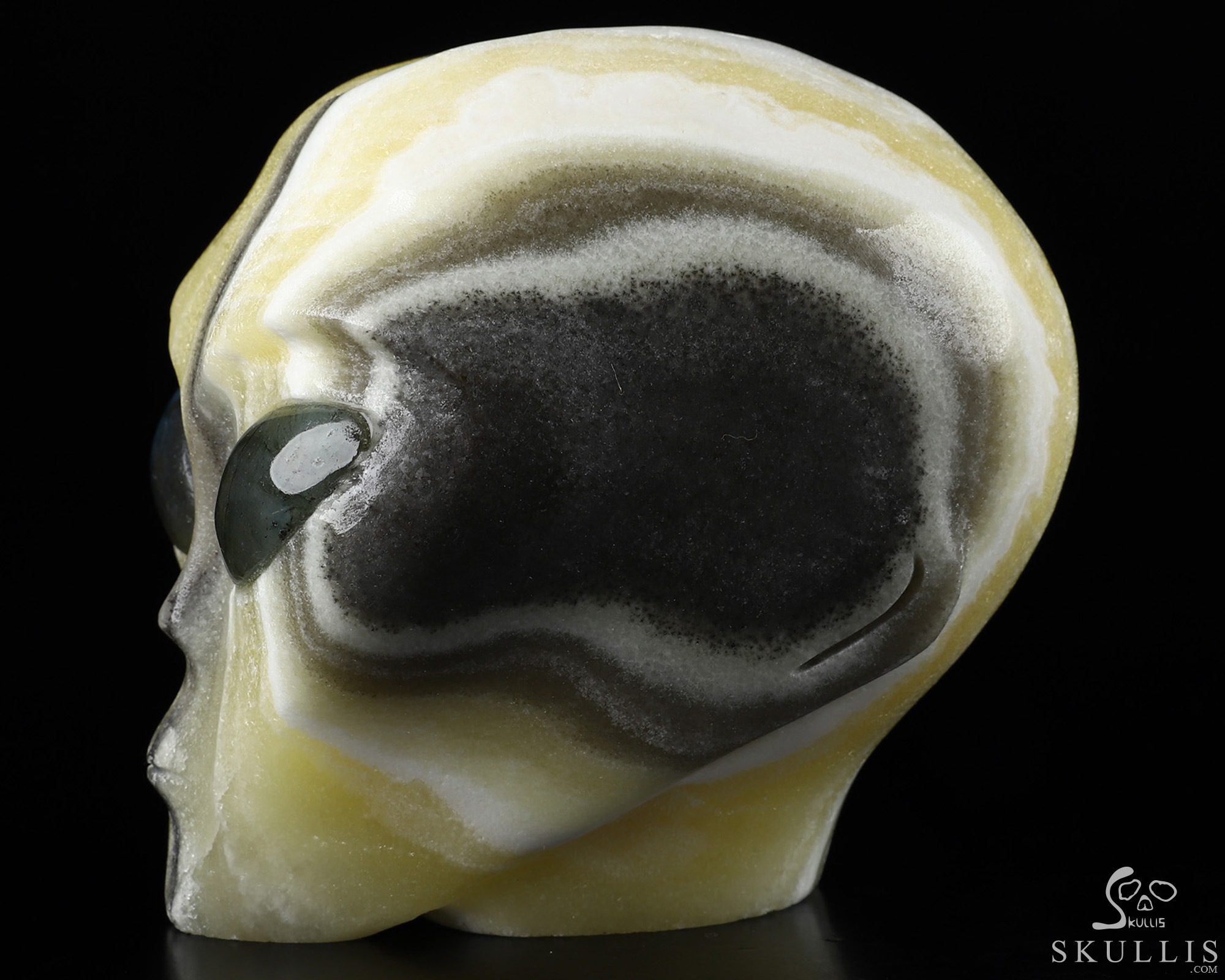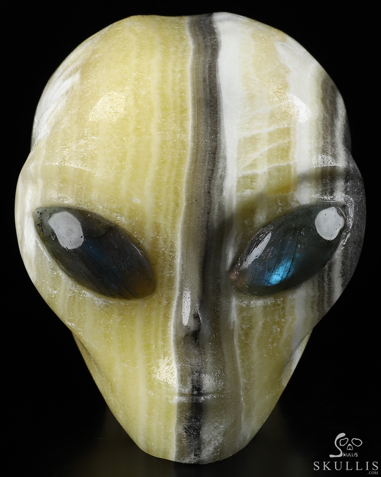 4.1" Zebra Calcite CarvedCrystal Skull Companion with Labradorite Eyes, Star Being Female Alien Reiki Healing Stone Statue