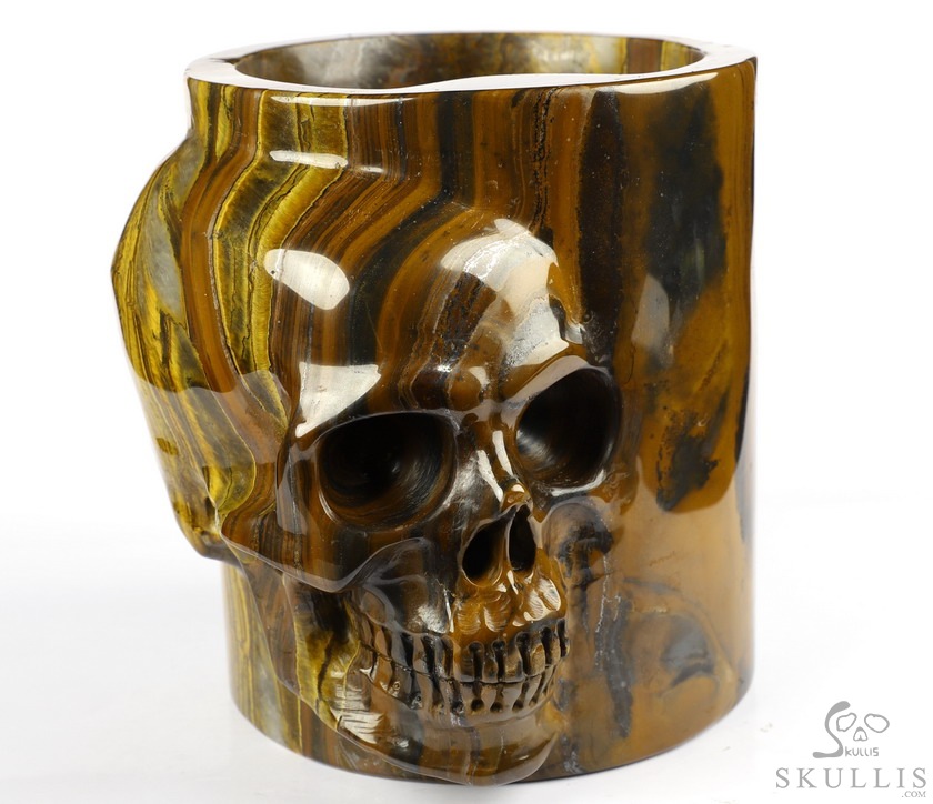 4.4" Tiger Iron Eye Carved Crystal Skull Storage, Coffee Jar、Pen Container, Crystal Healing