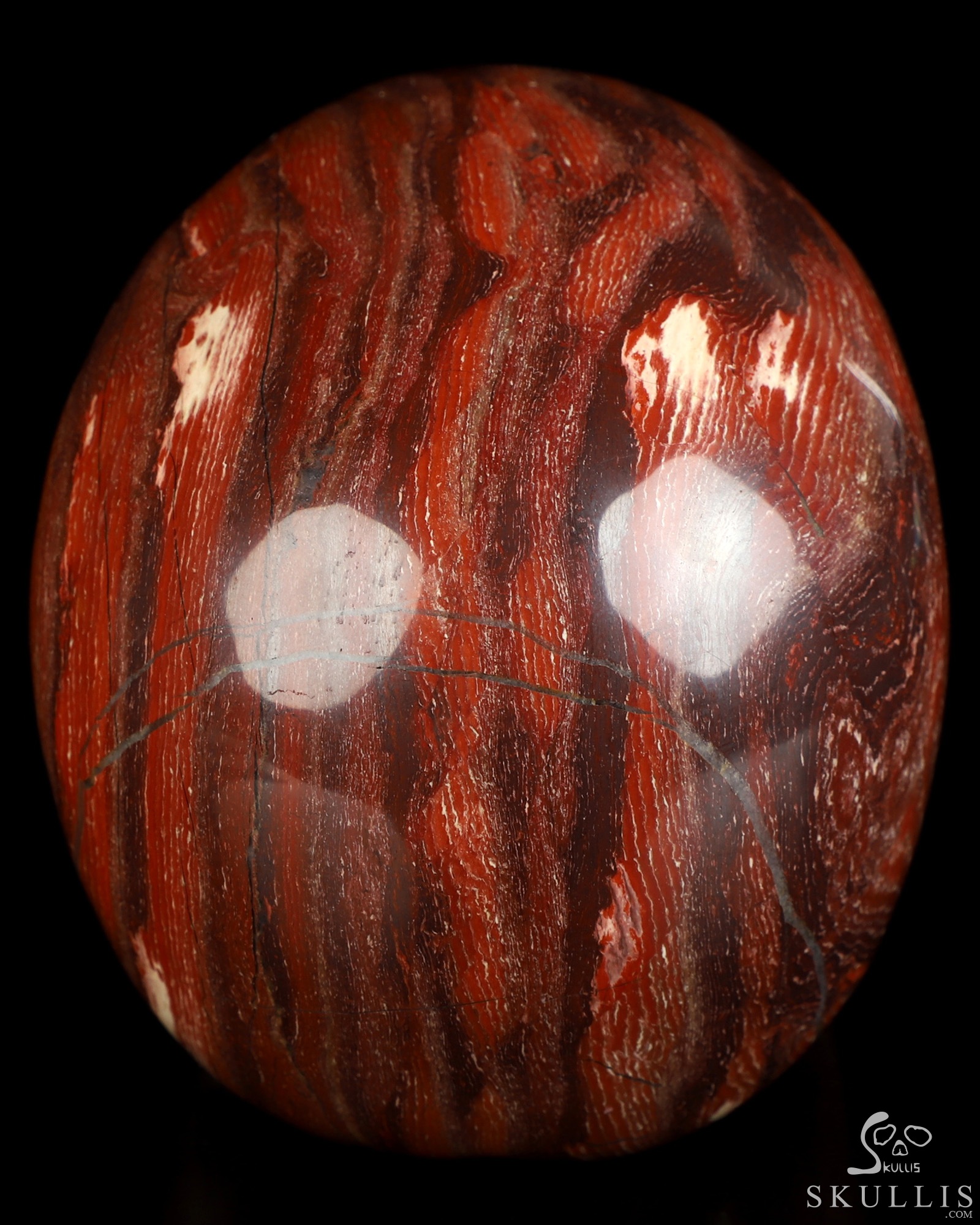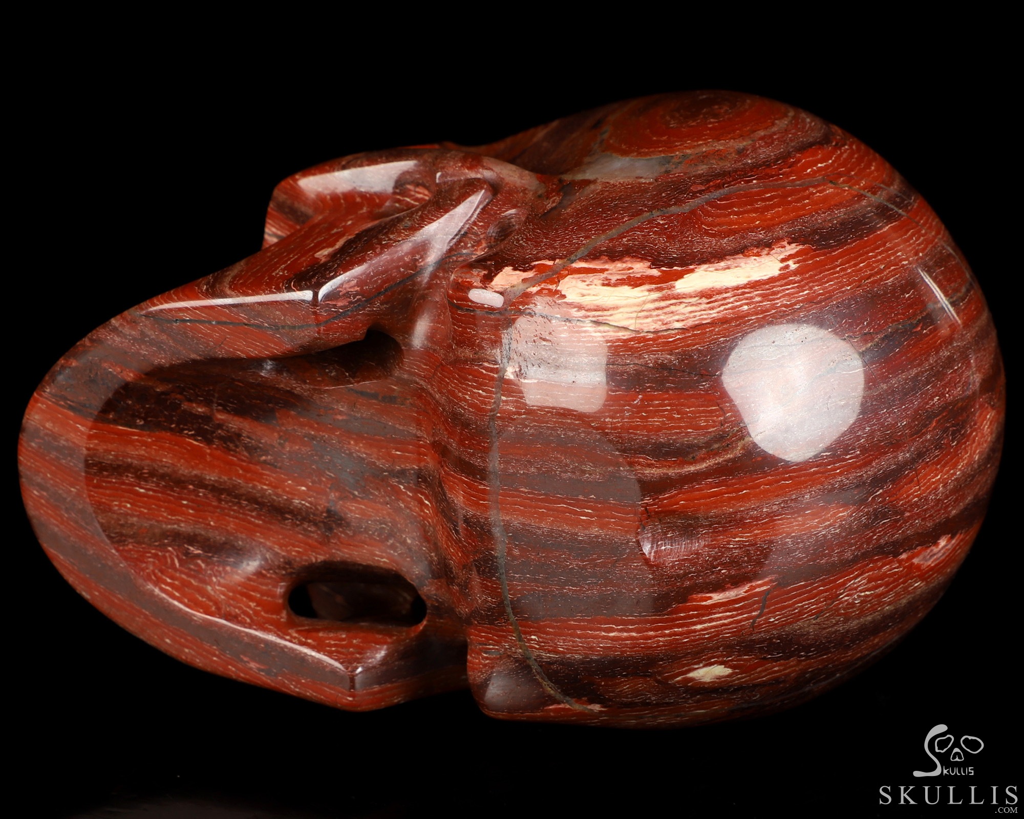 You are looking at a Red Snake Skin Jasper skull. The skull is 4.5 inches from front to back.