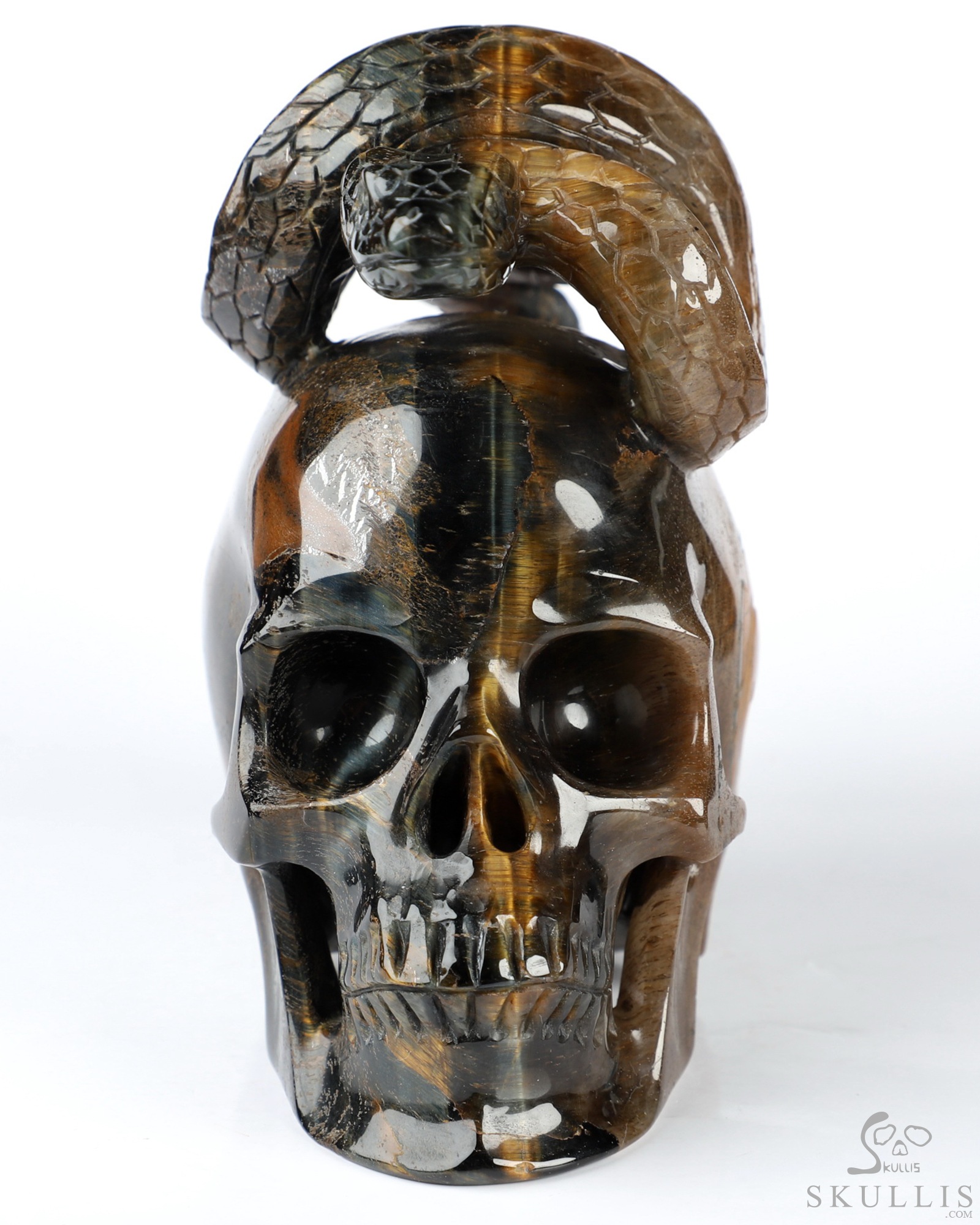 4.7" Blue & Gold Tiger's Eye Hand Carved Crystal Skull and Snake Sculpture, Crystal Healing