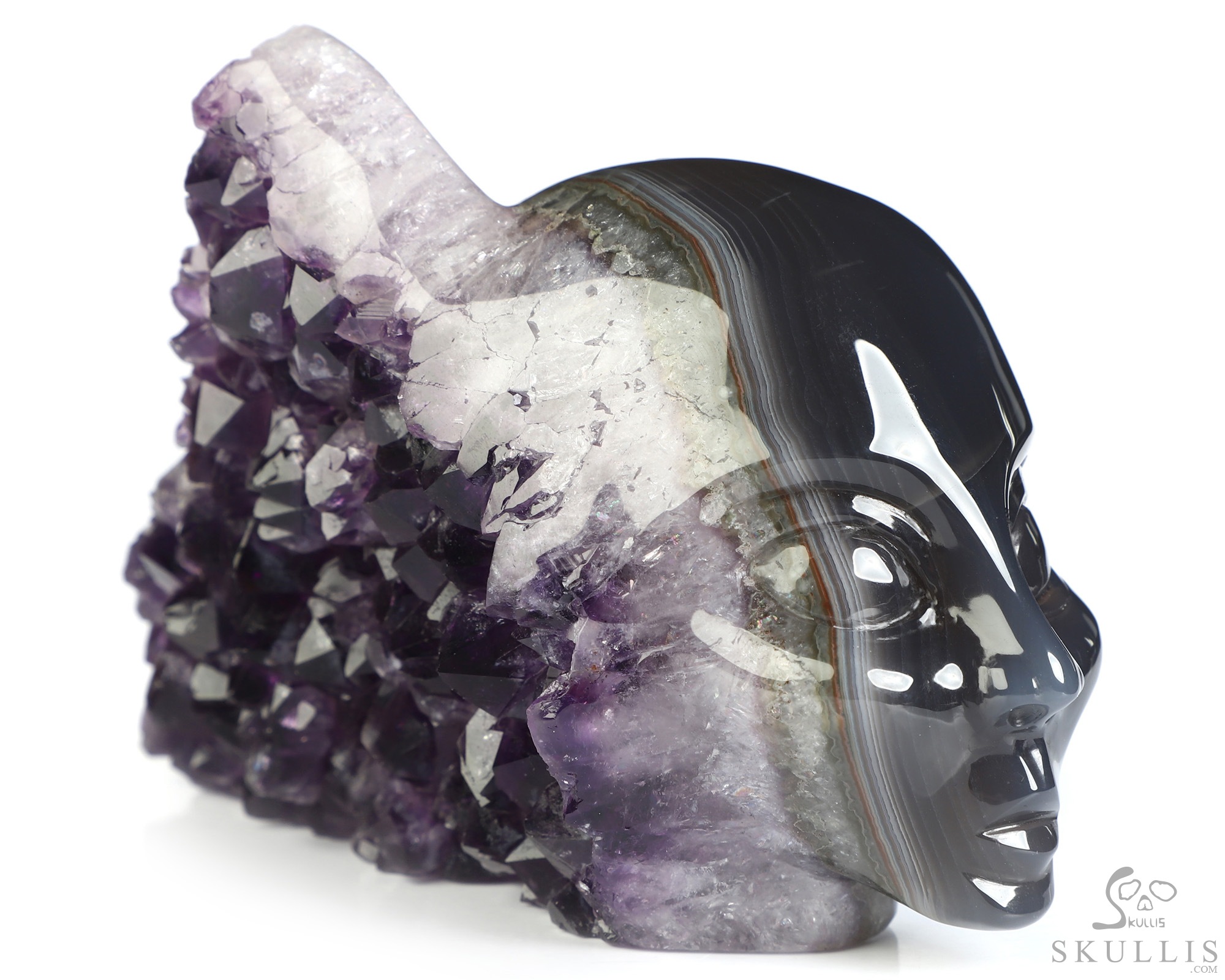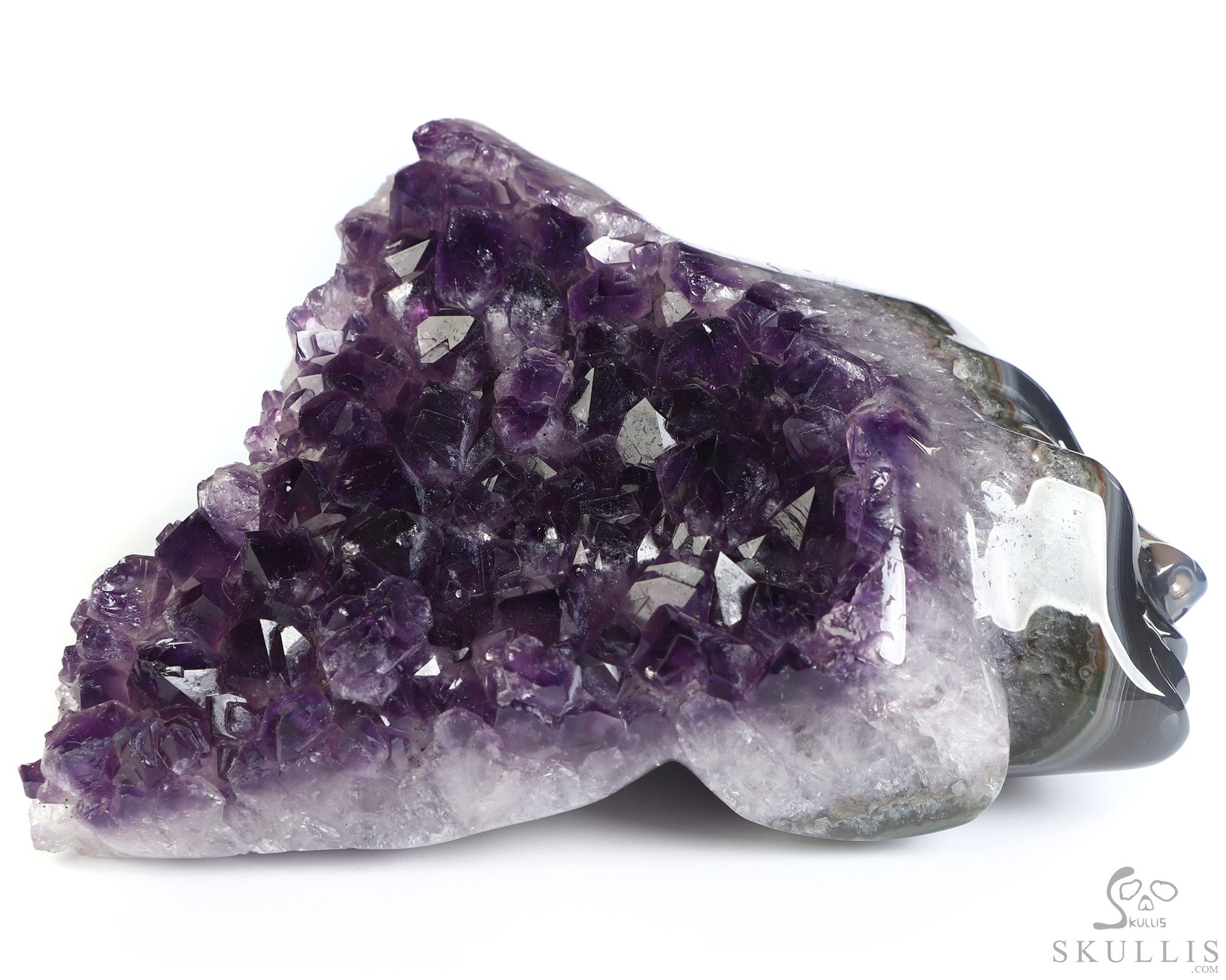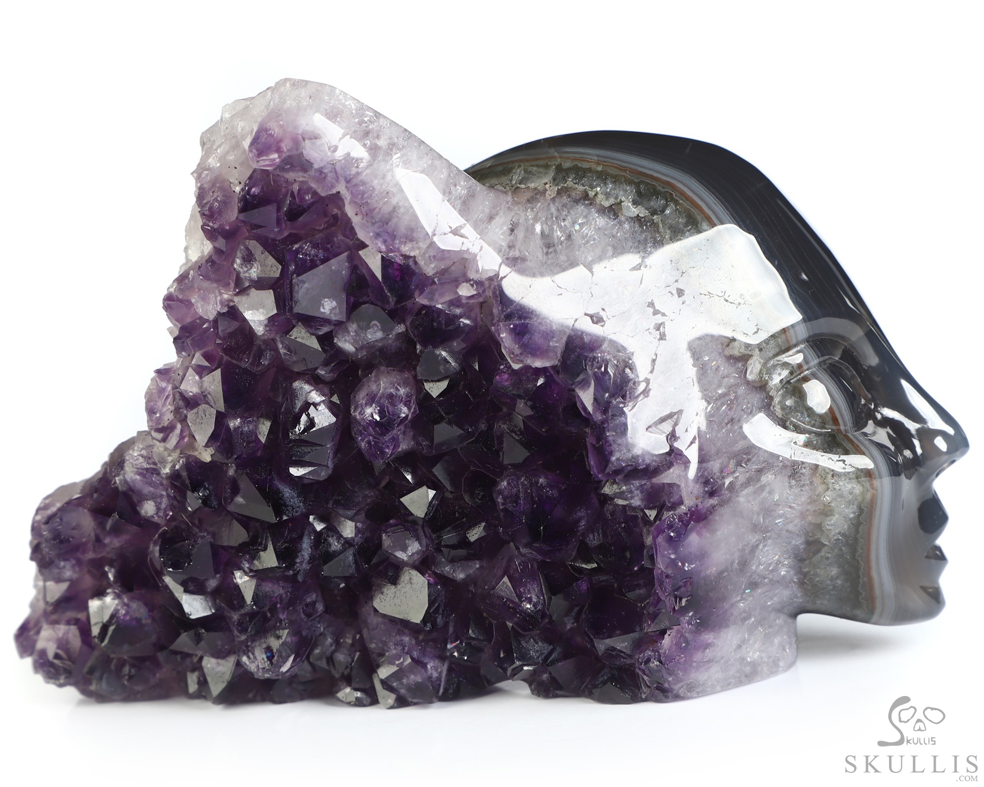 You are looking at an Agate Amethyst Druse skull. The skull is 4.9 inches from front to back.