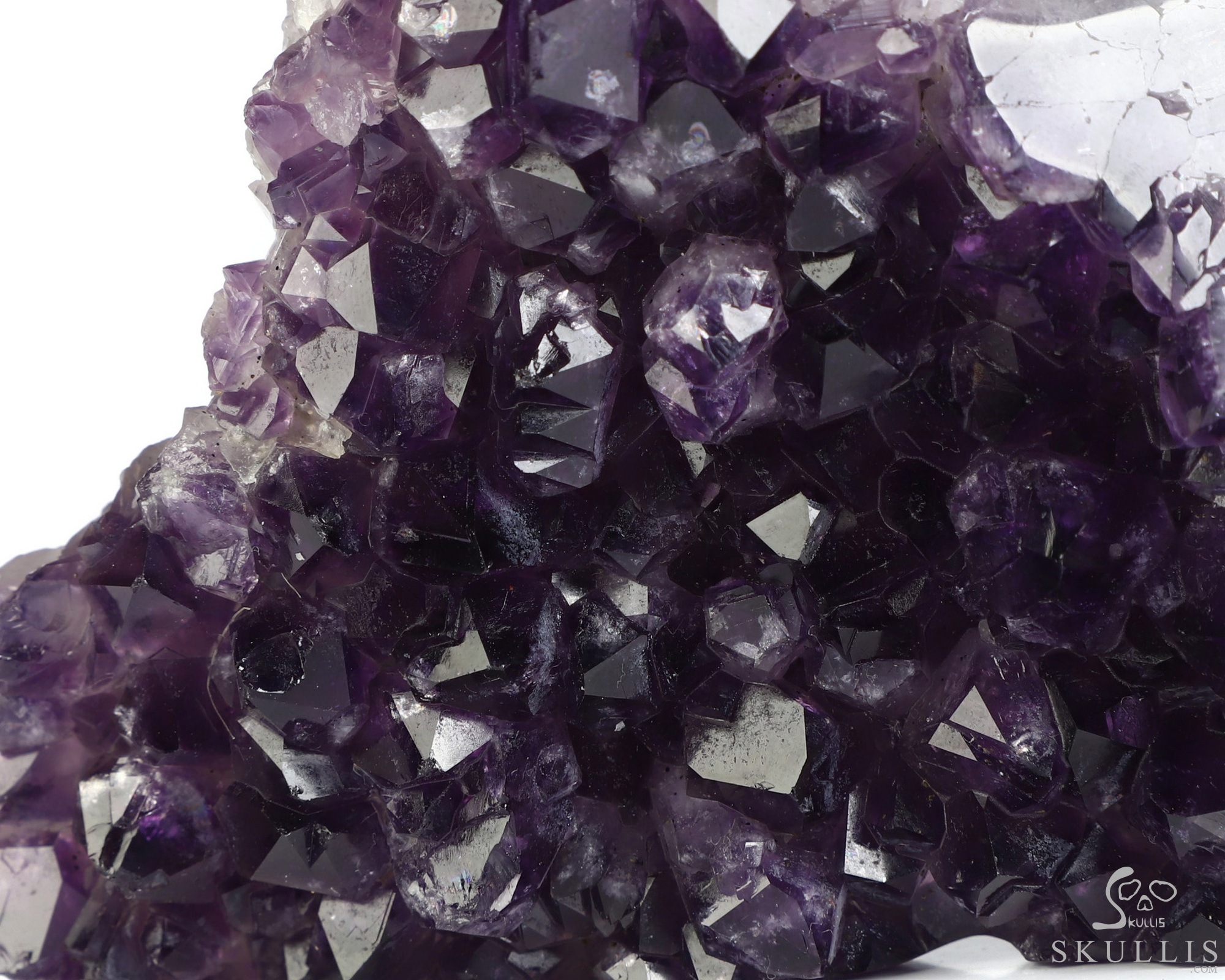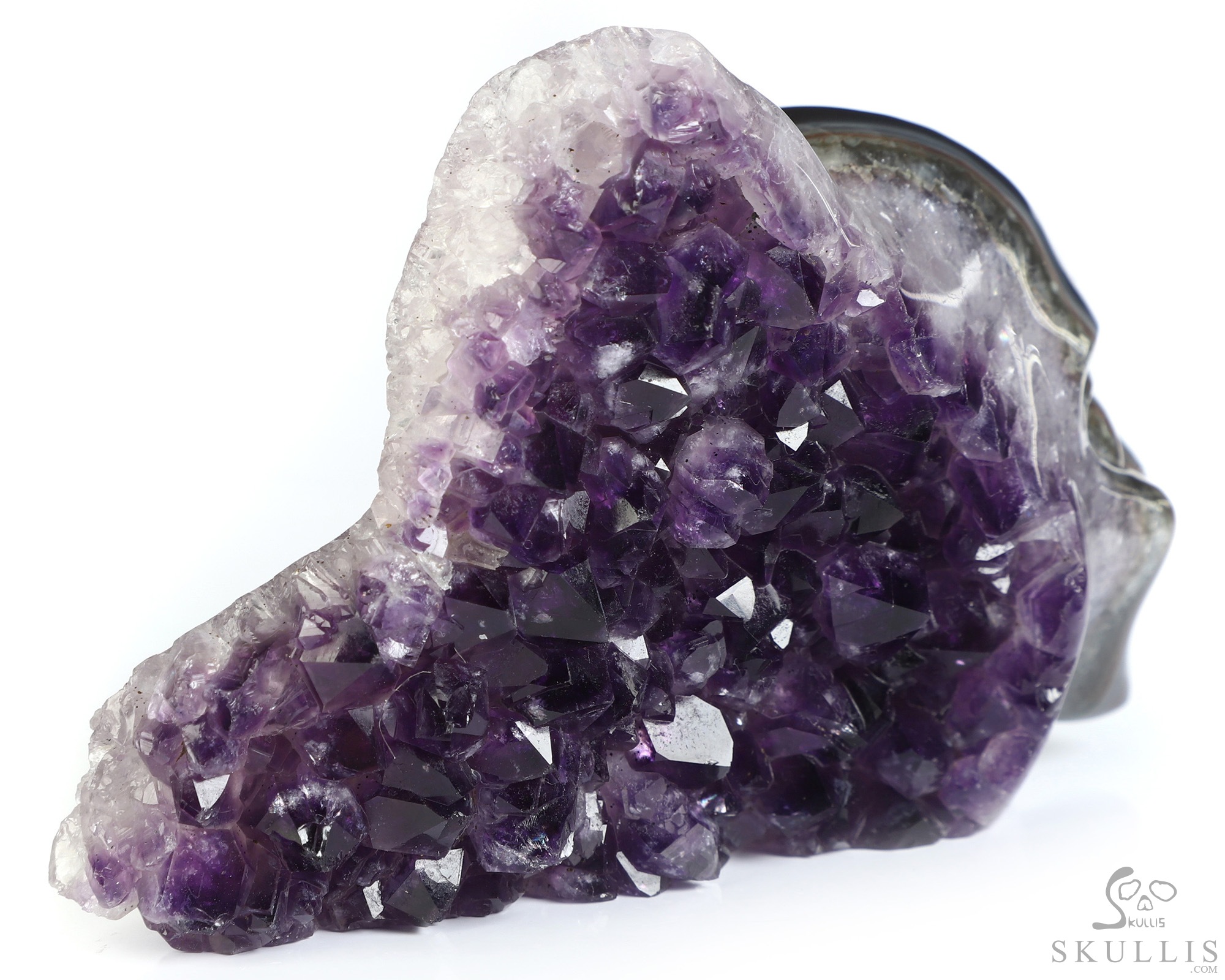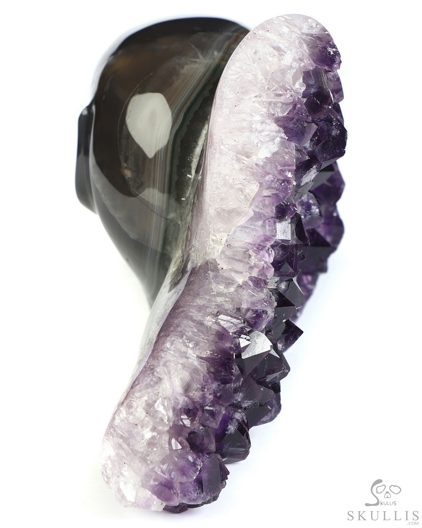 You are looking at an Agate Amethyst Druse skull. The skull is 4.9 inches from front to back.