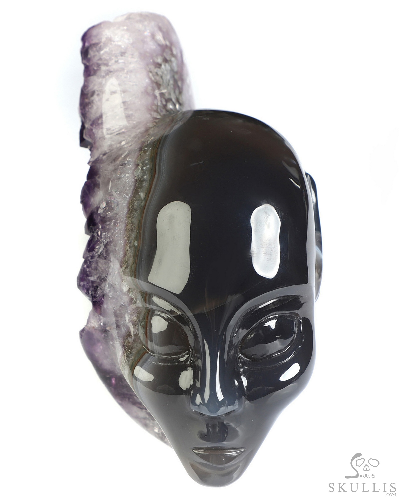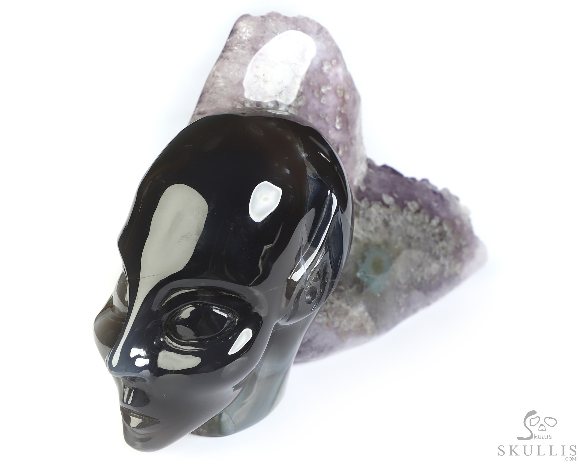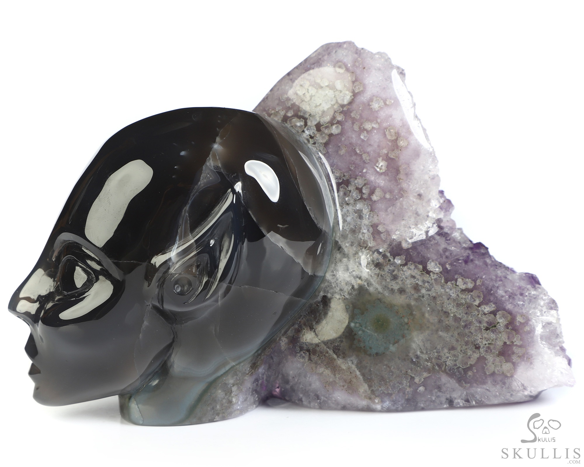 2.1" Agate Amethyst Druse Hand Carved Fairy Elf Alien Crystal Skull Fine Art Sculpture, Crystal Healing