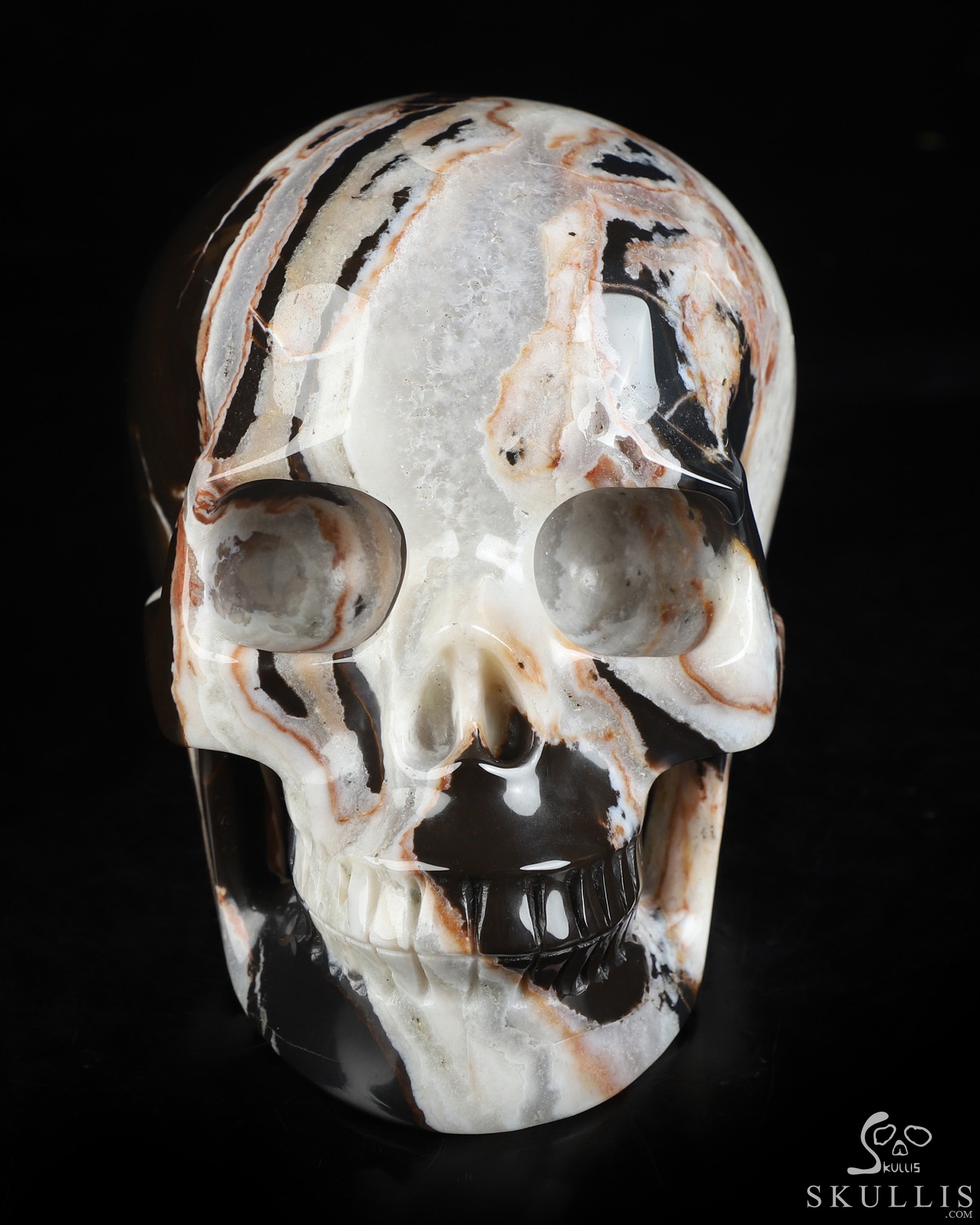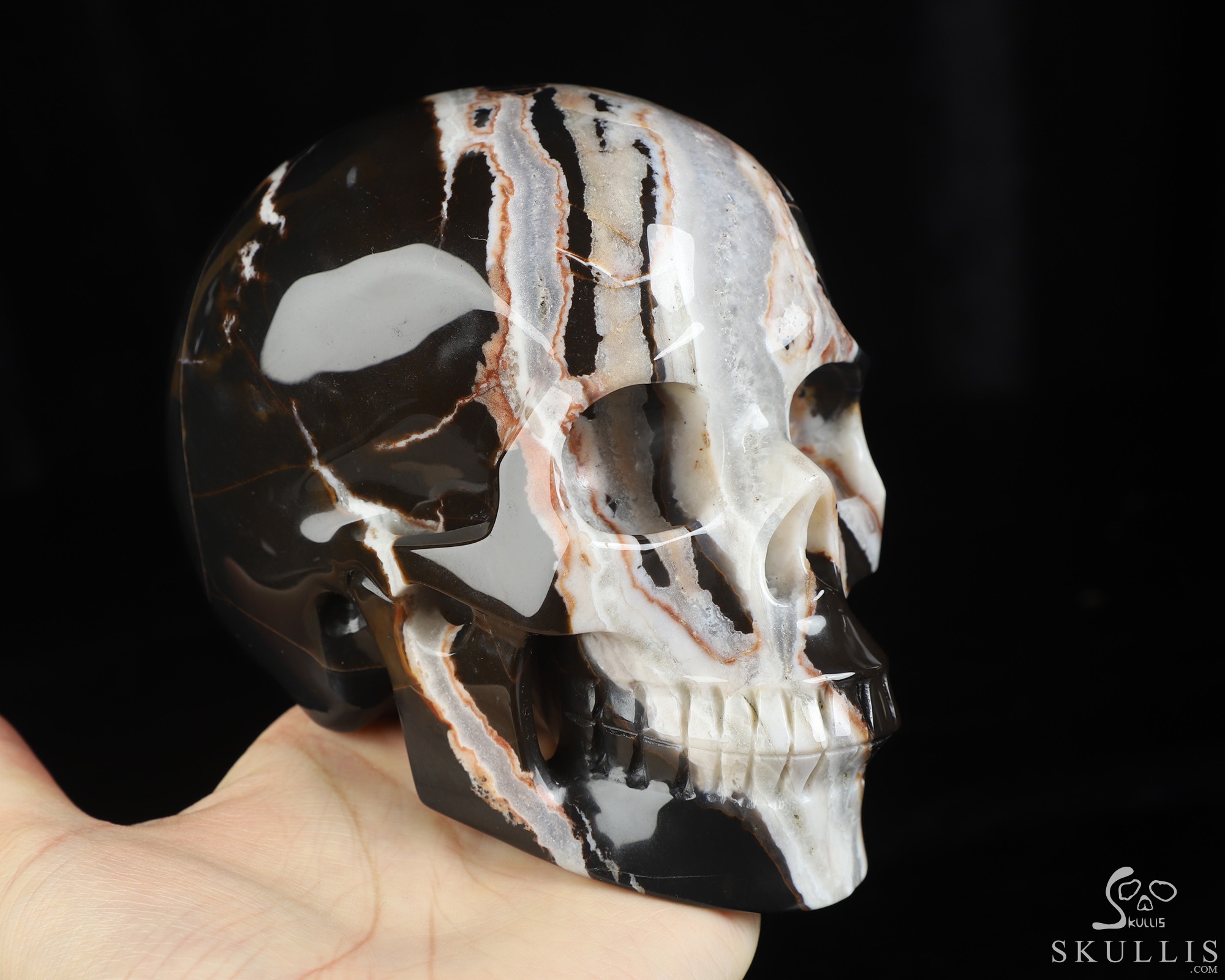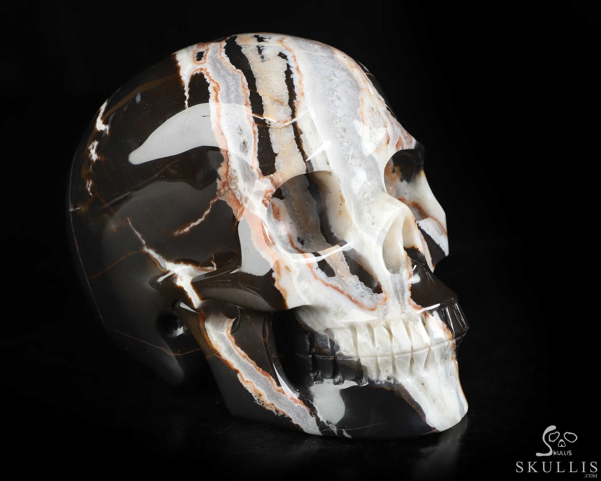 GEODE Lifesized 6.2" Black Zebra Agate Carved Crystal Skull, Super Realistic