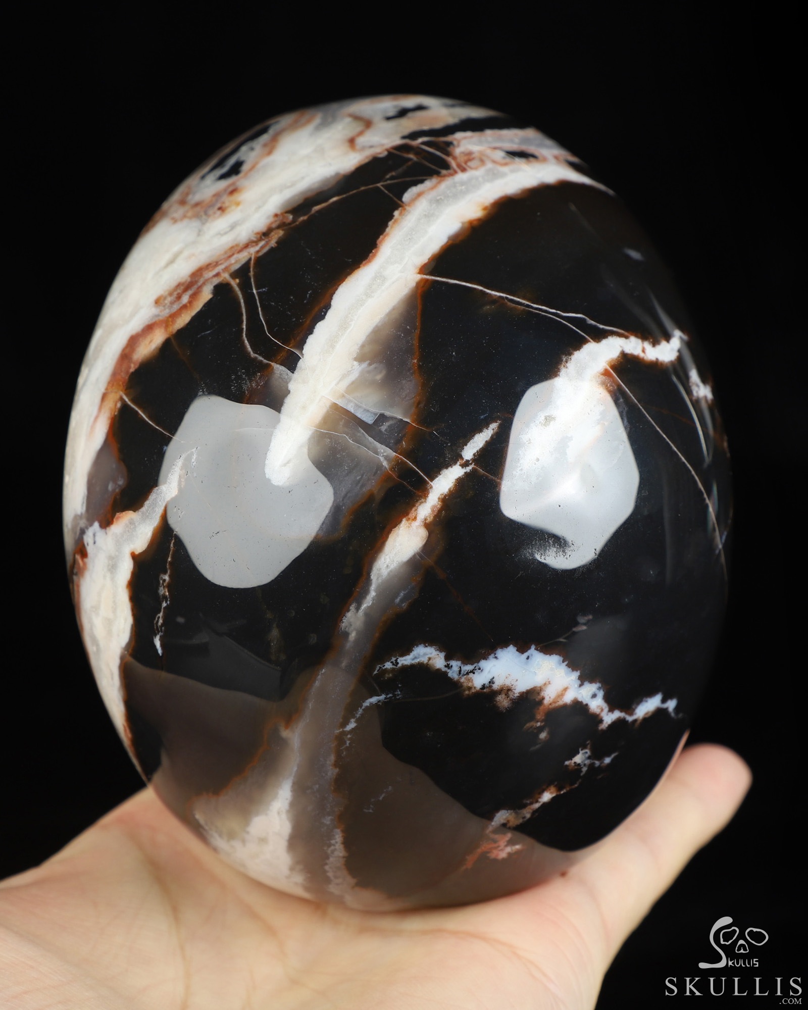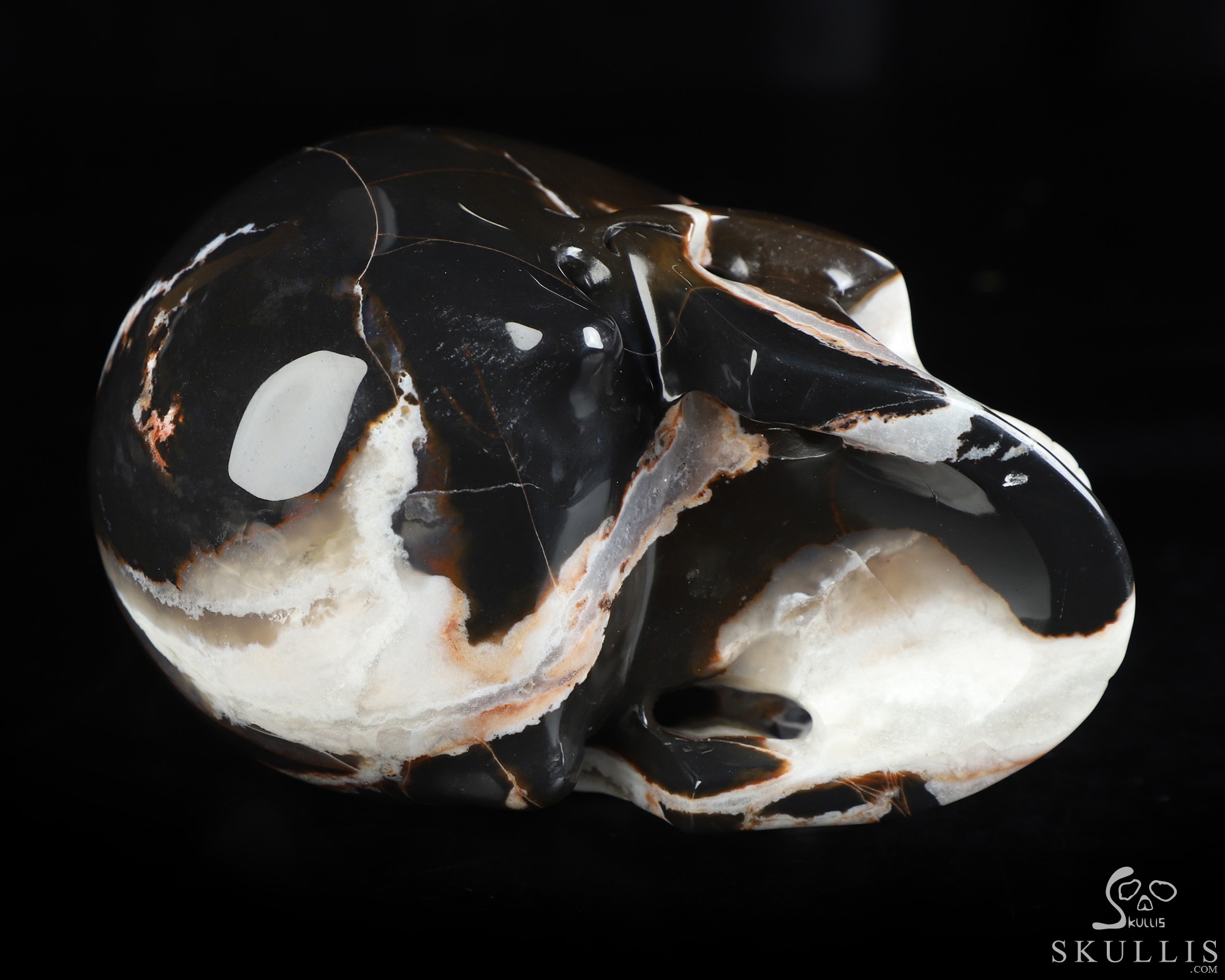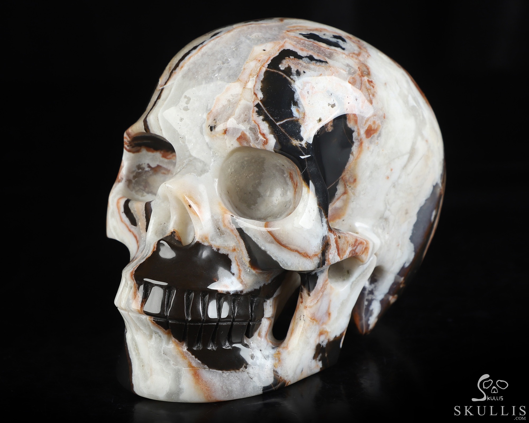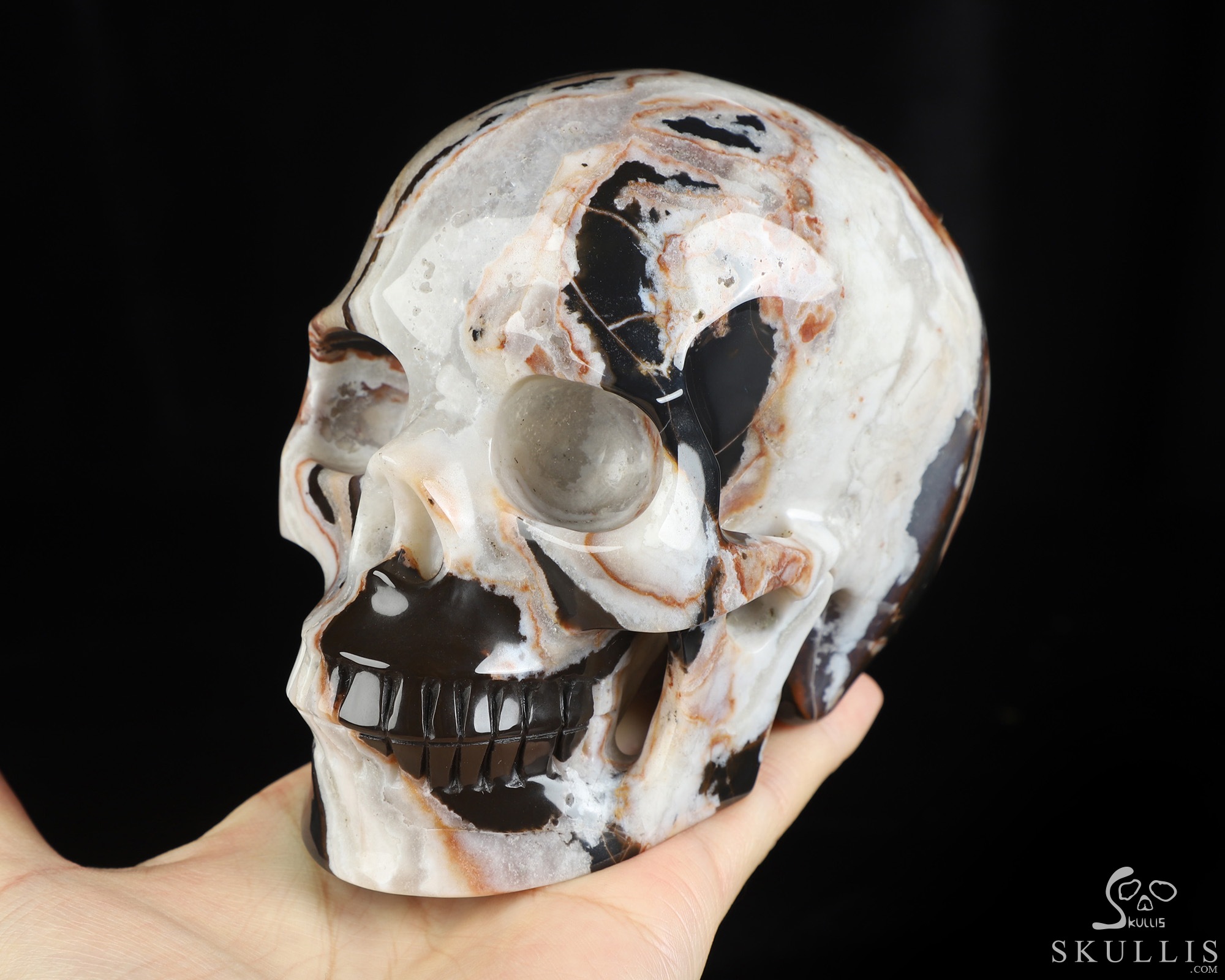 GEODE Lifesized 6.2" Black Zebra Agate Carved Crystal Skull, Super Realistic