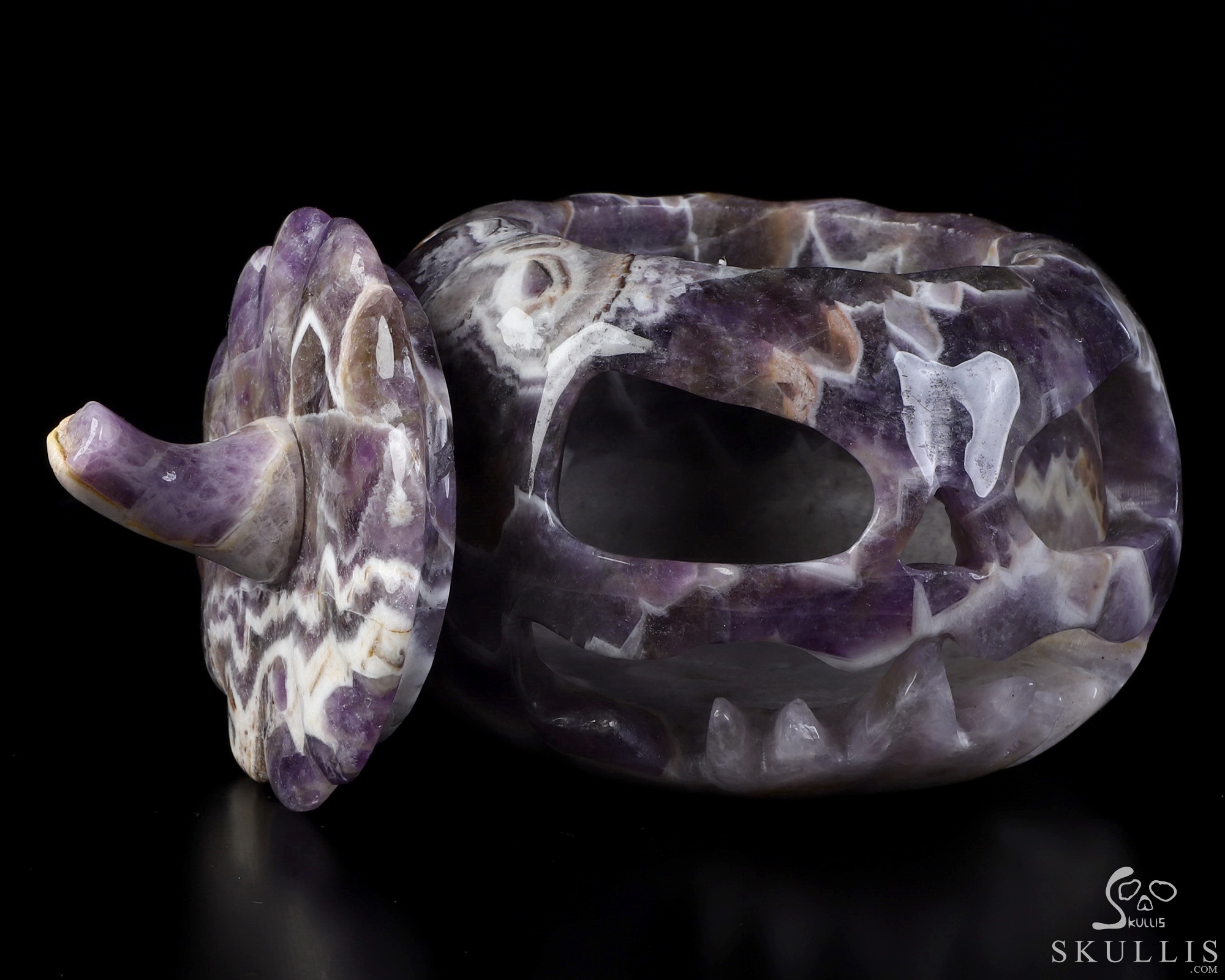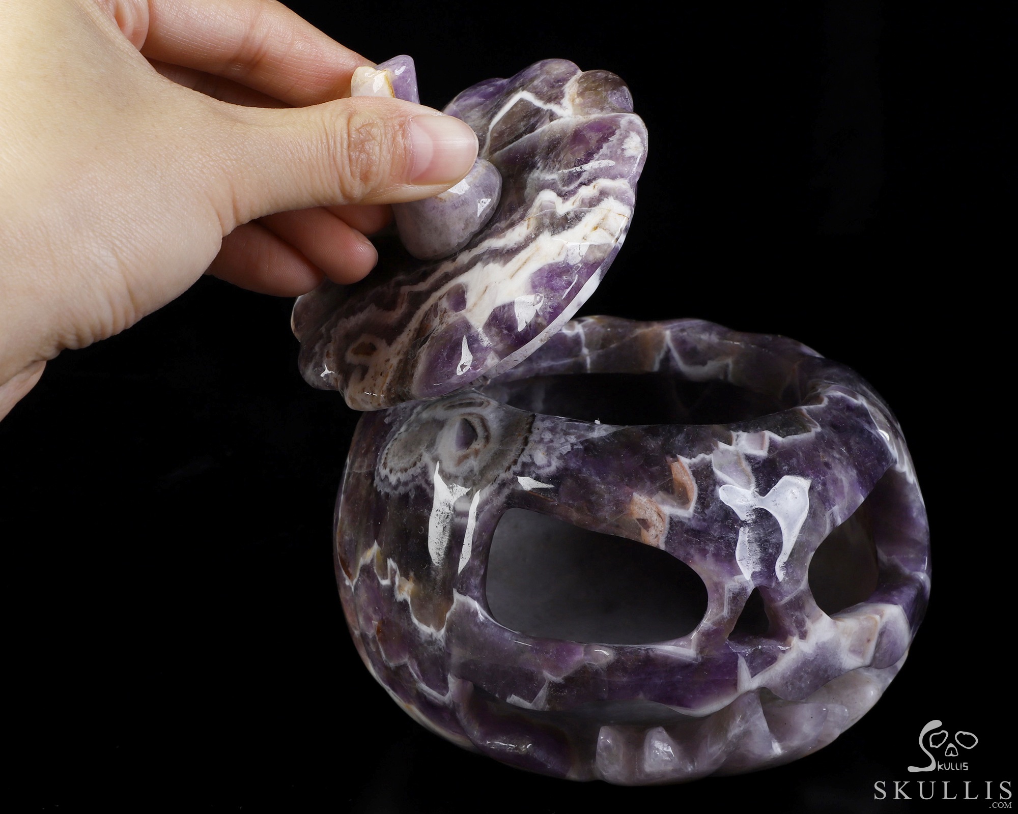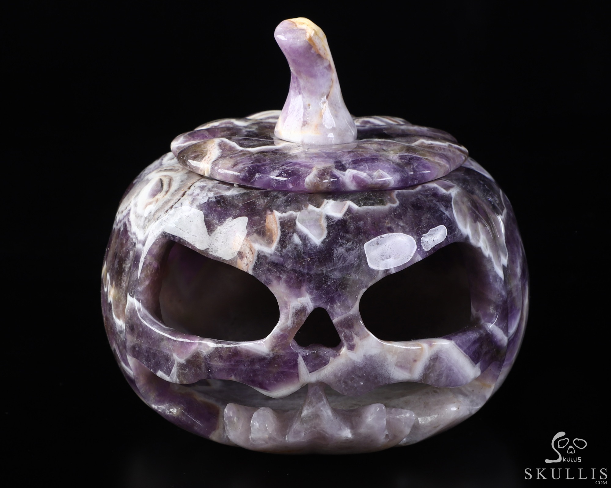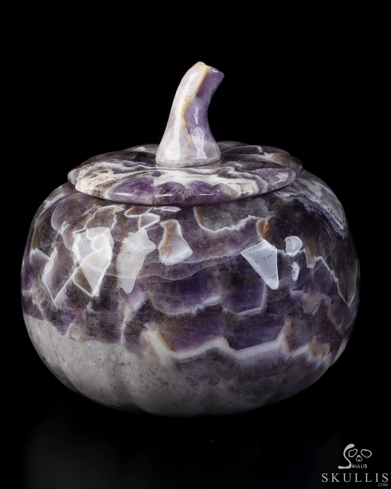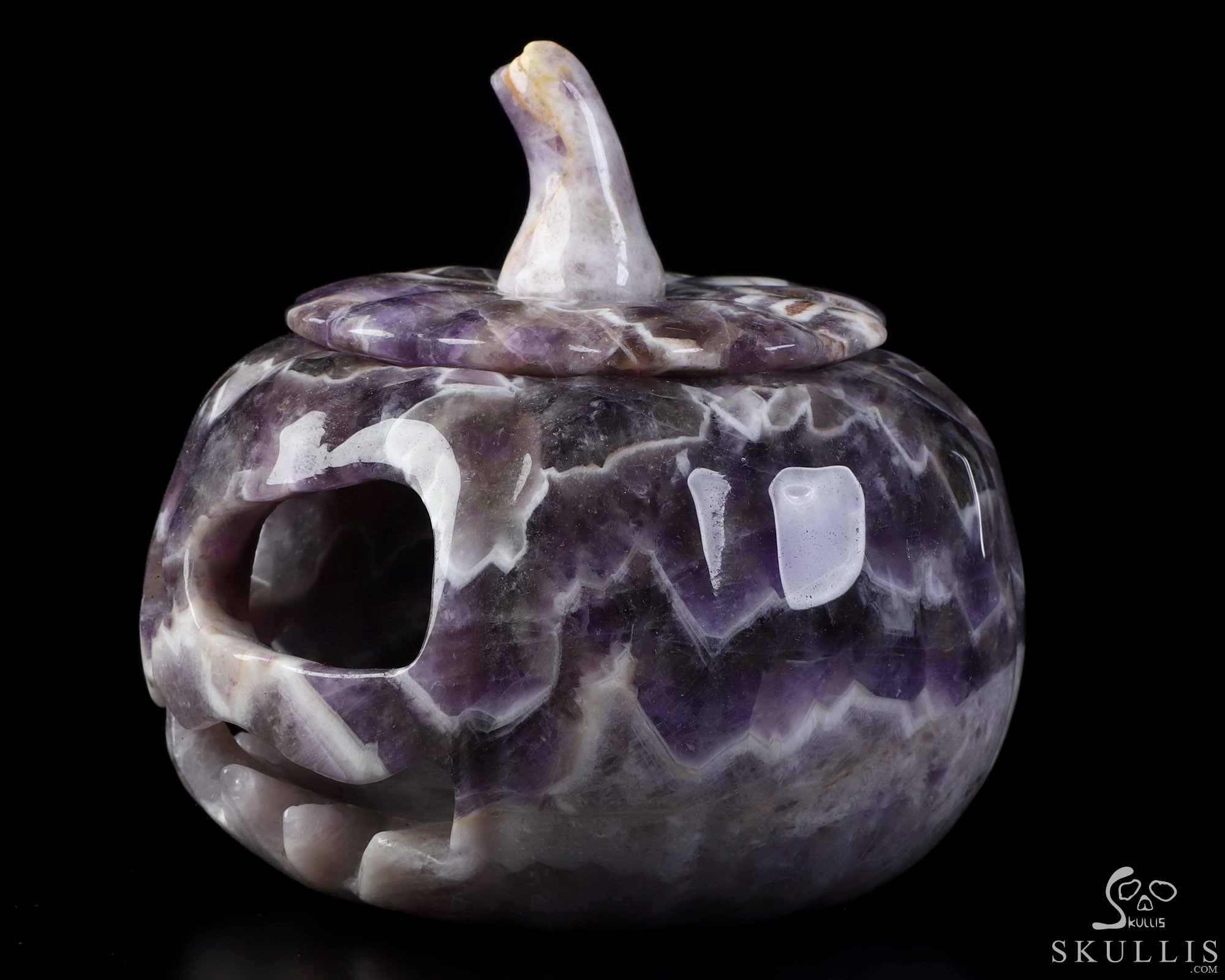 5.0" Dream Chevron Amethyst Hand Carved Hollow Pumpkin Crystal Skull Sculpture, Crystal Healing