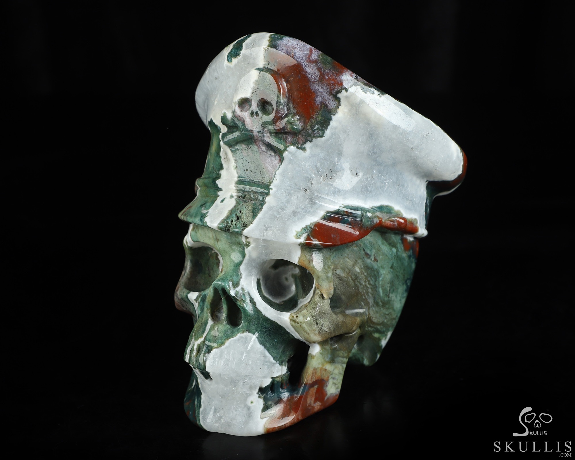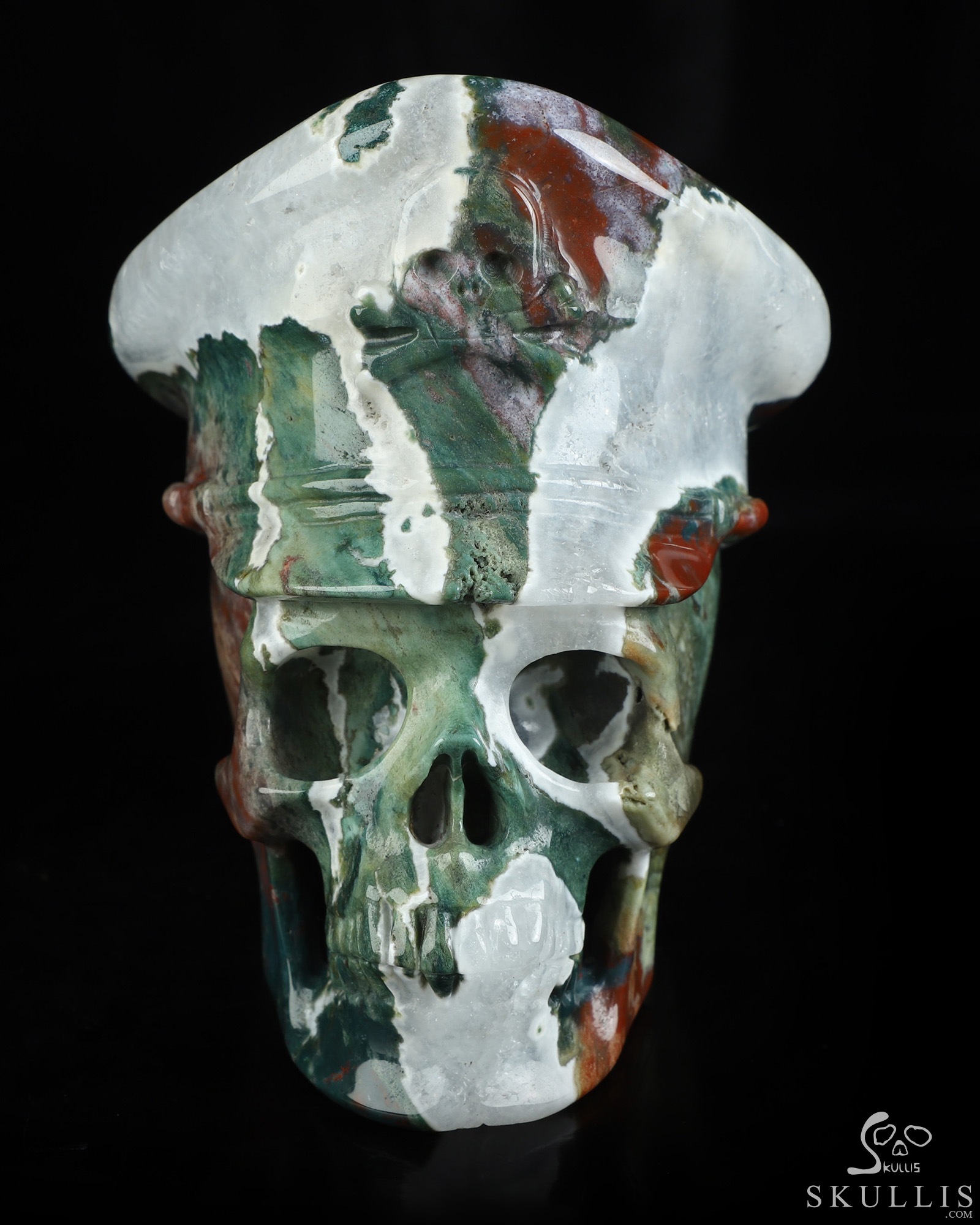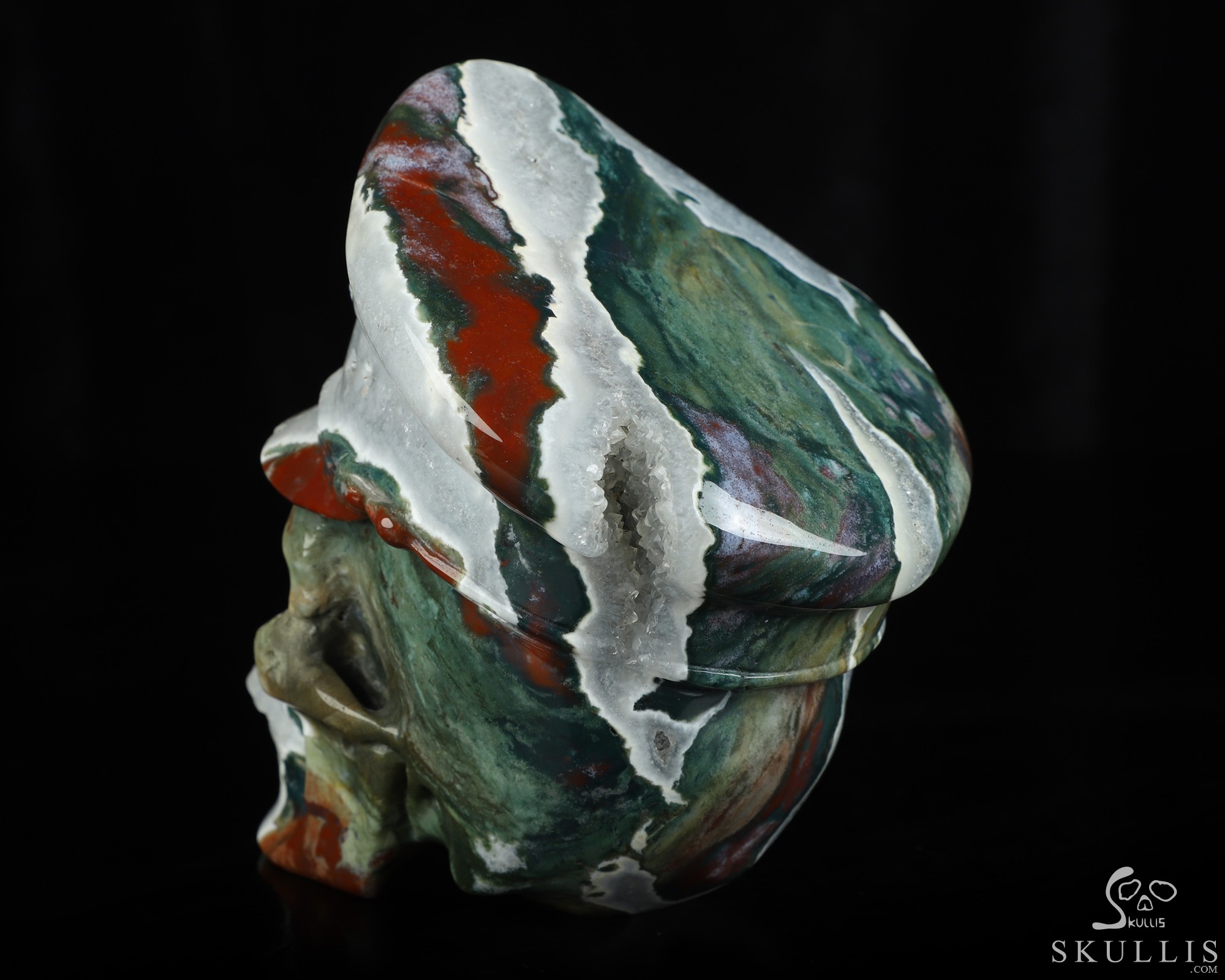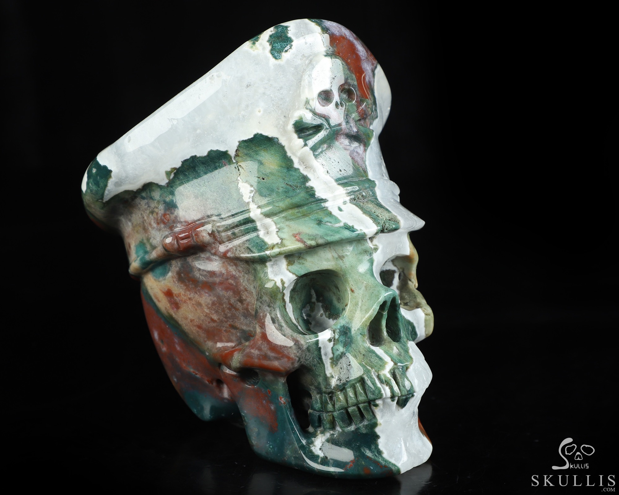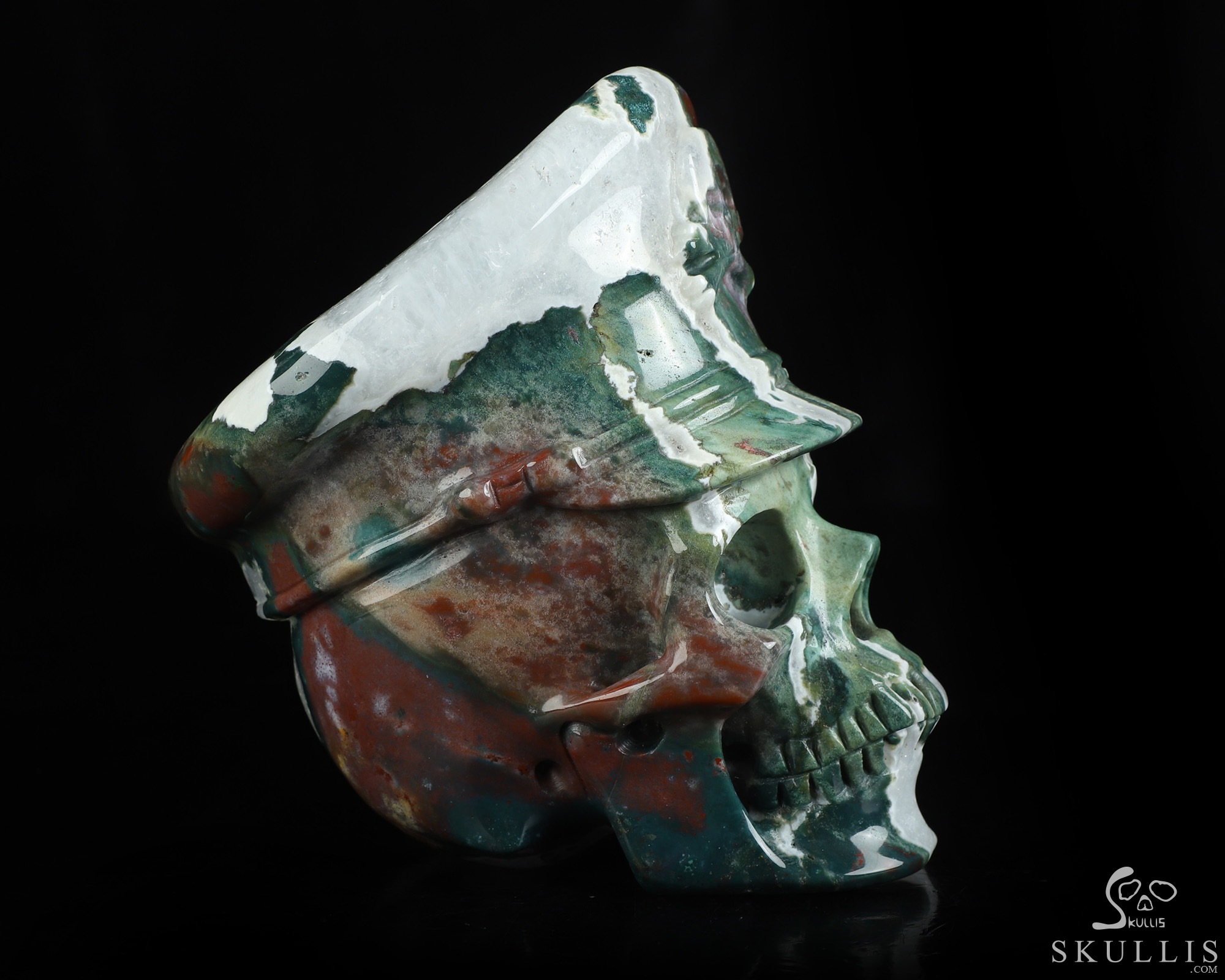 5.0" Green Zebra Agate Hand Carved Crystal Skull and Navy Cap Fine Art Sculpture, Crystal Healing