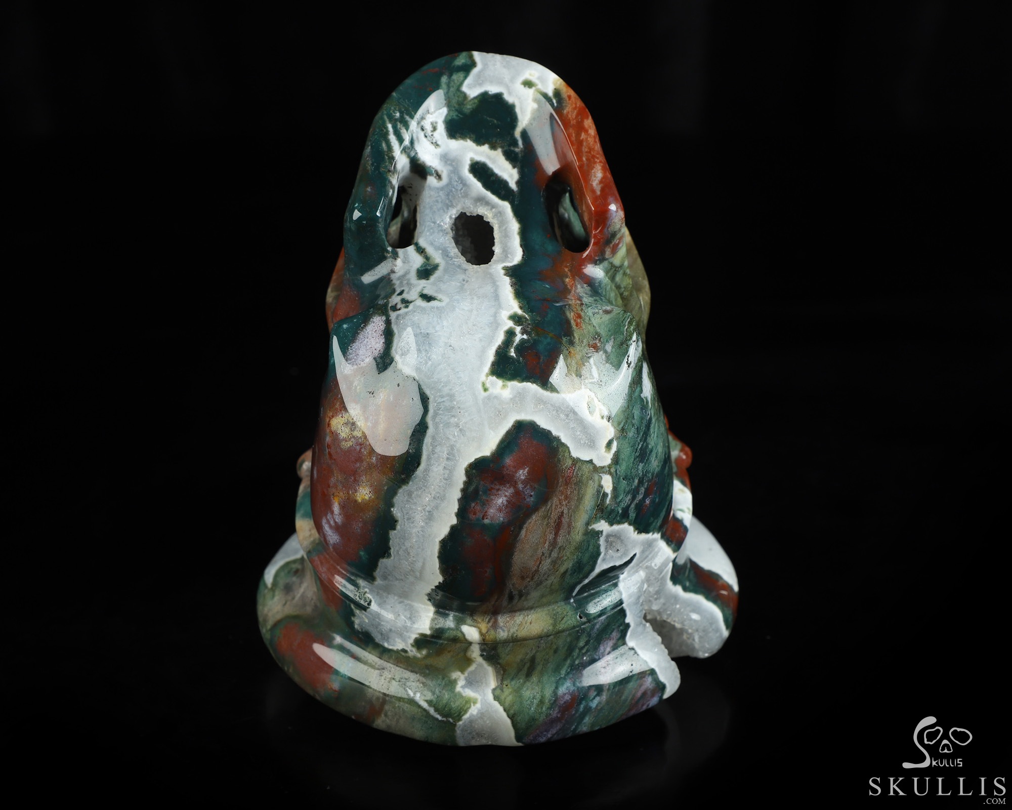 You are looking at a Green Zebra Agate skull. The skull is 5 inches from top to bottom.