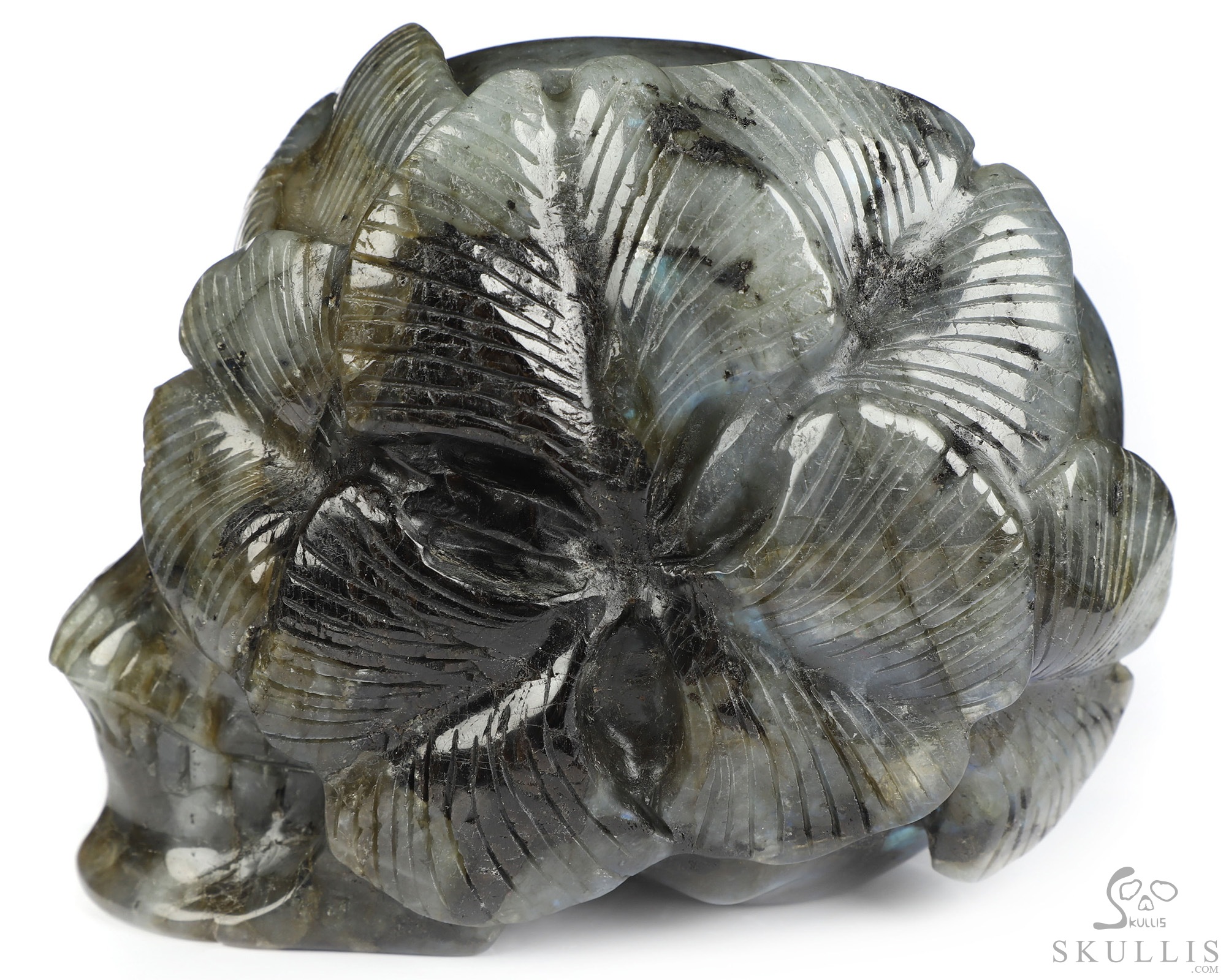 5.0" Labradorite Hand Carved Crystal Skull and Flower Fine Art Sculpture, Crystal Healing