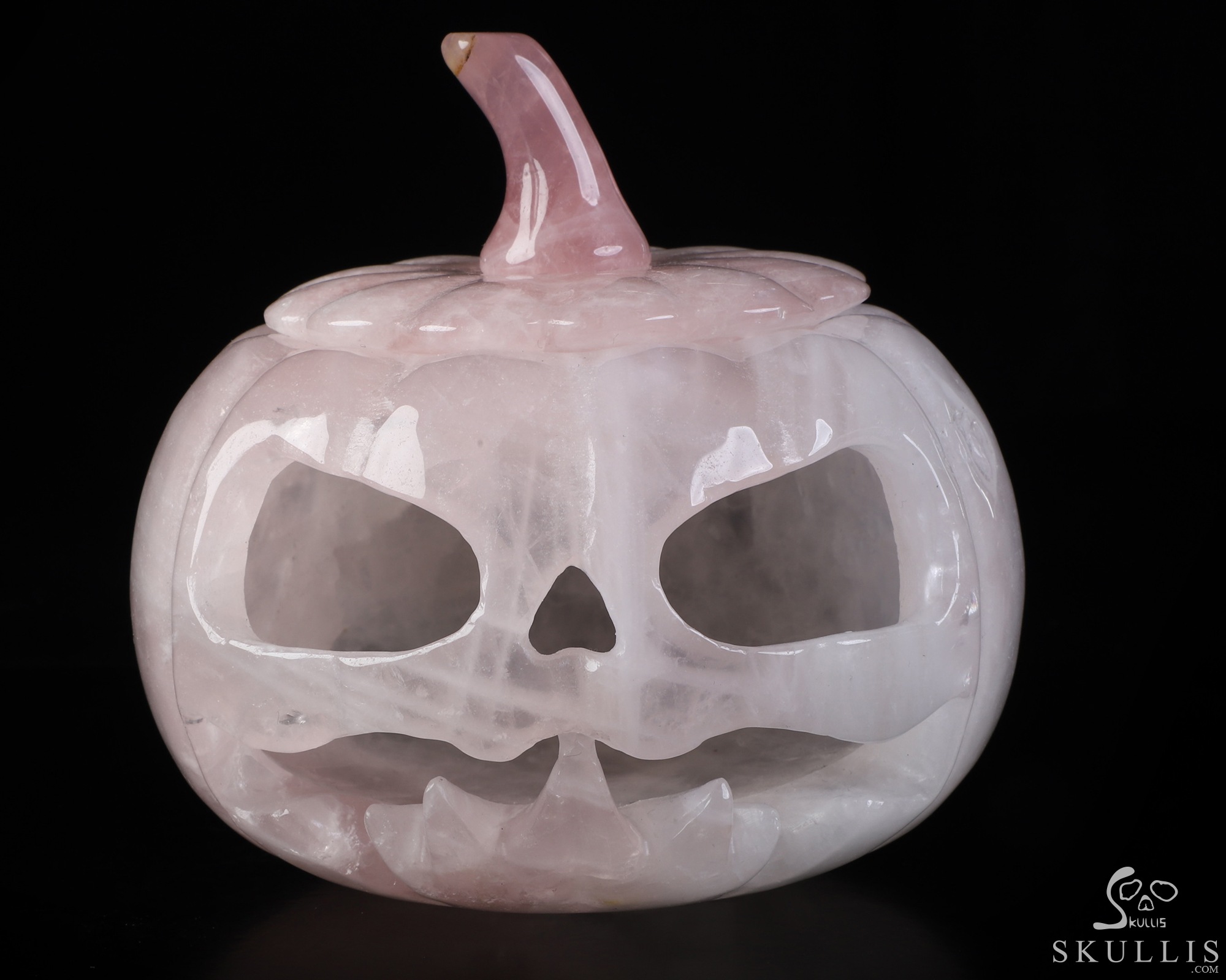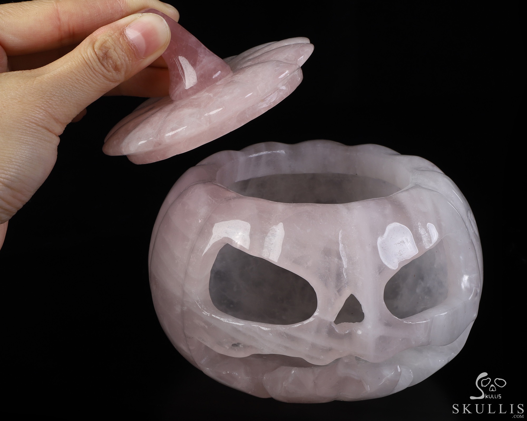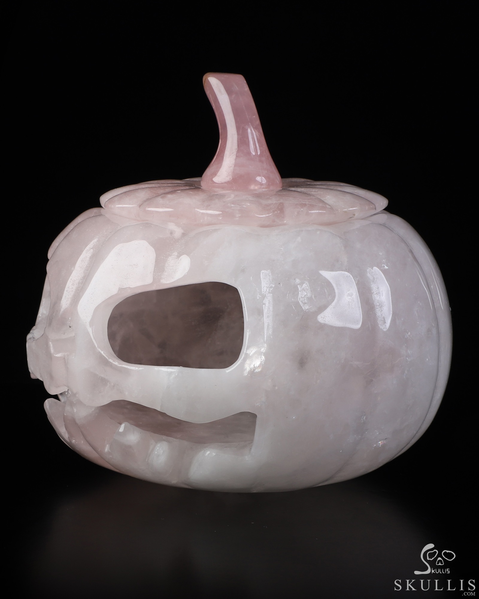 5.0" Rose Quartz Hand Carved Hollow Pumpkin Crystal Skull Sculpture, Crystal Healing
