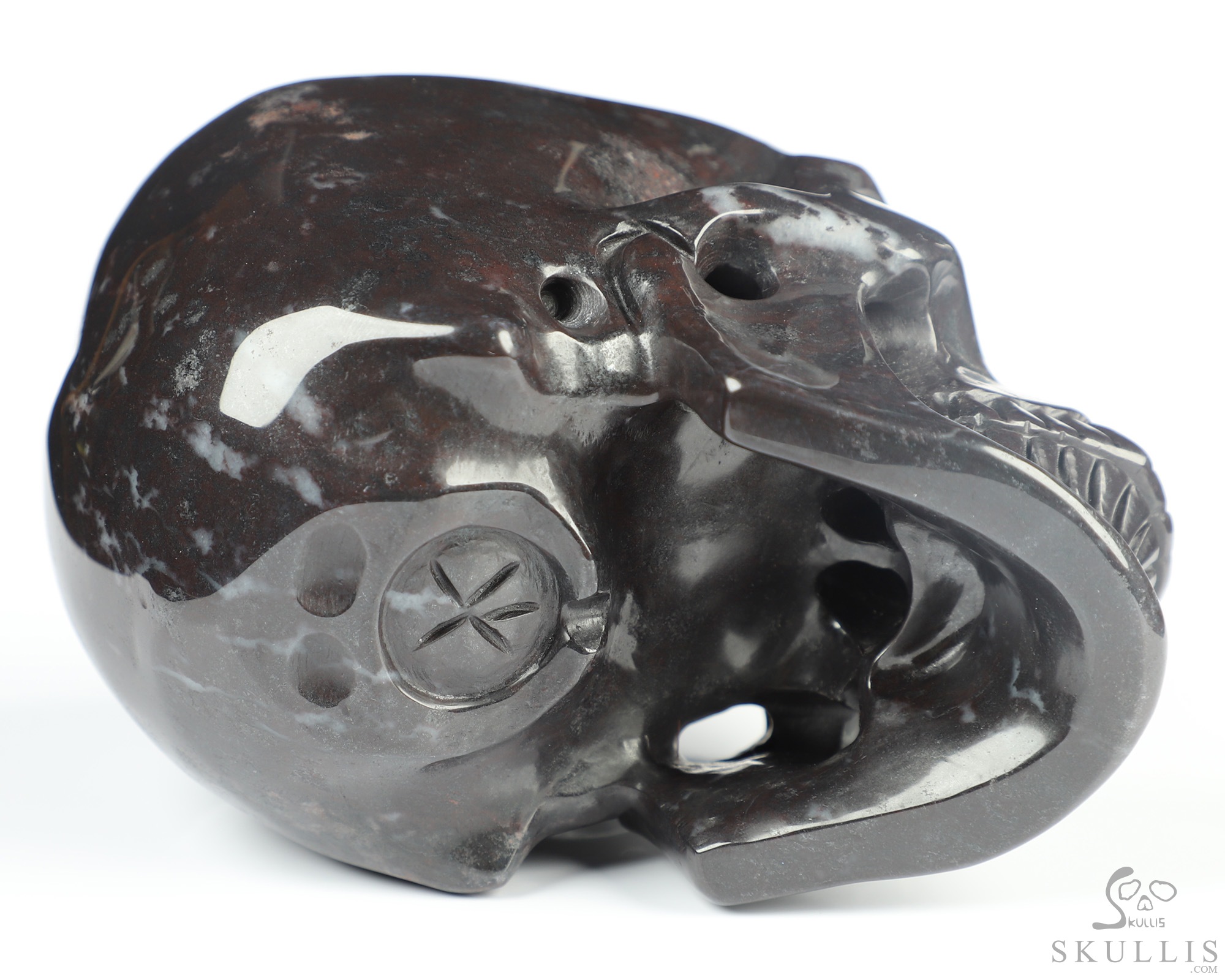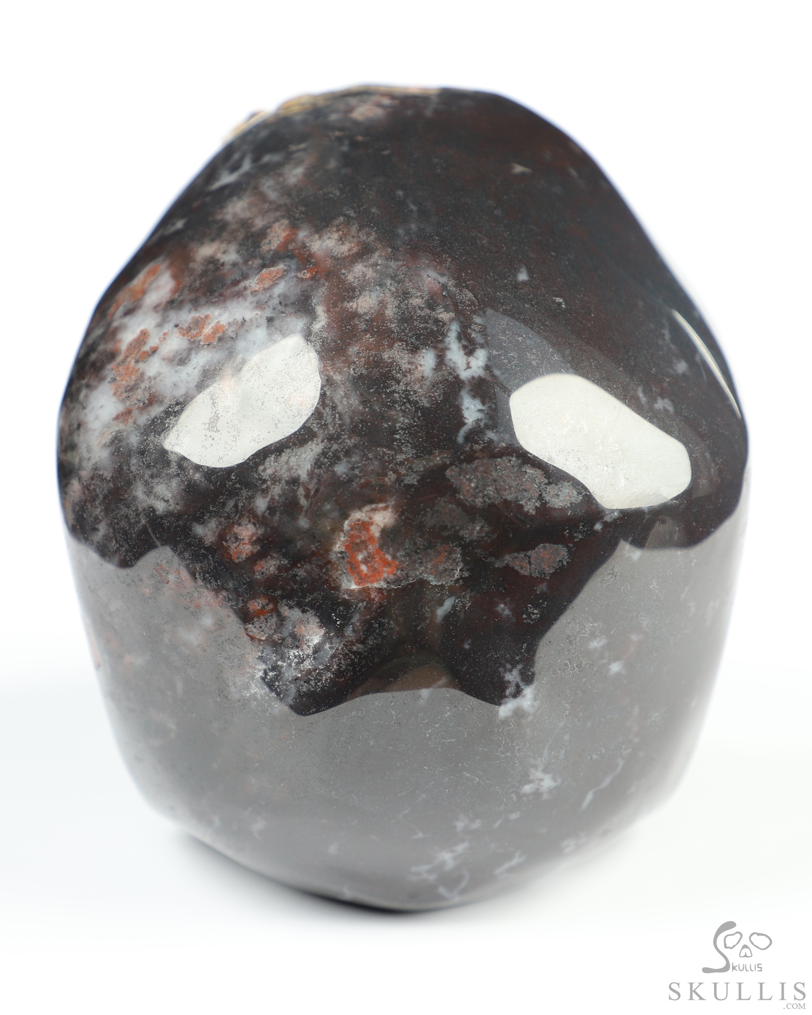 You are looking at a Chinese Bloodstone skull. The skull is 5.1 inches from front to back.