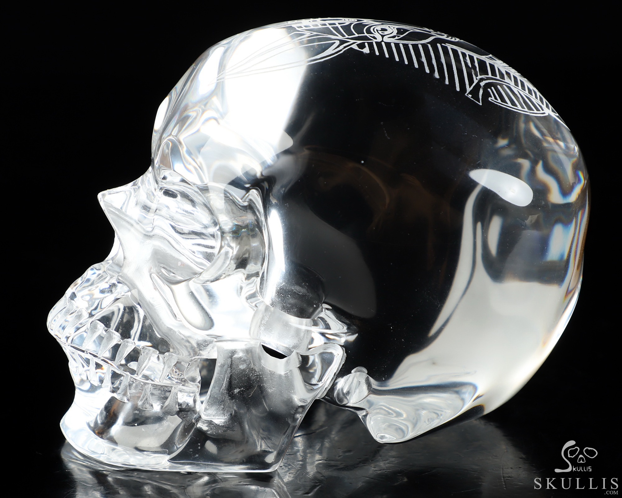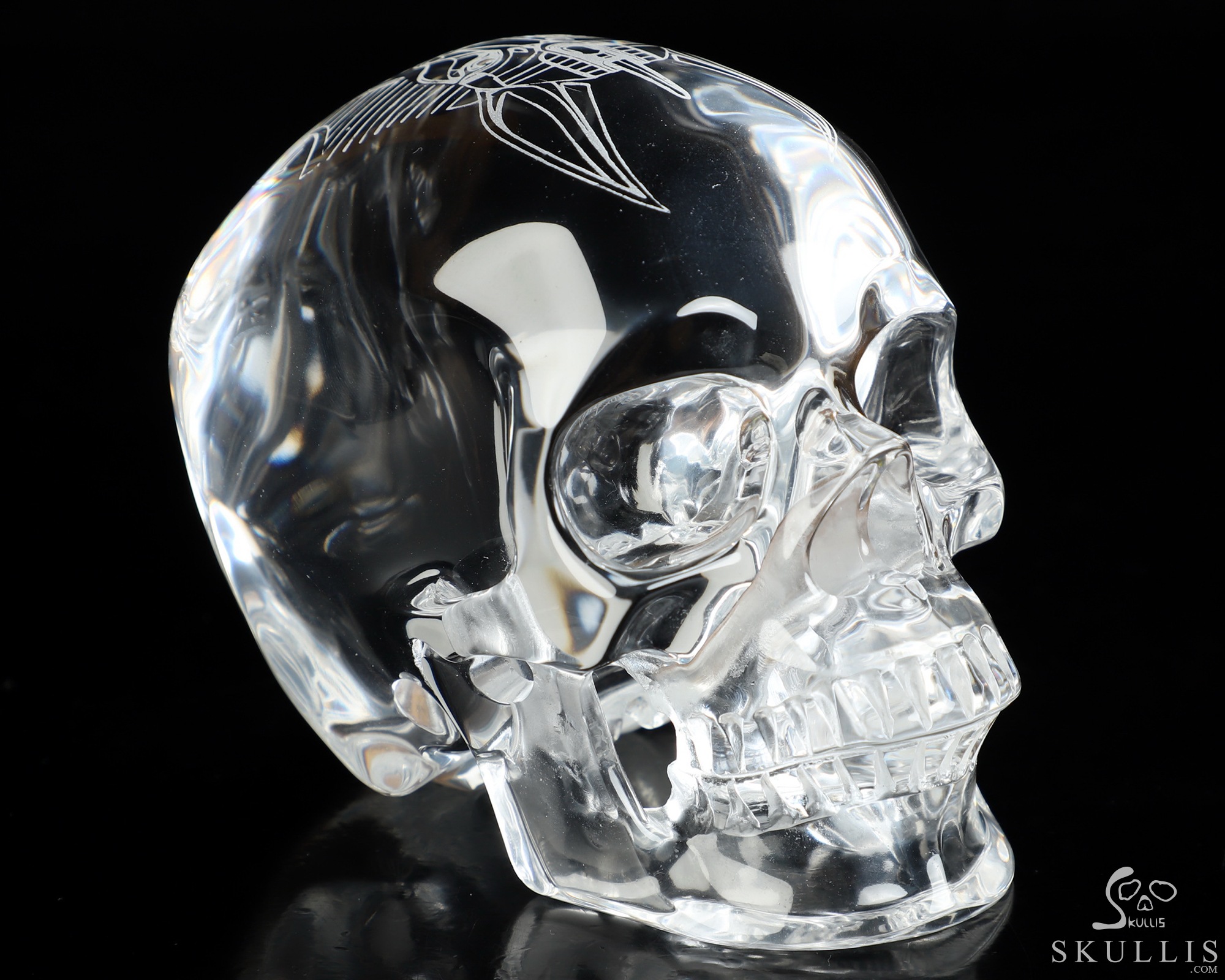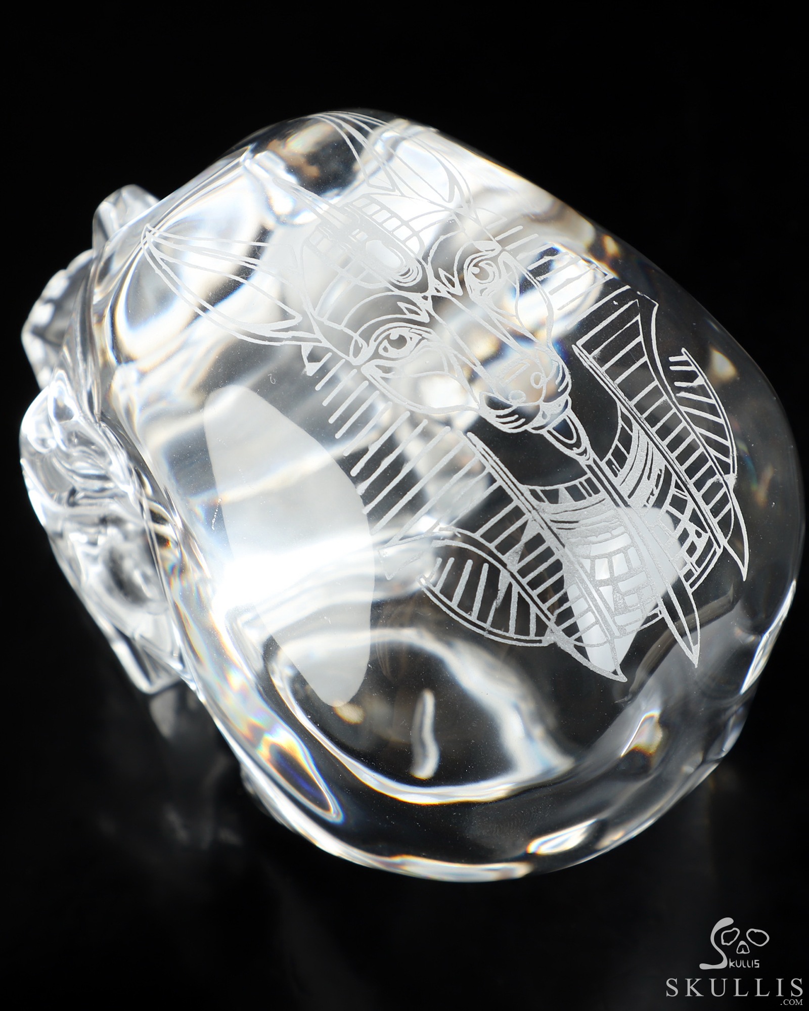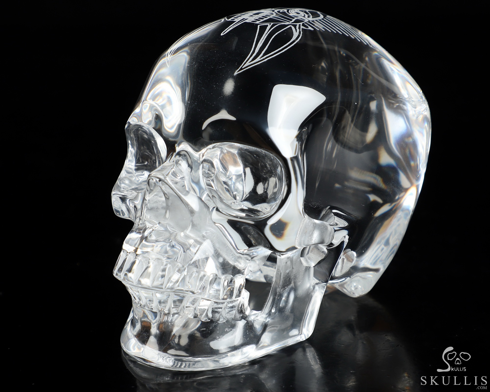 While perfect quartz crystal is nearly impossible to find and remarkably expensive, we've found K9 Crystal to be a great material for carving flawless crystal skulls. K9 Crystal is a borosilicate glass with a high refractive index making it ideal for premium chandeliers and aesthetic lighting. It has excellent clarity and is used for high quality prisms and optical lenses. It is also used for jewelry, decorative hardware, and laser etched art. Like lead crystal, K9 crystal accepts a perfect polish, and with about a 10% lead content it weighs nearly 15% less than some lead crystal. Also like lead crystal, K9 Crystal is not a natural crystalline formation, but a man-made material. Metaphysically, man-made materials can be controversial. Does it have metaphysical properties, or do only naturally occurring materials have beneficial characteristics and energies? Skullis will leave you to decide what works best for you, but we feel all materials have an energetic vibration, and so all materials can be considered useful. Almost every material we handle elicits a feeling from us. It's the difference between a paper cup, a plastic drinking glass, and a glass mug, or between a wooden stick and a metal rod. For example, we manipulate silver and gold to wear as jewelry, but we don't consider these to have lost their energetic properties. Natural or Man-made is a definition of the material, but only you can decide how this material feels and works for you. We encourage an open mind, and remind you that regardless of the material, it is only a tool to help us achieve our inherent potentials! Glass has been described as having a very fast, high frequency energy vibration that allows one to clearly focus one's attention and direct one's thoughts without distraction. Perhaps it would be good to have some grounding crystals on hand as well. Consult the properties of galena and quartz (silicon dioxide) for information about the constituents of K9 crystal. Try meditating with K9 crystal to gain insight and deeper understanding, and to enhance the fine details of your manifestation exercises. Go slow and see how it feels for you; this may be a good material for doing some major work.