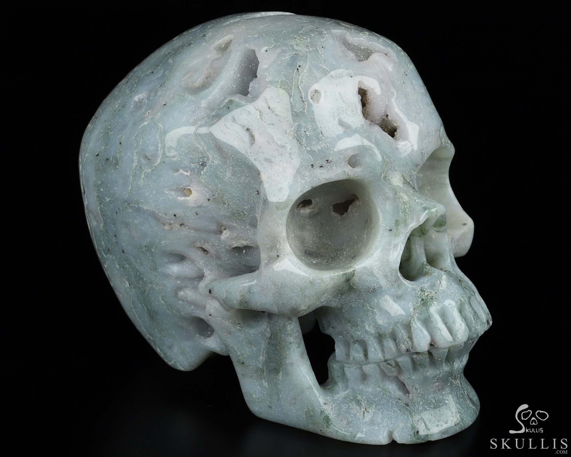 You are looking at a Green Moss Agate skull. The skull is 5.2 inches from front to back.