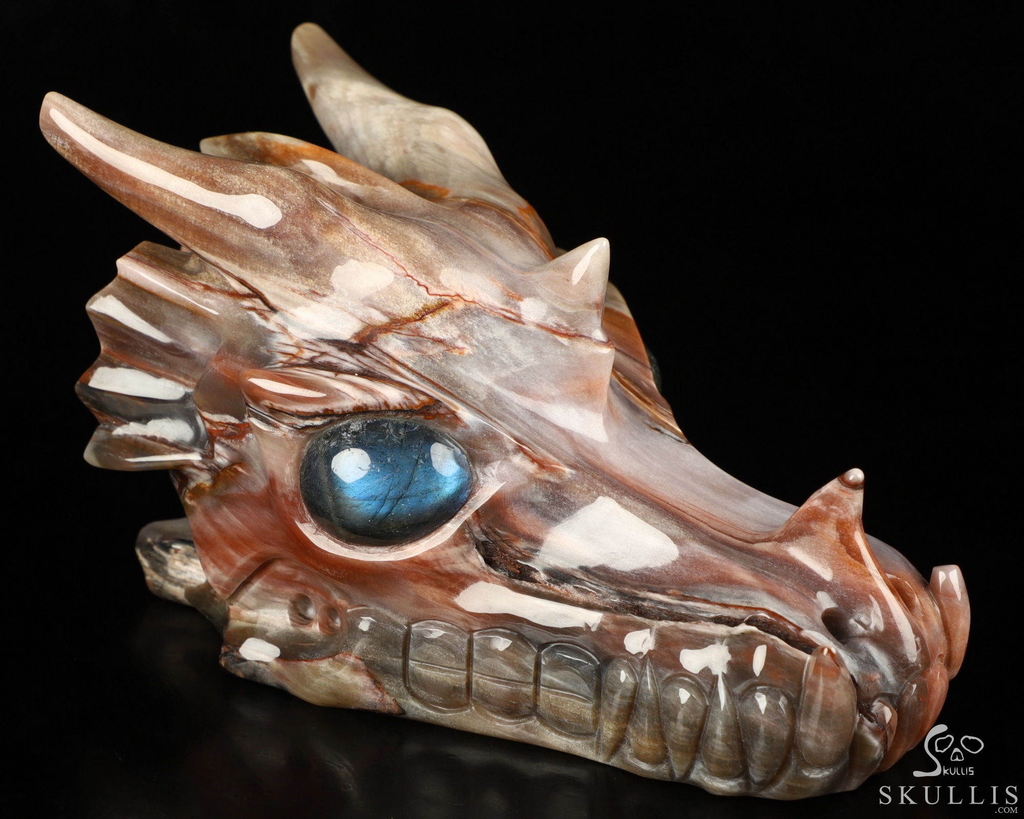 5.2" Petrified Wood Carved Crystal Dragon Head Skull & Labradorite Eyes, Crystal Healing