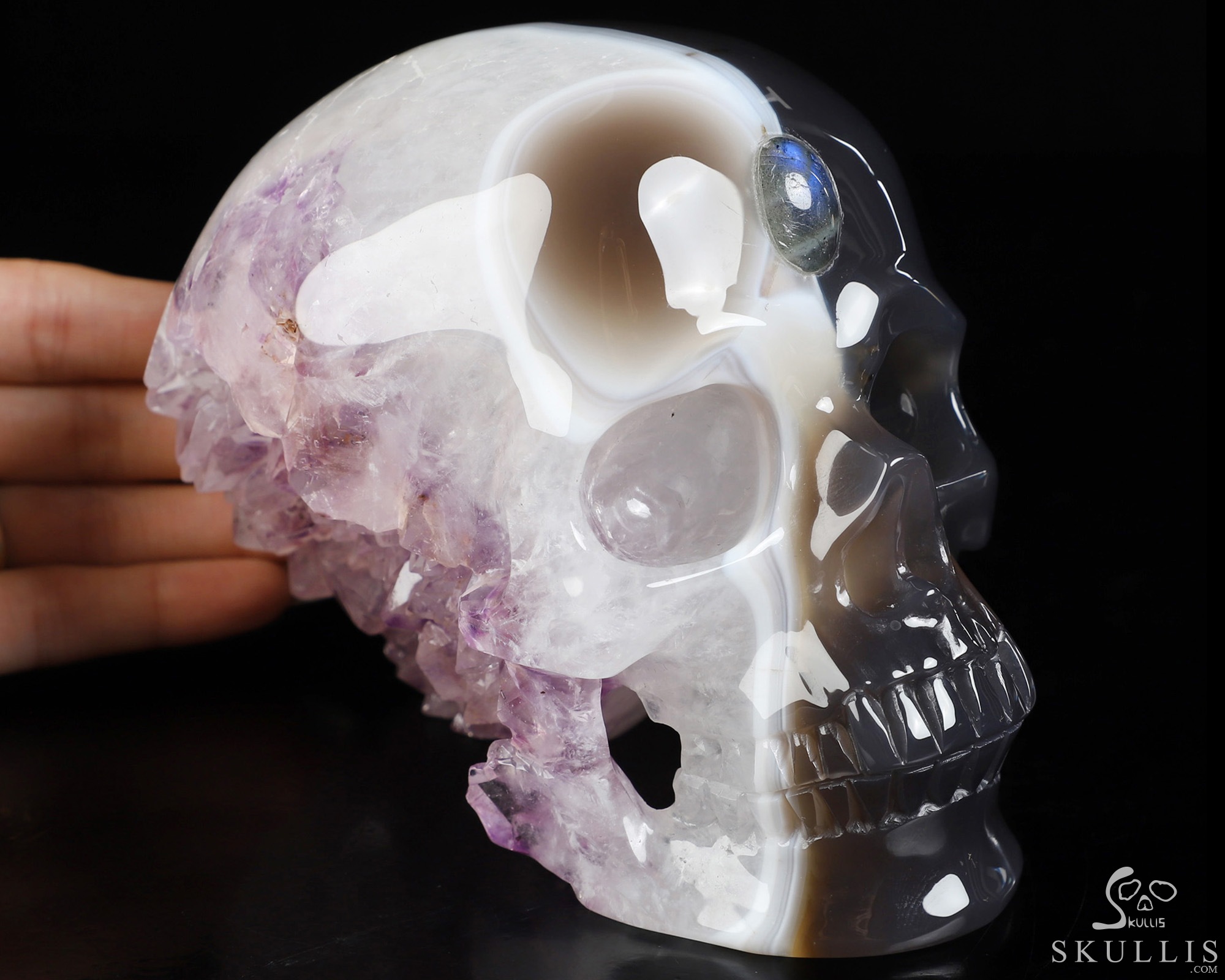 Lifesized 6.8" Agate Amethyst Geode Hand Carved Crystal Skull with Led Stand, Crystal Healing